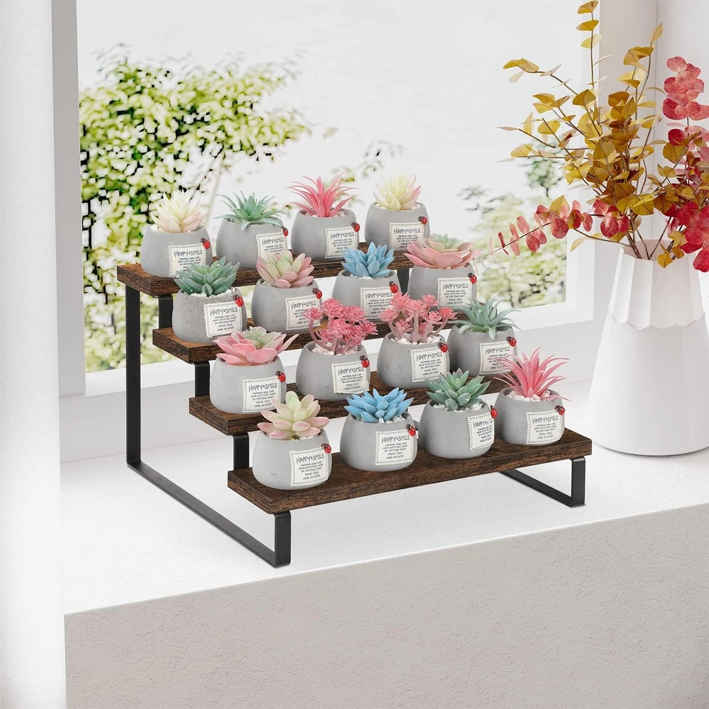 Vintage Appearance: Rustic and aesthetic wood grain that fits perfectly with the black matt paint. Simple and elegant dark brown adds a vintage rustic feel to your home. This rack is suitable for many places in your home. Convenient Design: The stepped design makes efficient use of your counter space. This wooden display riser is a great idea for displaying toy figurines in cabinets, celebrating party desserts, and cosmetics on the dresser. The raised tiers help to create an eye-catching feature for your items. Sturdy Construction: Made of high-quality heavy-duty particle board and supported with iron legs. The thickened iron frame ensures sturdiness and has a stronger bearing capacity. The high-quality particle board (thickness of 0.6 inches) provides a flat & smooth surface that can efficiently resist the corruption from water and is easy to be cleaned. Multifunctional Usage: It can be used for figures, dolls collection, and decorations in the living room; Used for nail polish, perfume, and makeup on the dresser; Used for condiments, spices, cans, coffee, and tea in the kitchen. No exaggeration, it can be applied to any corner of the house. Quick Setup & Easy Cleaning: You can have this 4-tier display riser stand assembled in 10 minutes with detailed instructions and tools. The wooden surface is waterproof and dust-free, a damp cloth could keep the counter shelf clean. (Assembly tools and accessories are included in the package)