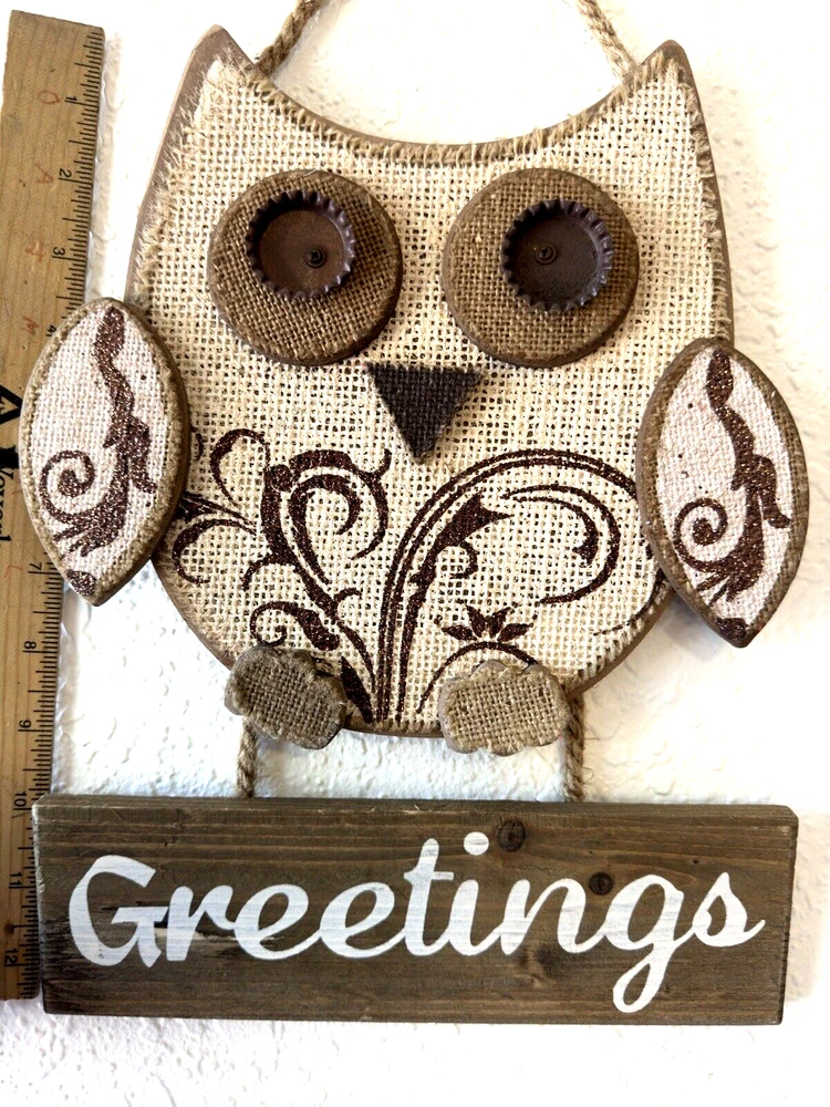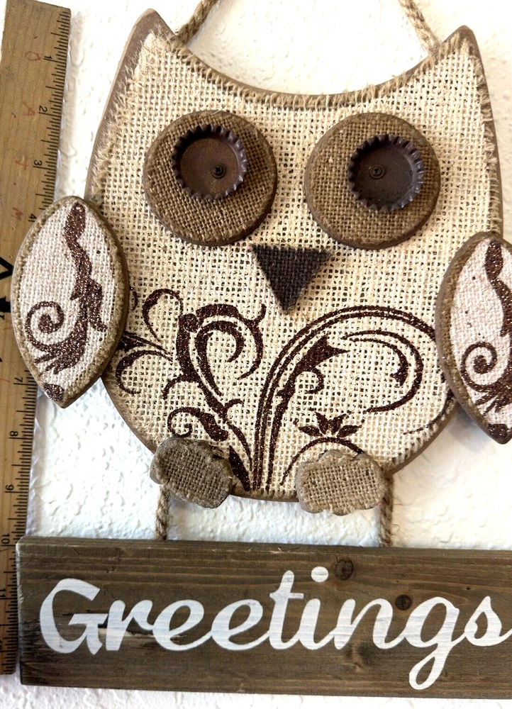 Wooden Welcome sign “Greetings” with owl decor. Floral glitter design, painted bottle cap eyes, 3D wood plaque