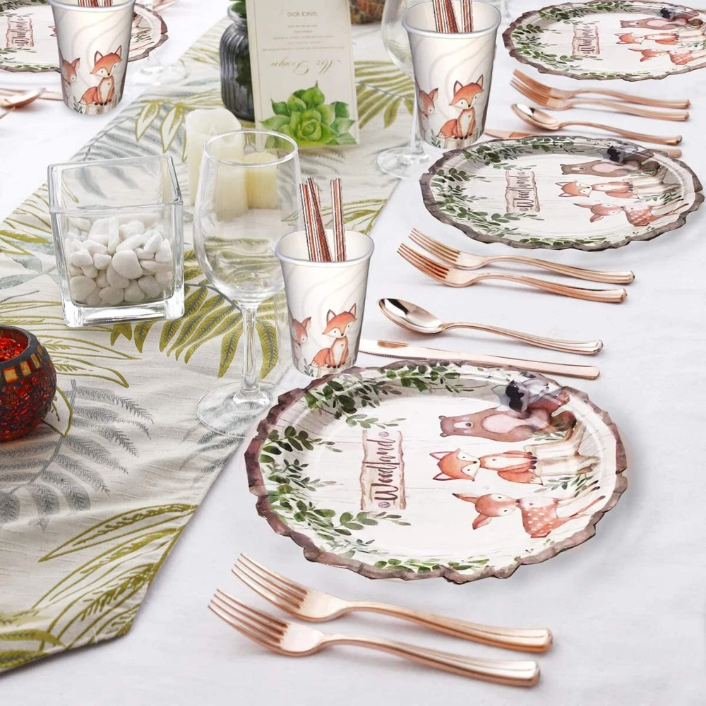 SERVE 32: This woodland creatures party decorations includes : 32 9"dinner plates + 32 7" dessert plates + 32 9oz paper cups + 32 napkins, can serves 32 guests. BIODEGRADABLE & DURABLE: Woodland creatures party supplies made of 100% food grade material BPA-free, no-toxic, biodegradable, eco-friendly, recyclable, heavy duty (350g white paperboard, thick and sturdy) won't folded, teared or broken easily, assuring paper plates party supplies set. HOLO PARTIES: The woodland creatures party decorations perfect for baby shower and animal theme birthday party. You can count on our decorative plate napkins and cup to add more elegance to your dinner table. DISPOSABLE EASY TO CLEAN: You can simply throw these out when making cleaning up after party and won't cause a environmental pollution. Save time and effortless. Let's spend more time with our family or friends. (NOTE: Do not microwave plates please.) SPLENDID SIZE FOR DINING:The woodland party supplies dinner plates measure 9” round and dessert plates measure 7" round with animal design. Paper cups hold approximately 9 oz of liquid. Napkins are 3-layer and measure 13 x 13 inches when unfolded and 6.5 x 6.5 inches folded.