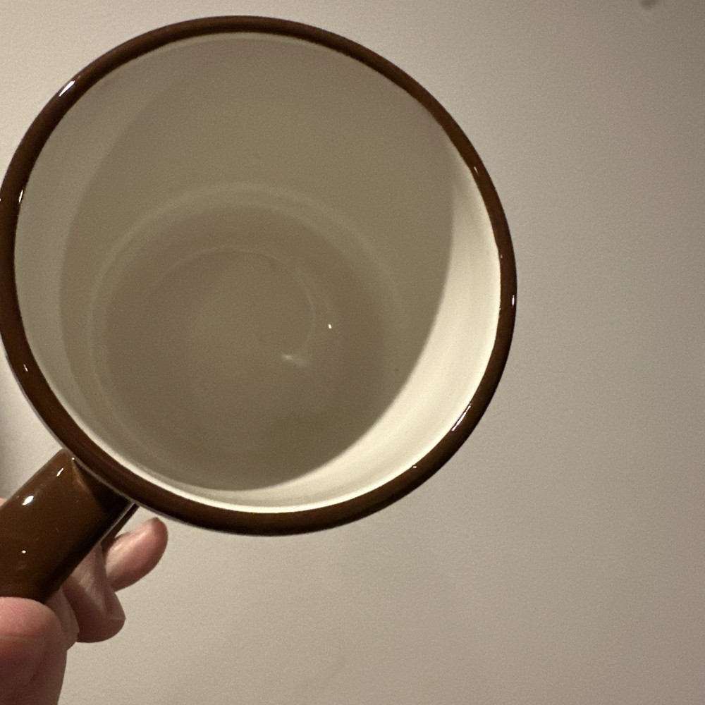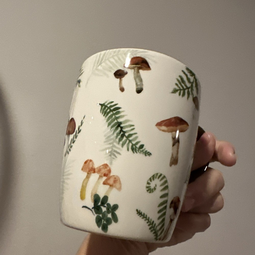 This product is a unique and charming mug featuring a brown handle with a pattern of ferns and mushrooms, perfect for enjoying coffee, tea, or hot chocolate in a whimsical woodland setting. The brown color adds a rustic touch to the design, making it a delightful and functional piece of decorative cookware for your kitchen or dining area. 12-14oz
