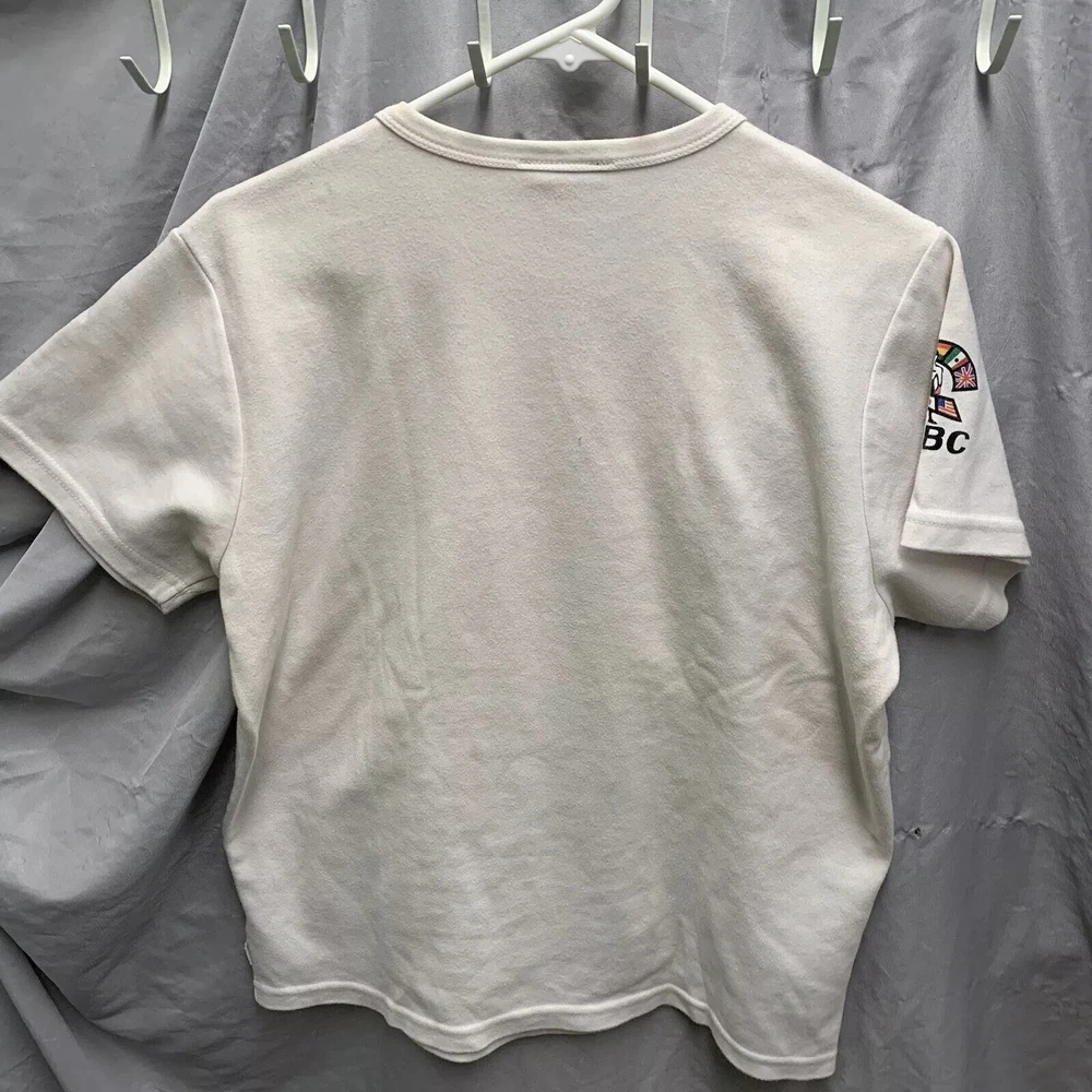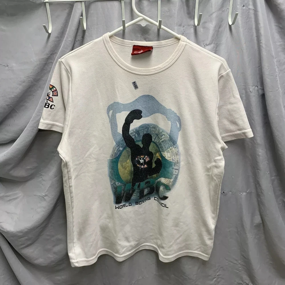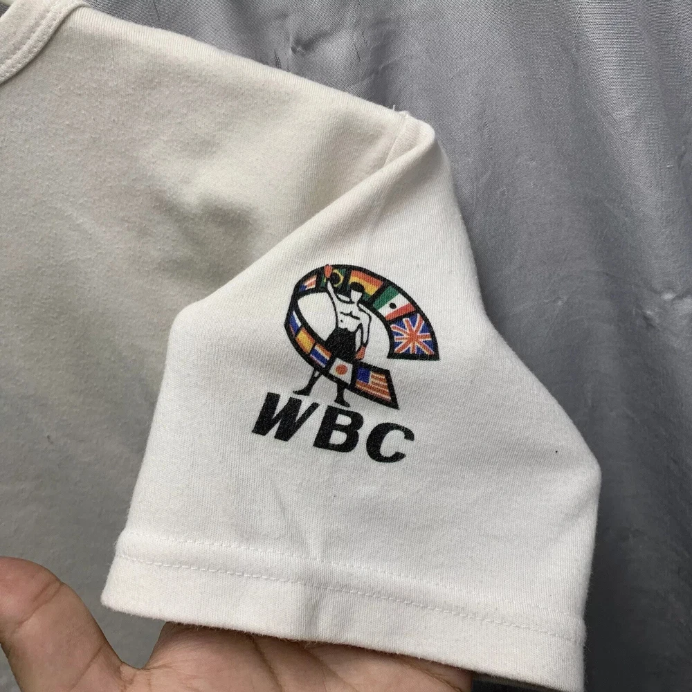 This vintage World Boxing Council t-shirt is a must-have for any 90s enthusiast. Featuring a graphic print of a blue character, this white cotton and cotton blend shirt has a crew neck and short sleeves. The shirt is preshrunk, lightweight, and has a double-sided stretch for all seasons. It also features an adjustable full zip and hood for added comfort. The shirt is a limited edition, with a button and embroidered logo accent. This shirt is perfect for anyone who loves boxing or wants to add a unique piece to their wardrobe. It is a regular fit and comes in size large. The shirt was manufactured in the United States in the 1990s and is a part of the Friends and Free! character family.