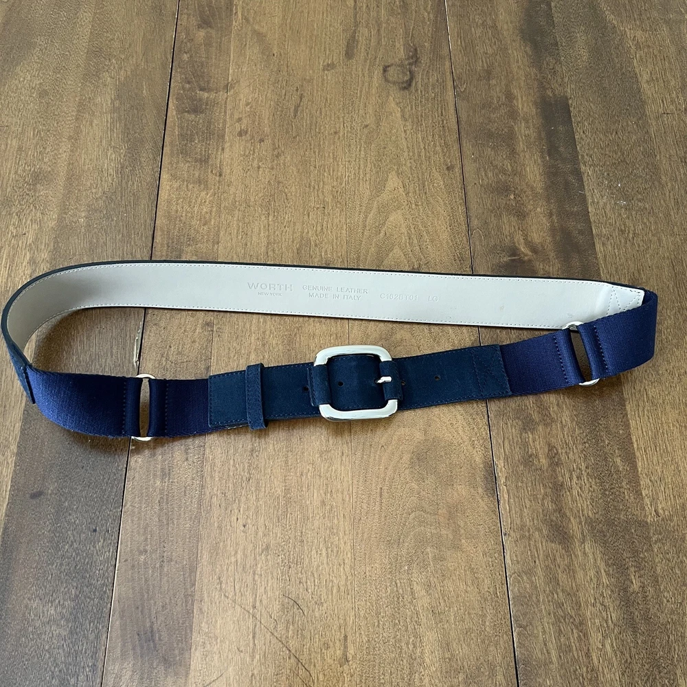Elevate your wardrobe with the Worth New York Women's Genuine Leather Belt, a timeless accessory that blends functionality with high-end fashion. Crafted from premium leather in a sophisticated navy blue, this belt is a versatile addition to both casual and formal ensembles. Its sleek design features a striking silver buckle that adds a touch of elegance and ensures a secure fit. The belt is designed to cater to a size L, offering an adjustable option to ensure the perfect fit. Its solid pattern and minimalist style make it an ideal choice for those who appreciate a clean aesthetic, whether it's for a day at the office or a night out. The belt's durable leather material and subtle accents, such as the understated buckle, reflect a commitment to quality and understated luxury.
