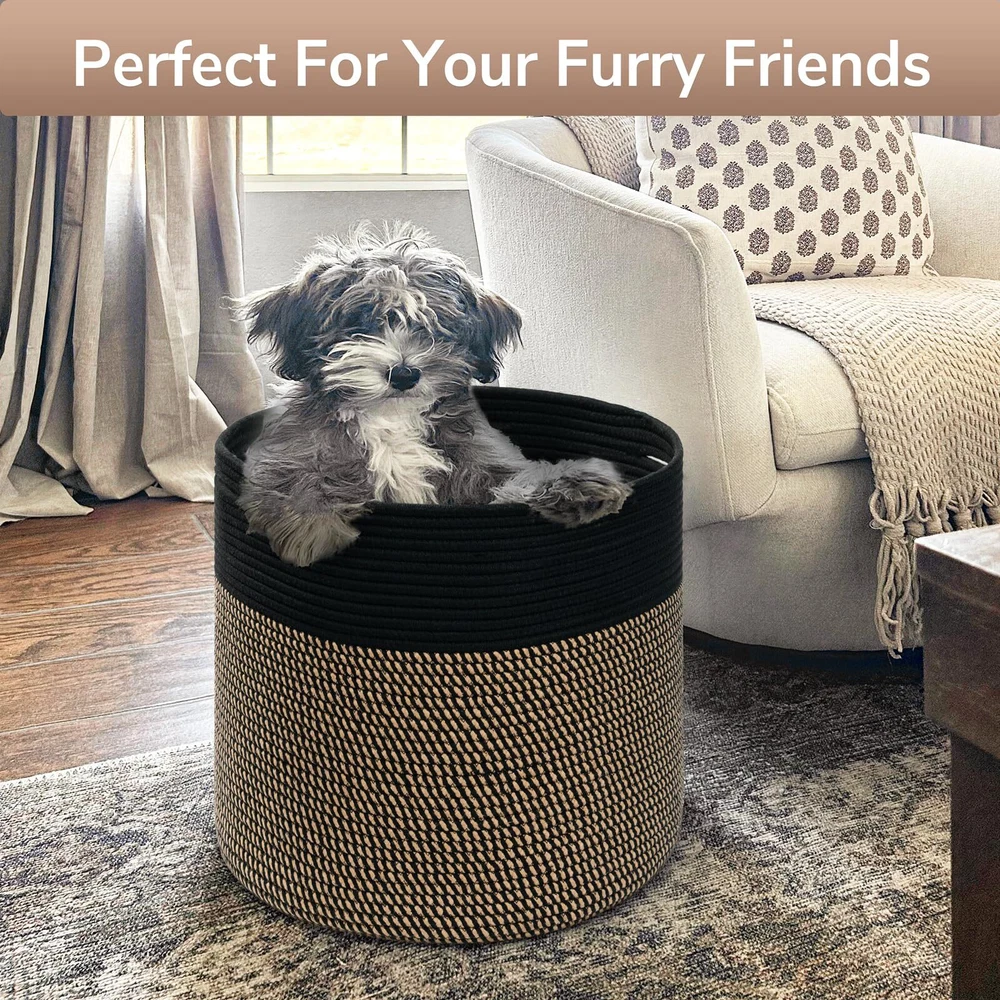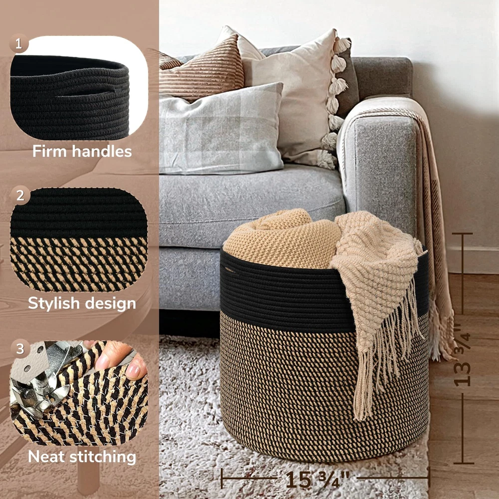 Attractive Organization Solution. There is nothing more useful for organizing your home than this handmade living room basket. When life gets messy, this bin is the perfect catch-all basket for blankets, clothes, sheets, shoes, towels, throw pillows or toys. Easily organize your interior space and make your home more cozy Stylish Home Decoration. The storage baskets for organizing are designed with two hidden handles on both sides, which make the basket portable and allow you to move it around your home with ease. With its elegant design, this towel basket is also an amazing home decor that fits anywhere in your home Large Size. This shoe basket measures 15.8 x 15.8 x 13.8 inches and is large enough to meet your daily needs, keeping your living room, bathroom, bedroom, laundry room and entryway neat and tidy Soft. This cotton rope basket is made of soft rope while being sturdy, which is perfect for home use, especially for children and pets. Different from the rattan or wicker storage basket, this large woven basket will not scratch your hands, clothes or floors and is suitable as Mother's Day, Christmas gifts for others Note. The toy organizers and storage bins are folded for shipping. It will turn back to its elegant shape quickly by filling it with towels and blankets, or ironing is a great idea to get rid of shipping creases. Also, you can fold it into a flat shape for easy storage when not in use