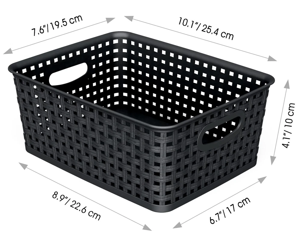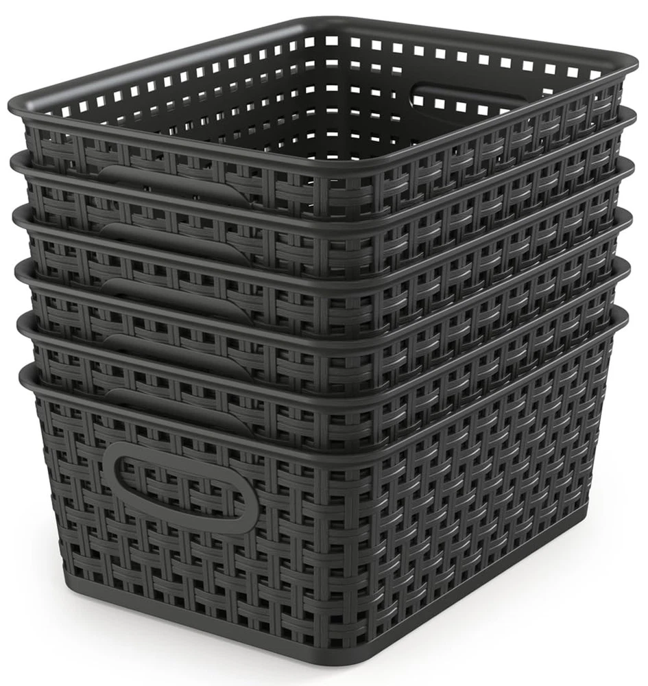 6 pack black plastic organizer basket, weave wicker storage organizer basket, perfect to service for kitchen/ bathroom/ classroom and so on, outside dimensions: 10" length x 7.5" width x 4" height Simplify plastic storage baskets are hassle-free stack able when not in use for maximum space utilization, and its combined tote allow you to move them with ease. Take it wherever you need storage. For convenient storage basket that are built with the sturdiness to give you years of service . The basket durable translucent plastic body with wicker design are built to last from premium materials The polypropylene plastic wicker storage basket are great for clothing, linens, bath and beauty products, magazines, etc. Versatile design and features to organize any space in your home, dorm room or office We adhere to the best product delivery and the most uncompromising quality. The trust placed by our discerning customers earned over the years. Fulfillment of our customer's need are core of our vision.