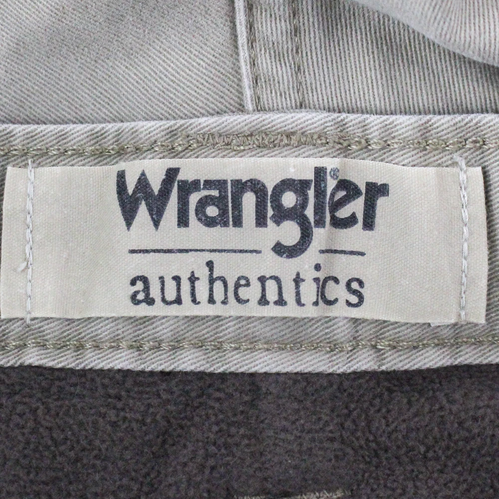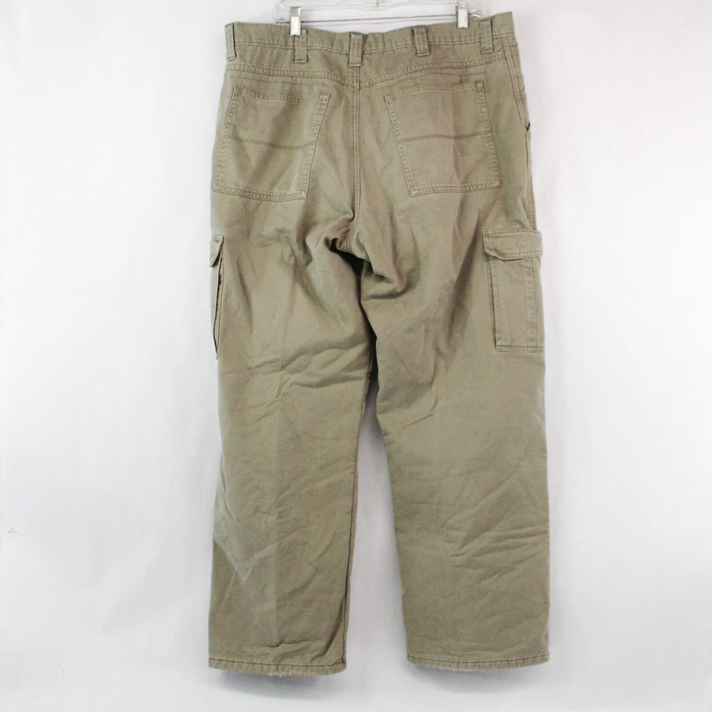 These Men's Wrangler Authentics fleece-lined cargo khaki pants are perfect for tough workwear. They feature a waist of 38 inches, a rise of 14 inches, and an inseam of 29 inches, making them ideal for comfortable and practical use. These pants are in pre-owned condition with wear and stains.
