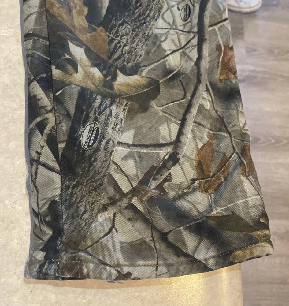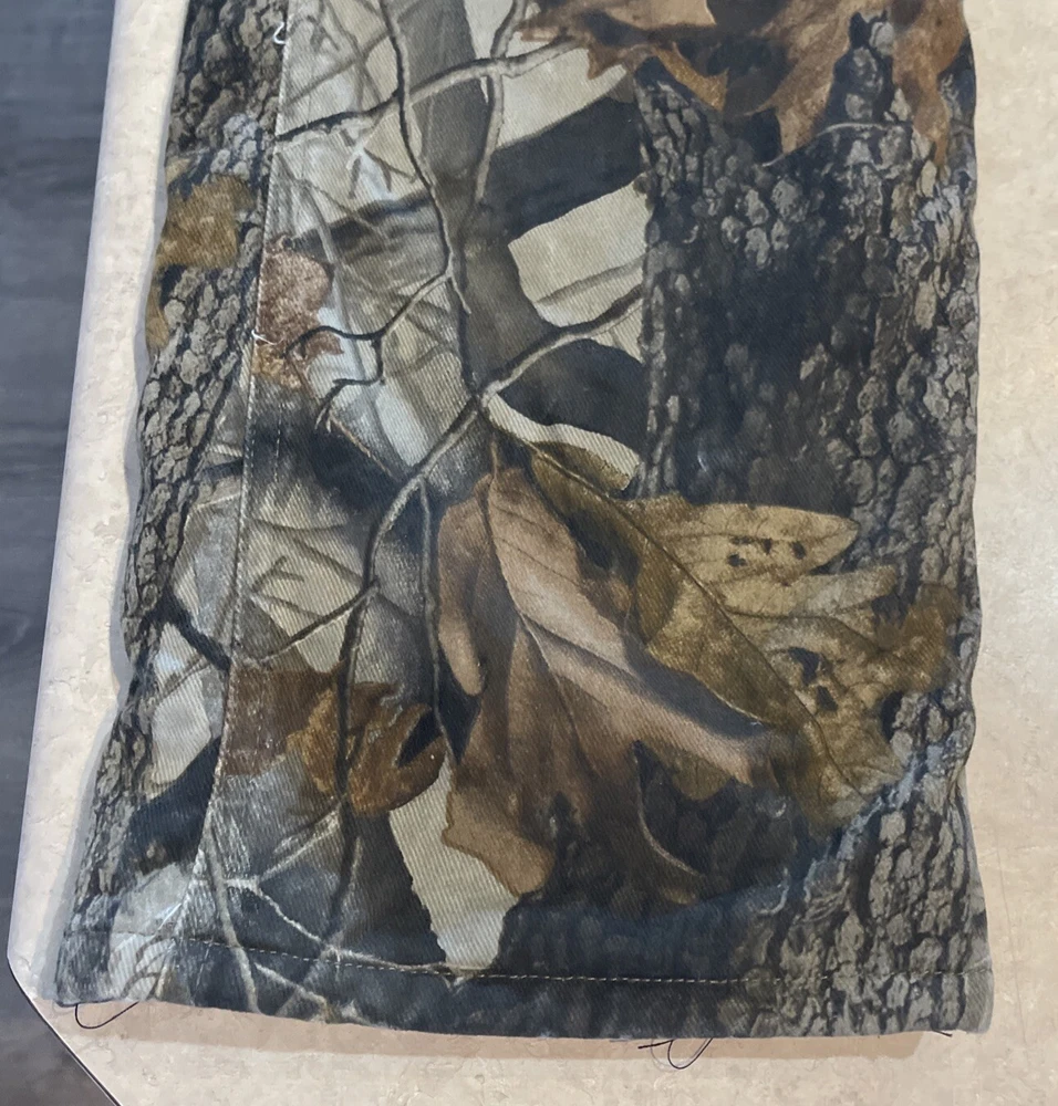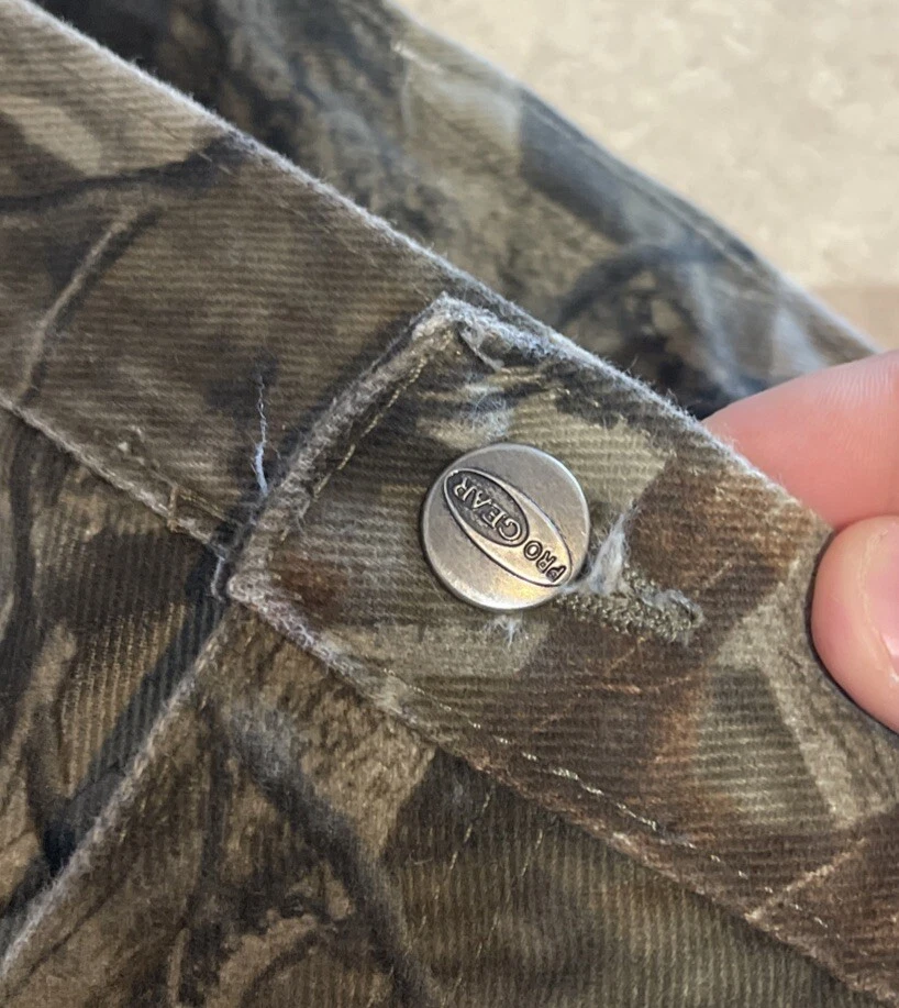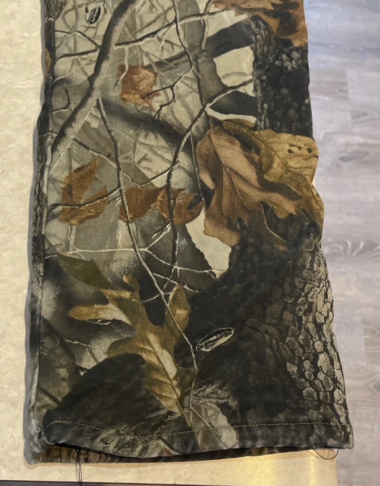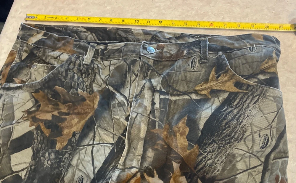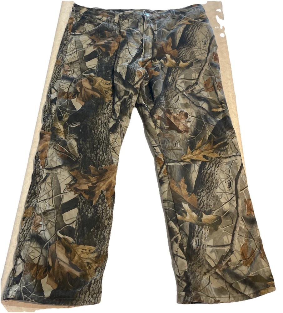 These Wrangler Pro Gear Realtree Camo Lined Pants are designed for outdoor enthusiasts, especially those who enjoy hunting. The pants feature a camouflage pattern, insulated cotton fabric for warmth in winter and fall seasons, and a straight leg fit with a regular waist size of 42 inches and inseam of 30 inches. With cargo and 5-pocket designs, they provide ample storage for outdoor activities. The pants also have a high rise, button and zip closures, and the Wrangler ProGear product line ensures durability for rugged use in various outdoor environments. These pants are in good preowned condition with some wear and tear on the right back pocket, which can be seen in photos. Please see ALL photos for a better idea on condition, any measurements, or details to the pants.