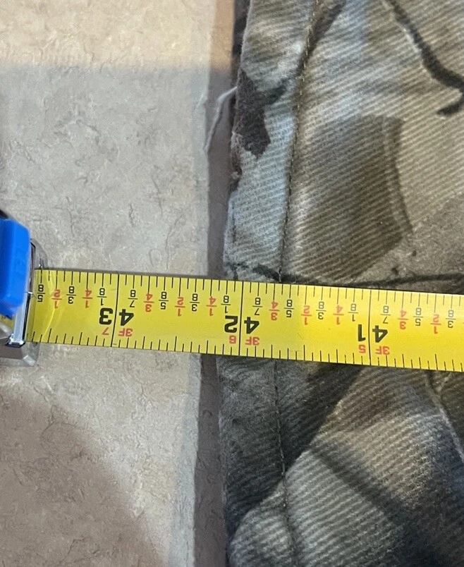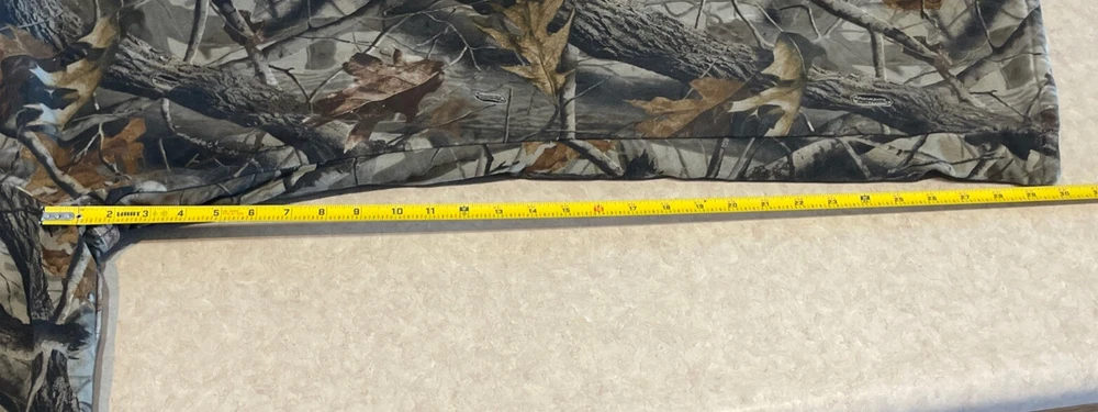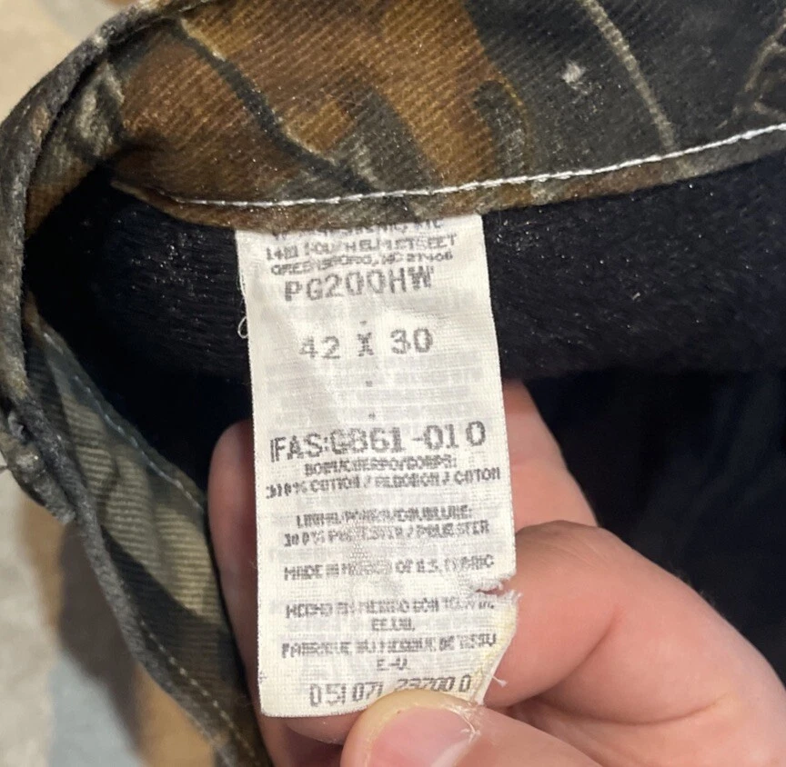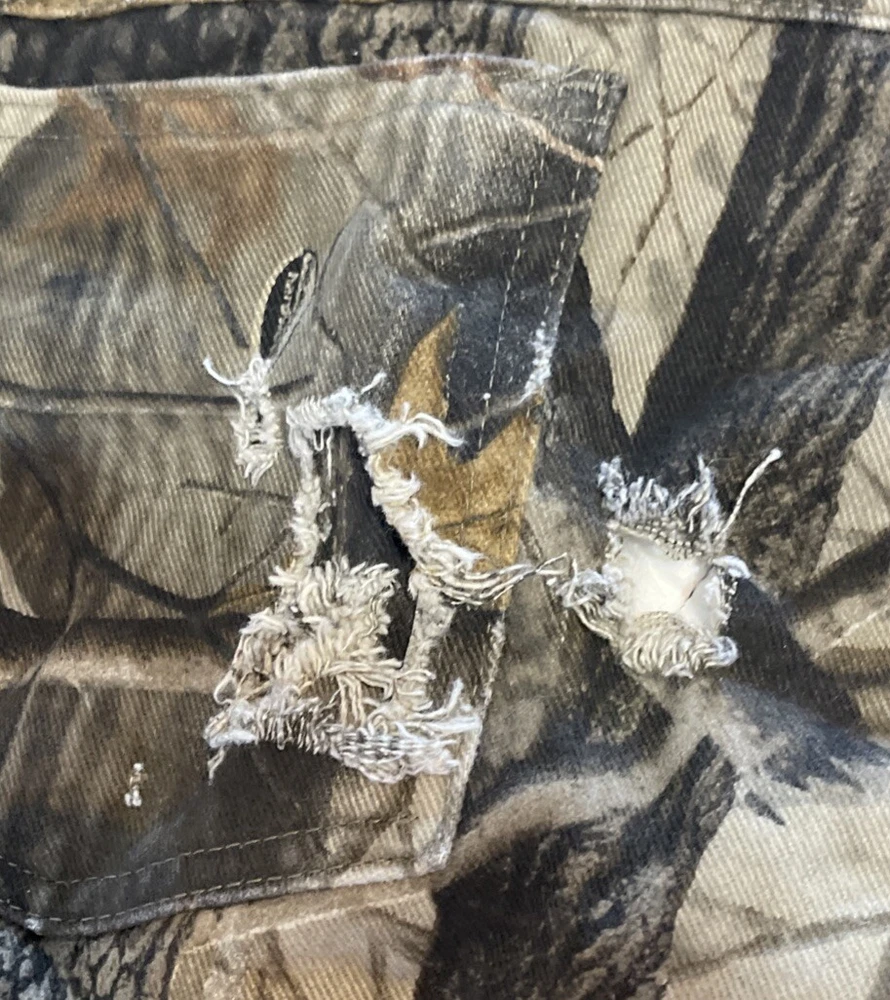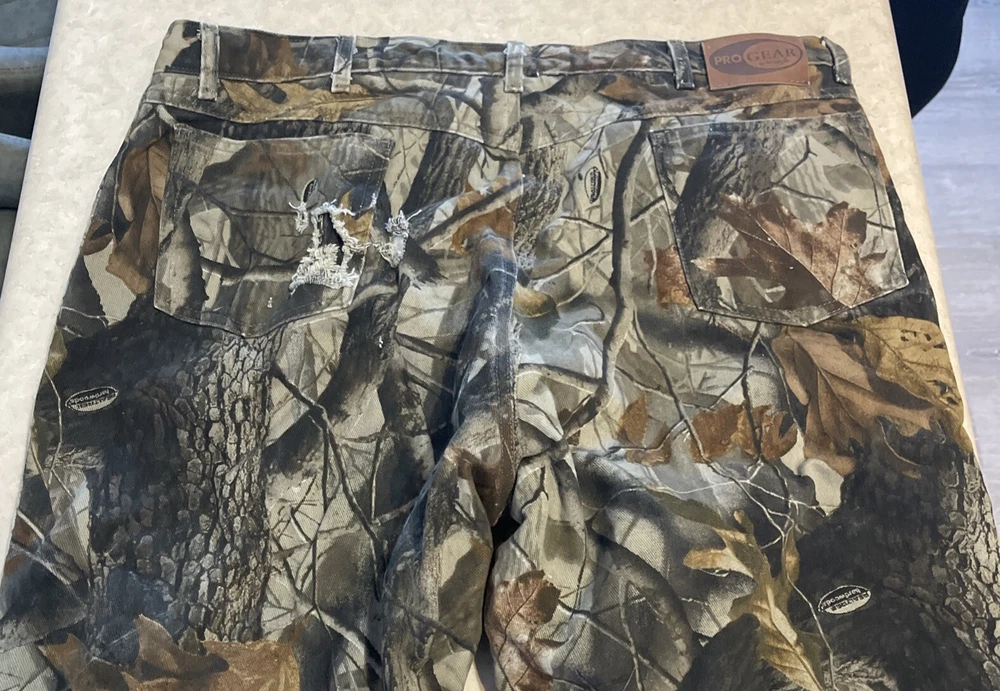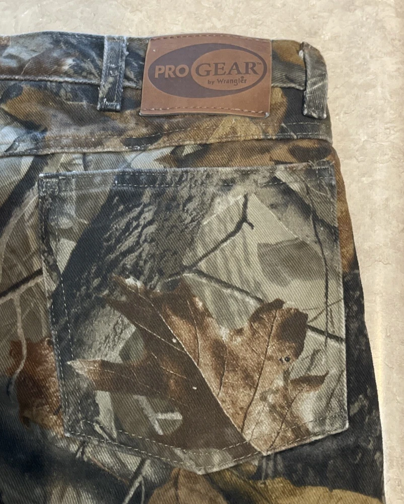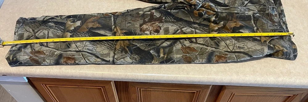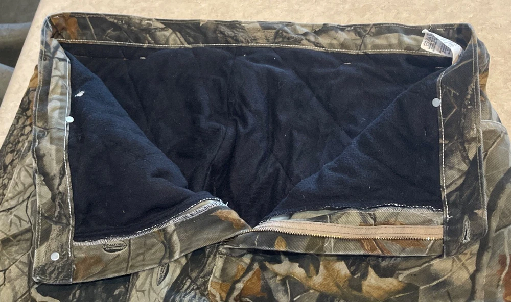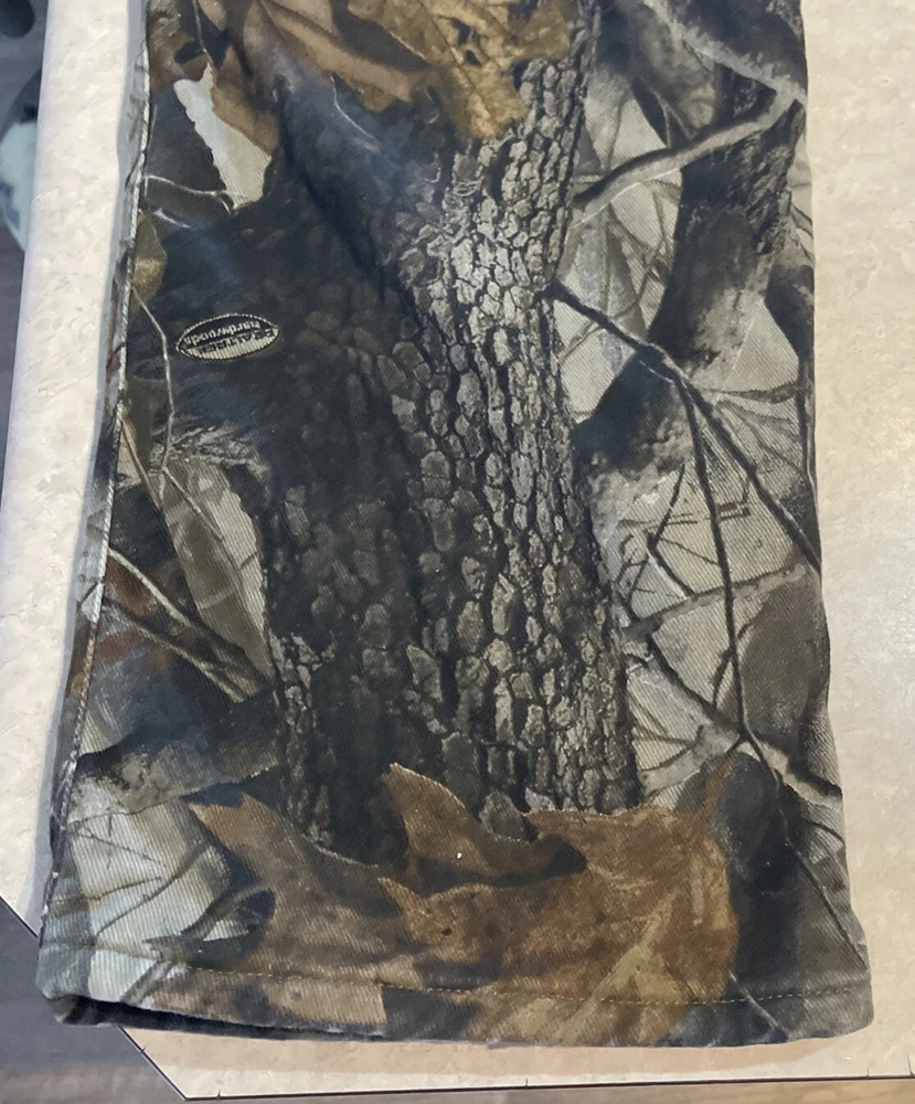 These Wrangler Pro Gear Realtree Camo Lined Pants are designed for outdoor enthusiasts, especially those who enjoy hunting. The pants feature a camouflage pattern, insulated cotton fabric for warmth in winter and fall seasons, and a straight leg fit with a regular waist size of 42 inches and inseam of 30 inches. With cargo and 5-pocket designs, they provide ample storage for outdoor activities. The pants also have a high rise, button and zip closures, and the Wrangler ProGear product line ensures durability for rugged use in various outdoor environments. These pants are in good preowned condition with some wear and tear on the right back pocket, which can be seen in photos. Please see ALL photos for a better idea on condition, any measurements, or details to the pants.