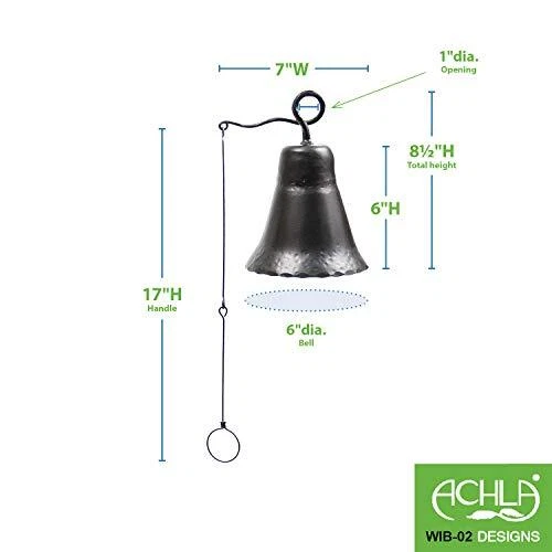 These hand-forged Wrought Iron Bells have a delicately looping stem for hanging that also holds the pull chain. As the bell tips, the knocker rings a bright clear sound. Hang from our O Hook bracket to use as an old-fashioned doorbell, the dog in, or the let the know dinner is ready. Available in three sizes, smallest has the highest tone, largest is the lowest and rings loudest. Bright, Clear Sound: This charming, hand-forged knocker bell that hangs freely and catches the breeze like a wind chime. Used as a doorbell, it promises a pleasing, clear sound that is loud enough to hear from inside your home. A delicately looping stem for hanging also holds the pull chain. As the bell tips, the knocker rings. COATED FINISH: These metal bells have a graphite -coated finish with the look of natural iron. coatings result in a high-quality finish that is more durable and resistant to scratching than regular liquid paints. HAND-FORGED FROM WROUGHT IRON: This decorative and durable door bell is handmade using fine wrought iron. Our in-house design team brings together varied expertise in the fields of mechanical engineering, architecture, fine art, sculpture, and metallurgy. This expertise results in high-quality, beautiful bells. Because each product is hand-forged, exact dimensions may vary slightly. COATED FINISH: These metal bells have a graphite -coated finish with the look of natural iron. coatings result in a high-quality finish that is more durable and resistant to scratching than regular liquid paints. THREE SIZES: Small Bell- 4-inch diameter, has the highest pitch sound, Medium Bell- 6-inch diameter has a mid-tone, and Large Bell- 8-in diameter has a deep tone.