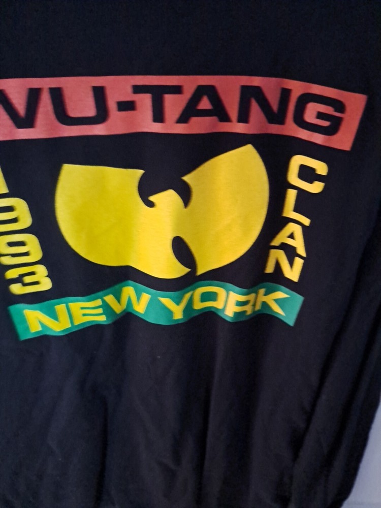 Show off your love for the Wu Tang Clan with this black long sleeve T-shirt. The shirt features the iconic Wu Tang logo on the front, making it a must-have for any true fan. Made for men in size medium, this regular fit T-shirt is perfect for casual wear or for attending concerts. The shirt is made of high-quality materials and is designed to last. Get ready to turn heads and make a statement with this stylish T-shirt.