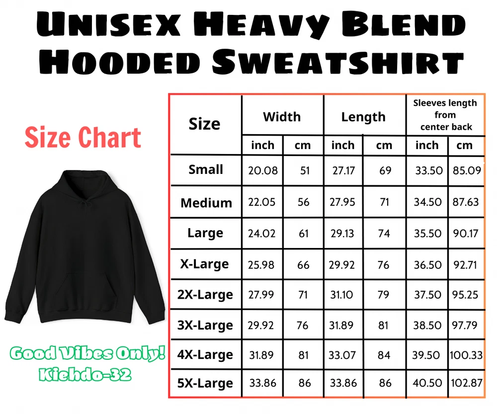 Description This unisex heavy blend hooded sweatshirt is relaxation itself. Made with a thick blend of cotton and polyester, it feels plush, soft and warm, a perfect choice for any cold day. In the front, the spacious kangaroo pocket adds daily practicality while the hood's drawstring is the same color as the base sweater for extra style points. Key Features - Spacious pockets: Kangaroo pouch pocket will always keep your hands warm. - Drawstring hood: Adjustable hood with self-colored woven cord. - Without side seams: Knitted in one piece using a tubular knit, it reduces fabric waste and makes the garment more attractive. - 50% cotton, 50% polyester: Made from specially spun fibers that make for a very strong, smooth fabric. Polyester fibers are extremely resilient, resistant to most chemicals, stretching, and shrinking. Feedback - Once you have received your item, please leave us feedback, as this will inform us that you have received your item(s). ^__^ - If you received the wrong item that does not match the description or a defective item please message us with a picture first before leaving us a negative feedback. ^__^ Thank you so much! ^__^ Kiehdo-32 a.k.a GoodVibes29