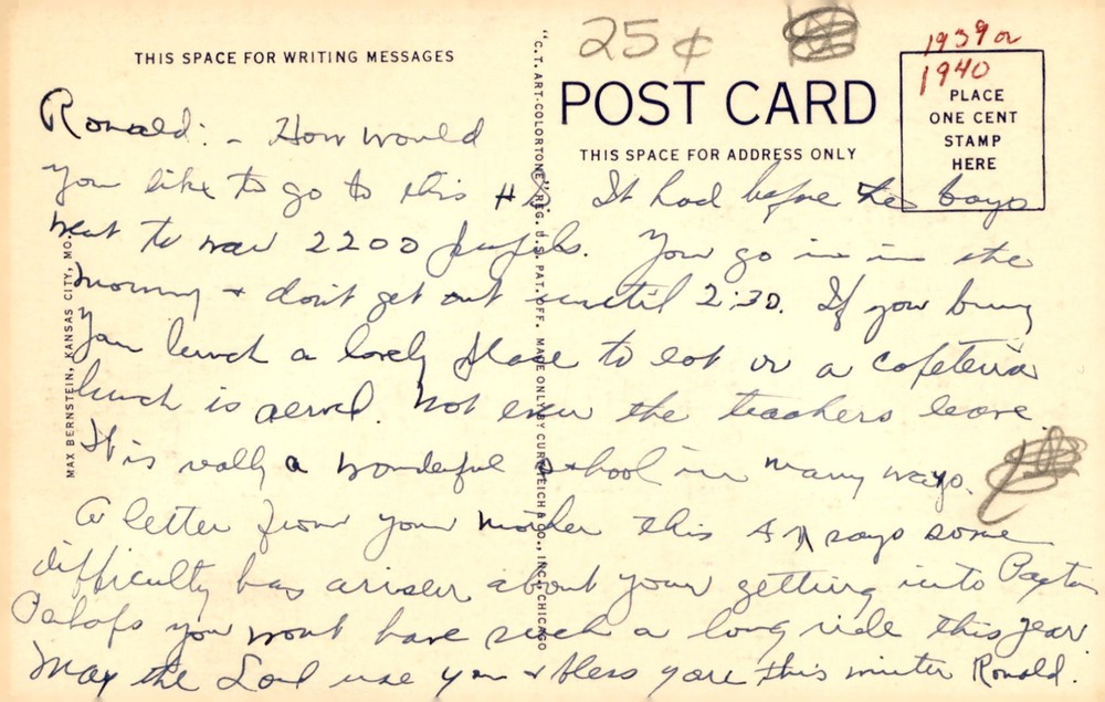 Message on postcard discussing a school visit invitation and lunch plans. Mother expresses hope for a shorter commute and blessings for Ronald.