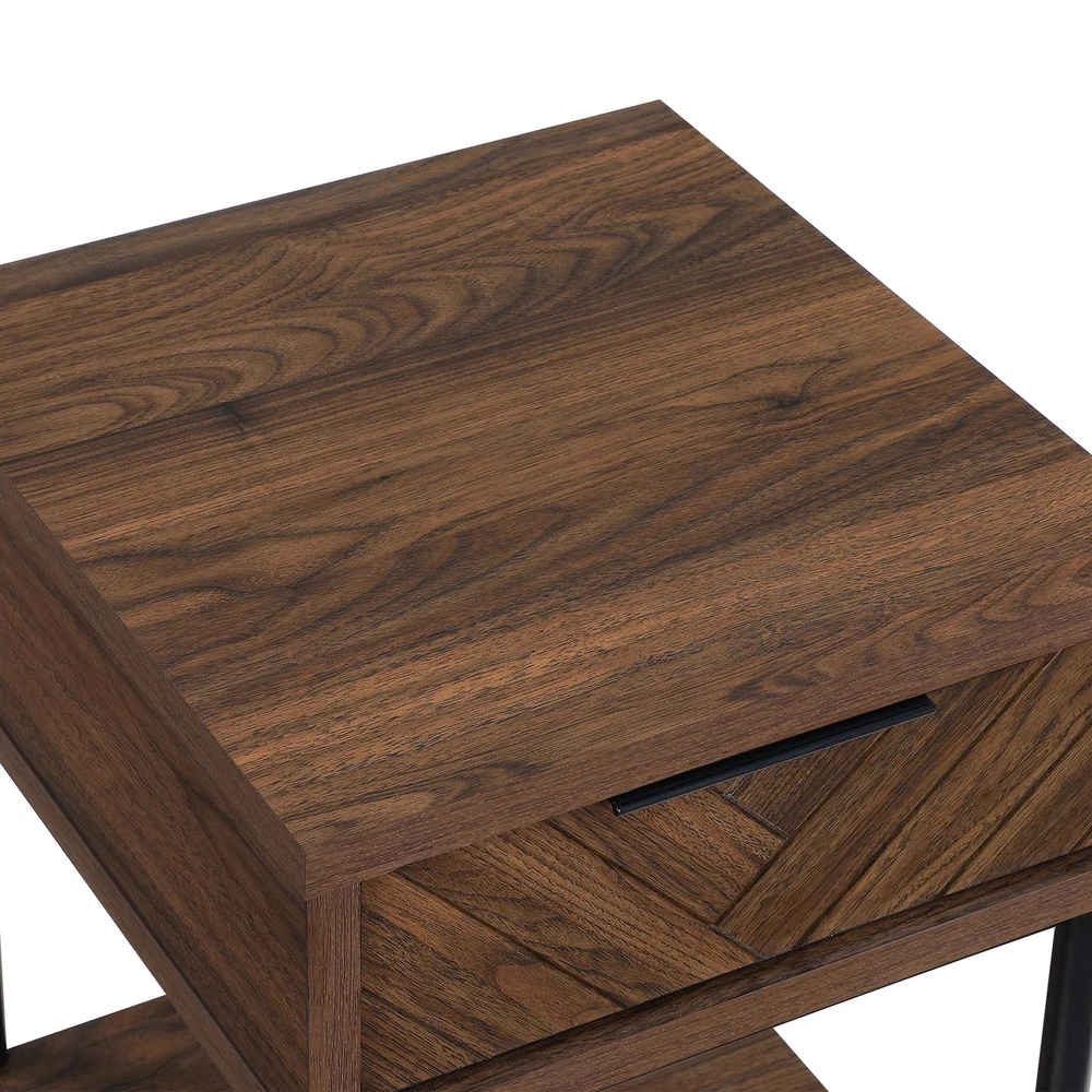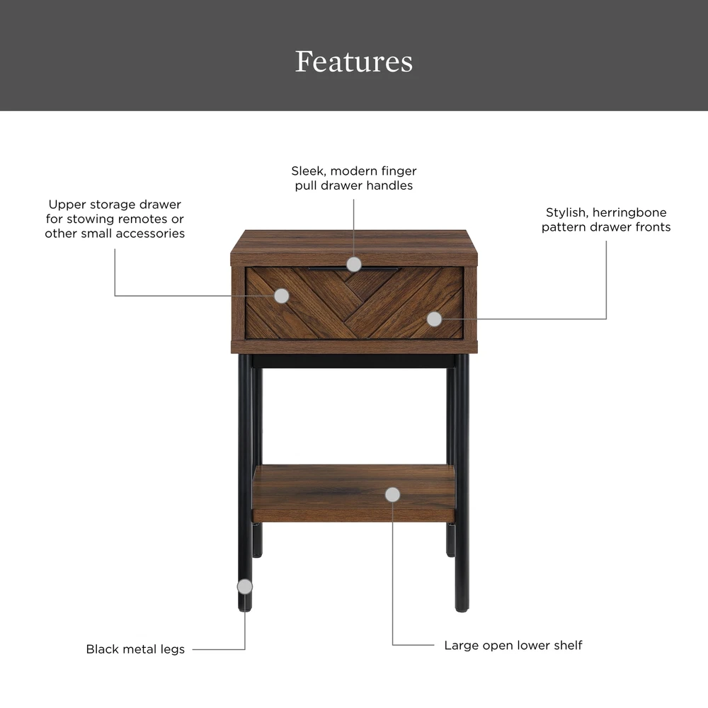 Elevate your living space with the Wyatt Geo End Table , where modern elegance meets craftsmanship. This charming side table is a versatile companion for your daily life. Imagine having your essentials within arm's reach, neatly stored away in the upper drawer. From remotes to keys, or even a cherished novel, this table keeps everything organized while adding a dash of style. The drawer boasts a contemporary herringbone pattern, enriching the table's texture and depth, making it a standout piece. The open shelf offers the perfect spot for your decorative pieces, greenery, or your favorite magazines, blending functionality with aesthetic appeal. Resting on sleek black metal legs, this side table presents a modern silhouette that complements its rich brown finish beautifully. The minimalist design adds a contemporary touch, and the quality engineering ensures stability and durability for years to come. Designed to harmonize with any room, the Wyatt Geo End Table pairs splendidly with the Wyatt TV Console, Coffee Table, or other items from the Better Homes and Gardens Wyatt Collection (sold separately). Whether it's set beside a cozy sofa or a comfy armchair, this side table is a chic and practical addition to your home. Its blend of form and function effortlessly enhances any decor, bringing a timeless charm and a touch of sophistication to your living space. Upper storage drawer for stowing remotes or other small accessories Large open lower shelf Spacious tabletop for conveniently placing remotes, books, or beverages Stylish herringbone pattern drawer fronts Soft-closing, ball-bearing drawer glides Sleek, modern finger pull drawer handles Black metal legs Walnut brown finish Pair with other items from the Wyatt Collection (Sold Separately) Assembly required Dimensions: 17 in x 18 in x 25.25 in (43.2 cm x 45.7 cm x 64.1 cm) Packaging Dimensions: 22.5 in x 20.375 in x 13.5 in Model# BH1425004710002