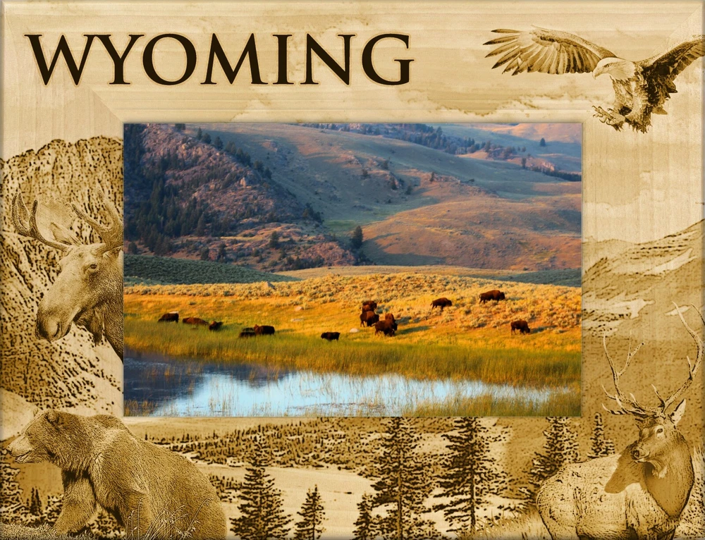 You are buying: Wyoming Laser Engraved Wood Picture Frame Landscape (4 x 6) Picture Frame is made from Wood Picture Frame Measures 8.50 x 6.50 inches Picture Frame will hold a 4 x 6 Picture This item is Made in the USA Frames are new FREE SHIPPING to U.S. Customers Check out our ebay store where we have all the state magnets, plus lots of other items available. If you need larger quantities than what we have listed. Let us know and we will try to accommodate you.