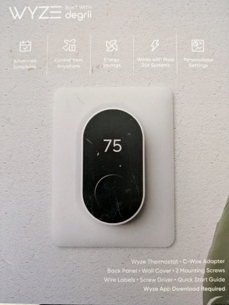 The Wyze WTHERM Smart Thermostat is a programmable thermostat that can be controlled through various means such as a digital interface, touch screen, Wi-Fi, Bluetooth, and through voice commands using Apple HomeKit, Google Home/Assistant, and Amazon Alexa. It has a 4-wire configuration and is compatible with central heating radiators. The thermostat is oval in shape and is wall-mounted. It has a display size of 3.54 inches (9 cm) and was manufactured in 2020. The thermostat features temperature sensor technology and can switch between cooling and heating automatically. It is powered by corded electric and has a voltage of 24V. The thermostat is designed to be used in homes and is made of plastic.