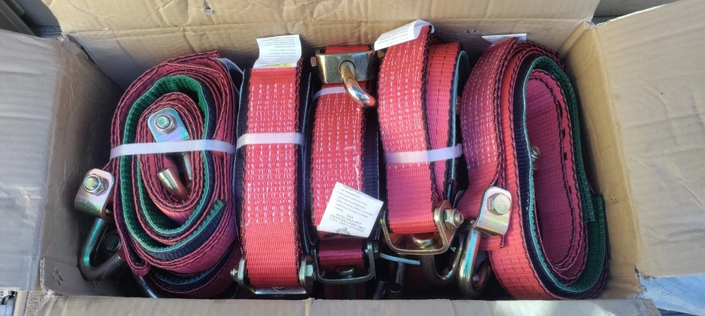 New 12 count box of straps. Never used, all but one have plastic binding still on. 2" x 14' Red TECNIC Webbing Replacement Wheel Lift Strap with Swivel-J Hooks BOX