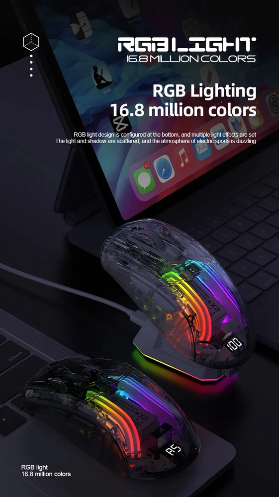 X2 Pro Magnetic Charging Bluetooth Mouse, Tri-Mode , RGB Lights, Transparent, Battery Indicator, Computer Phone X2PRO wireless mouse introduction: Product interface type:USB-Type-C Product connection method: USB, 2.4G, Bluetooth Product optical sensor: original phase 3212 Lighting effect: 11 kinds Frame rate (IPS):60IPS Maximum acceleration (G): 20G Refresh rate (FPS):4000FPS DPI:1200(Default)-1600-2000-2400-4000 Battery capacity:500mA polymer battery Charging current:280mA Charging voltage: 5V Product size:126.3*62.5*38.4mm