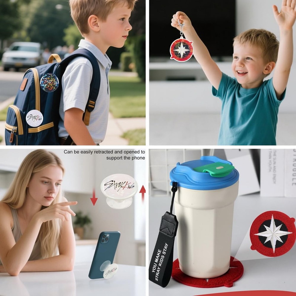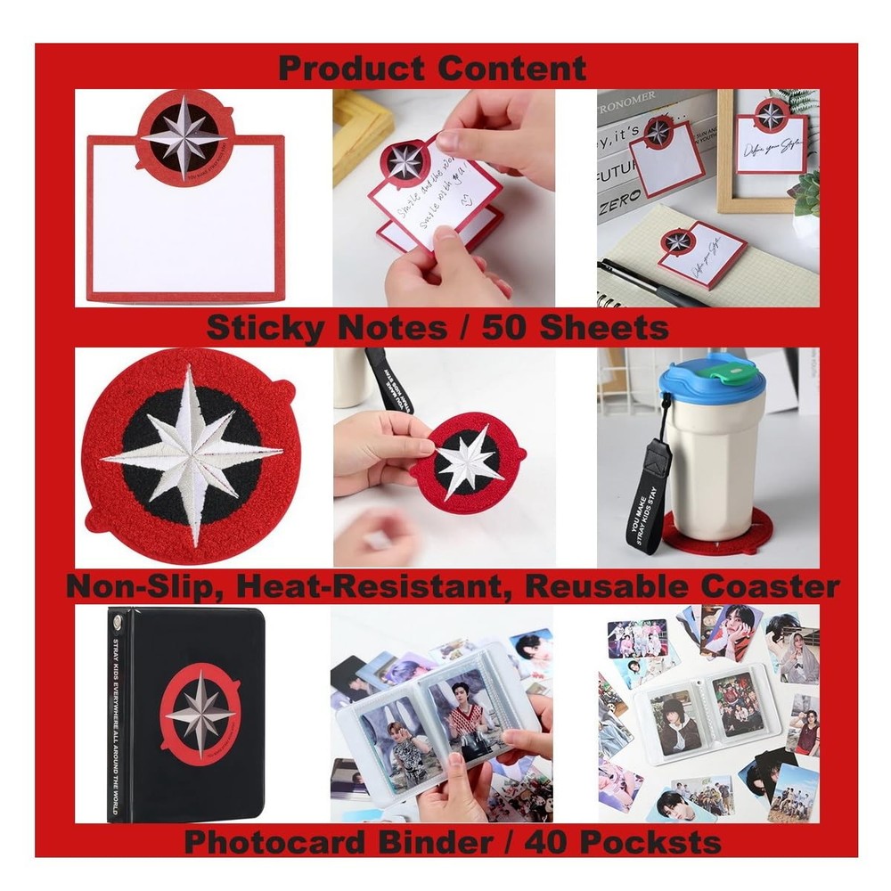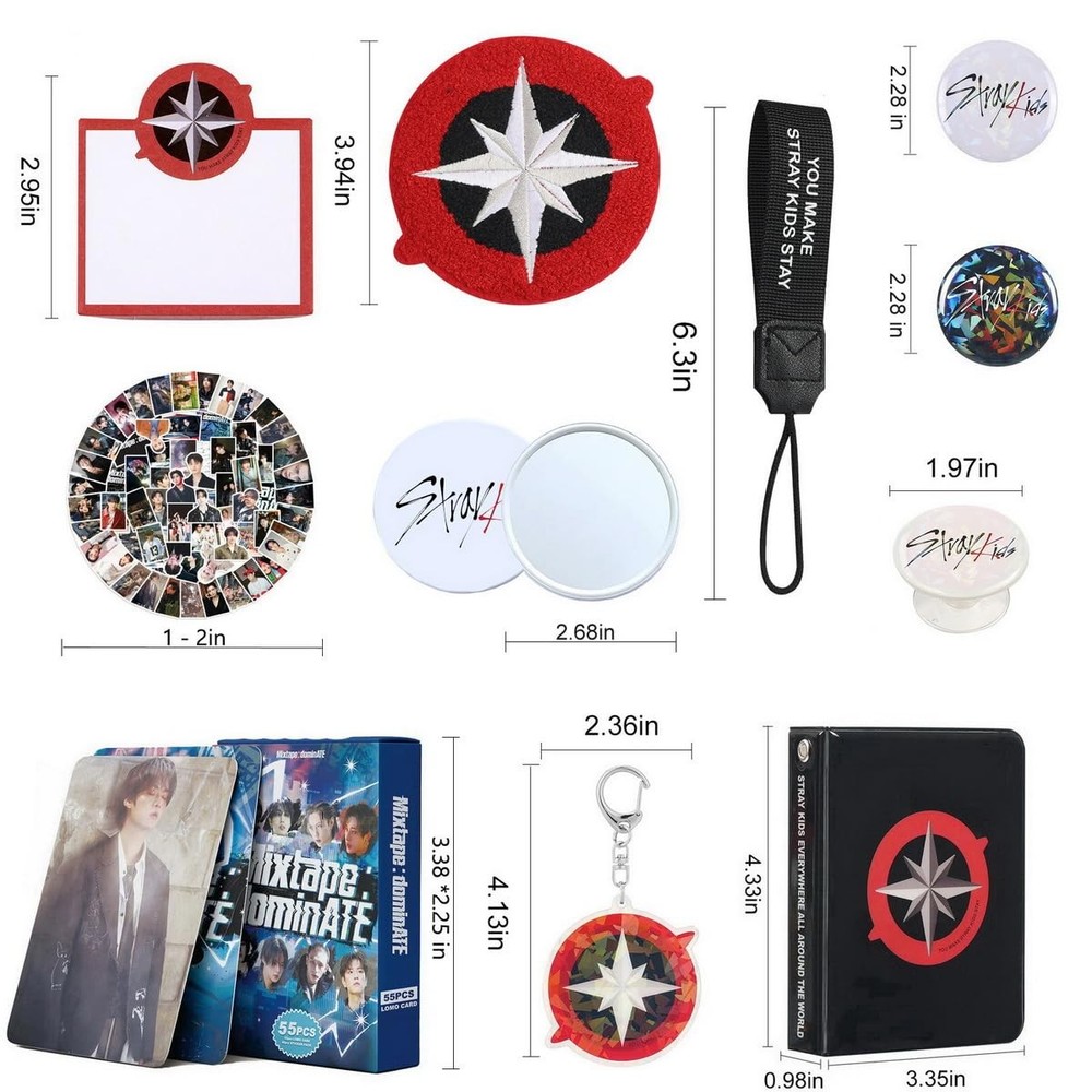 This skz merch gifts set is designed especially for dedicated stay fans, versatile components make this gift set ideal for meaningful present . This skz merch gifts set is designed especially for dedicated stay fans, versatile components make this gift set ideal for meaningful present . Stray gifts set includes: 55 photocard ,92 stickers,1 phone ring holder, 2 pins,1 acrylic keychain, 1 coaster, 1 photocard binder /40 slots, 1 Lanyard, 1 sticky notes/50 sheets,1 mirror . Skz photocards perfect for fans to cherish their favorite members,Stickers- Decorate your belongings with cute skz-themed designs,40-Page Binder - Organize your photocards neatly and stylishly . Acrylic keychain and pin badges - Show off your fandom proudly with these eye-catching pins keychain, Lanyard - use it as a bag strap or phone strap—practical and trendy, Coaster - Protect your surfaces while keeping your drinks stylish. Whether you’re collecting, decorating, or gifting, this set has everything stay fans need. is a must-have for any skz stay !