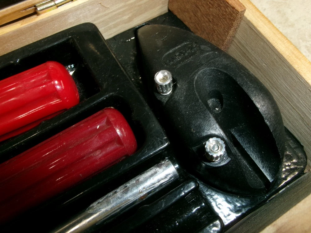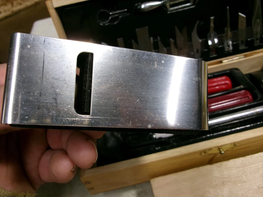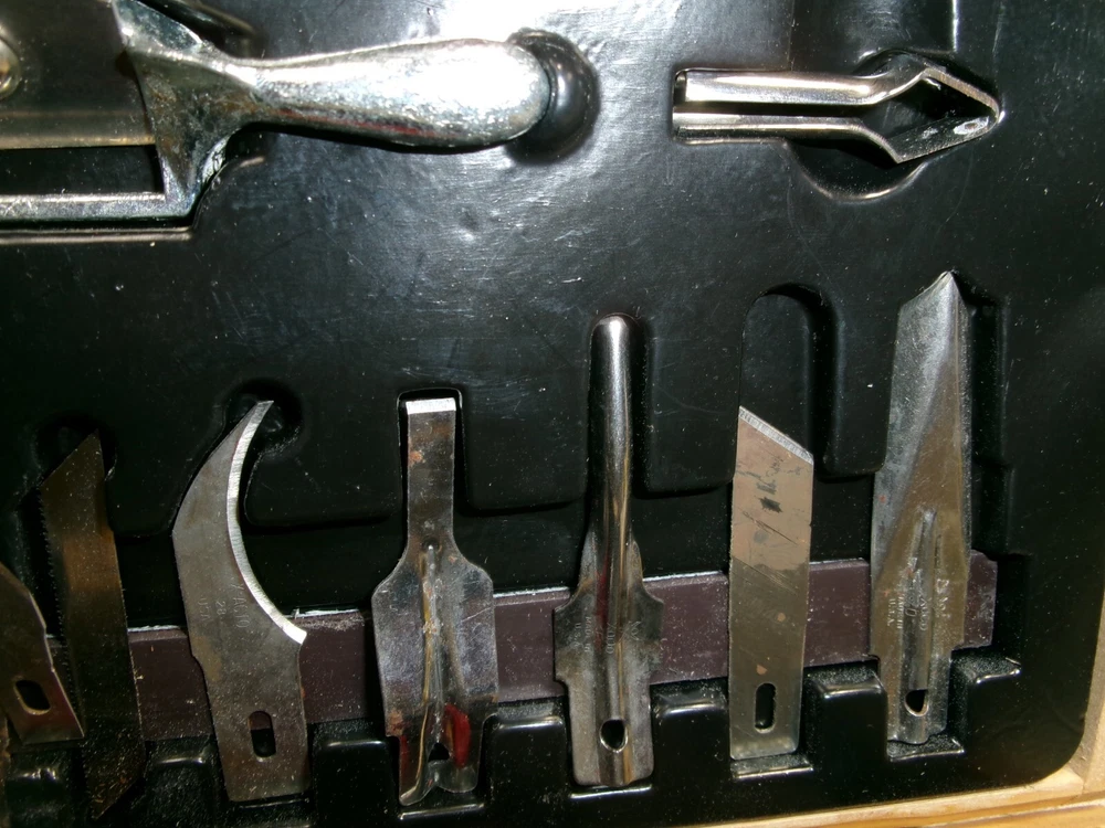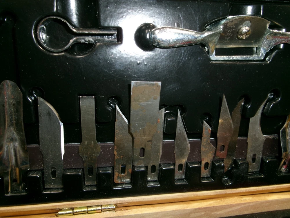 X-ACTO knife set. 22 blades, three handles, plane, spoke shave, etc. in wooden box. Very nice set