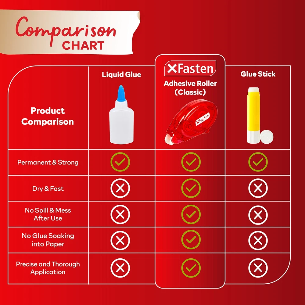 XFasten Double Sided Adhesive Scrapbook Runner Tape Roller, 0.3-inch by 360-I... Product Overview Size: 8-Pack, 0.3-inch by 360-Inch Color: Red Shell (Clear Tape) About The XFasten Adhesive Rollers Why Choose The XFasten Adhesive Rollers? Perfect for Scrapbooking These double sided tape dot applicators are perfect for scrapbooking because it's so easy to use and doesn't ruin your overall design. Smooth & Jam-Free Applicator It does not turn yellow, dry out or become gooey even after a long time - making it a perfect tape that's ready to use anytime. Clean & Mess-Free Application These are the double-sided adhesive tape runners for card making because it's easy to use and doesn't ruin your design. Residue-Free & Surface-Safe Strong enough to hold high density paper and kraft materials while still being residue-free, surface-safe, and mess-free. Previous page Next page 1 Test The Surface 2 Hold The Surface 3 Improve Strength Level Up Your Scrapbooking Game XFasten Adhesive Rollers The XFasten Adhesive Roller is a light-duty scrapbooking tape that is calibrated for home, office, and enterprise use. It features a jamming-resistant applicator that allows for quick dispensing and cutting of tapes - giving you more mileage over time. It's a welcome alternative to messy glues - especially for school and office work. Bring the XFasten Adhesive Roller anytime, anywhere. It has a protective tip cover to avoid the adhesive from sticking in your bag. How convenient! The XFasten Adhesive Rollers Collection Adhesive Roller Adhesive Roller Adhesive Roller Adhesive Roller Adhesive Roller Adhesive Roller Quantity 4 Rollers 8 Rollers 12 Rollers 24 Rollers 4 Rollers 8 Rollers Width 0.3" 0.3" 0.3" 0.3" 0.3" 0.3" Length 360" 360" 360" 360" 360" 360" Shell Color Red Red Red Red Red, Pink, White, Yellow Red, Pink, White, Yellow Adhesive Color Clear Clear Clear Clear Clear Clear Double Sided ✔ ✔ ✔ ✔ ✔ ✔ Features Acid free and archival safe double-sided adhesive tape roller that is ideal for scrapbooks, photos, and school projects. Equipped with a smooth and jam-free Adhesive Dot Roller Applicator that dispenses quickly without getting stuck, saving you time. Permanent and instant bonding. Ideal for school, gift wrapping, scrapbooking and home projects that require a clean and mess-free scrapbooking tape application. EMPOWERS average users to craft PROFESSIONAL-GRADE PROJECTS thanks to its clear surface and mess-free installation. The portable roller applicator operates smoothly without any jamming, cutting the time and effort required so that you can FOCUS MORE ON YOUR PROJECTS. Photo-safe and has a long storage and shelf life. Details Product Dimensions : 6.49 x 3.46 x 1.96 inches; 7.37 Ounces Date First Available : July 9, 2019 Manufacturer : XFasten Best Sellers Rank: #3,766 in Arts, Crafts & Sewing (See Top 100 in Arts, Crafts & Sewing) #50 in Arts & Crafts Tape #156 in Scrapbooking Adhesives #50 in Arts & Crafts Tape #156 in Scrapbooking Adhesives Customer Reviews: 4.2 out of 5 stars 2,183 ratings Quality Products Have peace of mind knowing that your order will arrive original factory sealed packaging. That means that you'll have the full force of the manufacturer's warranty to protect your purchase. Fast and Free Shipping You're already purchasing the item. Why pay additional for shipping, especially slow shipping? We get your order shipped out and delivered to your doorstep as quickly as possible. Commitment We are committed to making sure that you leave this transaction satisfied. That means having access to real people that get your questions and concerns answered quickly. Give us a shot and we will make sure that you will look to us again!