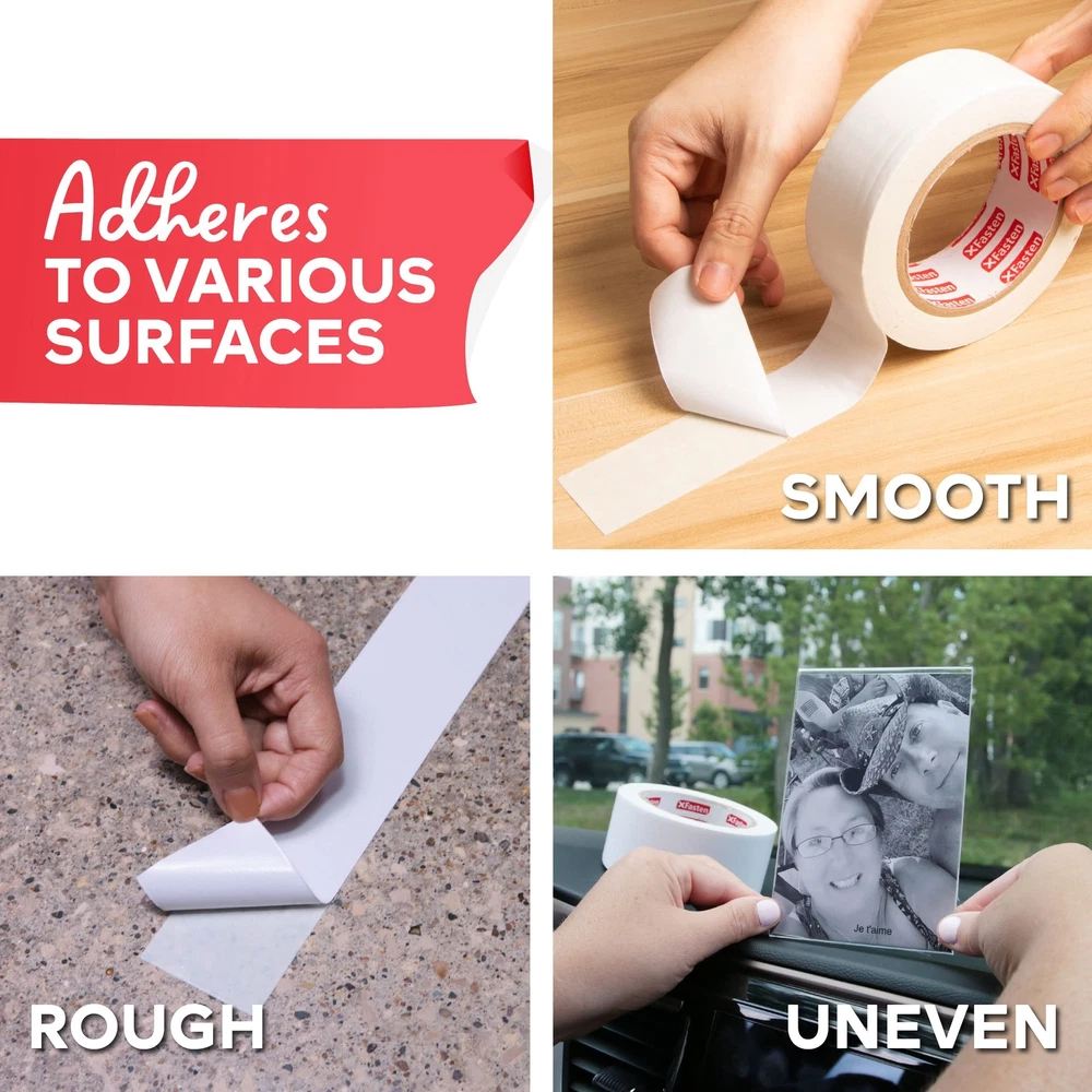 XFasten Extra Sticky Double-Sided Tape, White, 2-inch x 15-Yard, Extreme Bond... Product Overview Size: 2-Inches x 15-Yards (1-Pack) Read more The XFasten White Double-Sided Tape adheres to smooth, rough as well as uneven, and corrugated surfaces - perfect for other industrial hobby activities and purposes that require stable adhesion. It has the perfect balance of strength and gentleness to even the most delicate surfaces. The XFasten White Double-Sided is UV resistant, humidity, heat, moisture and extreme temperatures. All-rounder tape that is perfect for both indoor and outdoor applications. The XFasten White Double-Sided Tape is ideal for surface protection of leather seats, sofas, and furniture from pet scratches, sealing, light repairing, and other adhesion applications. The XFasten White Double-Sided Tape sports a durable nylon-cotton cloth inside layer sandwiched with a strong adhesive on both sides.Best of all, it doesn't leave any residues behind. Read more Versatility and Multi Purpose Be mindful of different surfaces - There are different double sided tape for different applications and surfaces, so make sure to check if your adhesive is compatible with the surface you will adhere to. The XFasten Double Sided Tape is compatible with most surface materials. Take your environment into consideration - Consider the type of environment where you will be using the double sided tape. You should know if the place has a low temperature or hot and wet conditions. Most of XFasten’s Double Sided Tapes are temperature- resistant. Ensure that the area is clean - Before installation, you have to make sure that the surface is free of lint, dirt, and dust because it can significantly lessen the bonding strength of the adhesive. Read more XFasten Double Sided Tape XFasten Double Sided Tape XFasten Double Sided Tape XFasten Double Sided Tape XFasten Double Sided Tape XFasten Double Sided Tape Size 2" x 30 Yards 1.5" x 15 Yards 1/2" x 20 Yards 1/4" x 20 Yards 2" x 15 Yards 3/4" x 15 Yards Usage Ideal for surface protection from pet scratches,sealing, repairing, and other mounting applications Ideal for surface protection from pet scratches,sealing, repairing, and other mounting applications Ideal for surface protection from pet scratches,sealing, repairing, and other mounting applications Ideal for surface protection from pet scratches,sealing, repairing, and other mounting applications Ideal for surface protection from pet scratches,sealing, repairing, and other mounting applications Ideal for surface protection from pet scratches,sealing, repairing, and other mounting applications Material Type Fabric Nylon-Cotton Reinforced Polycarbonate backing Reinforced Polycarbonate backing Double Sided Fabric Adhesive Strips Double Sided Fabric Adhesive Strips Residue-Free ✓ ✓ ✓ ✓ ✓ ✓ Double-Sided ✓ ✓ ✓ ✓ ✓ ✓ Color White White White White Cream White Cream White Quantity Single Pack Single Pack 6 pack 8 pack Single 3 pack Features Extra Sticky Double-Sided Tape that has twice the bonding power to the best-seller XFasten 2 Sided Sticky Tape and Carpet Tape. Perfect for heavy duty applications. High Tack Double sides mounting tape that is ideal for Woodworking, carpet, runners and rug placement, mounting decorations, and other applications that require extreme bonding. Double Sided Adhesive is thick and extremely strong but is still easy to remove, cut and peel by hand. Ideal for surface protection of leather seats, sofas and furniture from pet scratches, sealing, light repairing, and other adhesion applications. Will not leave a sticky residue when removed and will not chip-off surface paint finishing. Perfect for apartment renters, students, and school and office workers. Details Is Discontinued By Manufacturer : No Product Dimensions : 4.61 x 4.61 x 1.97 inches; 10.9 Ounces Date First Available : April 25, 2018 Manufacturer : XFasten Best Sellers Rank: #83,467 in Industrial & Scientific (See Top 100 in Industrial & Scientific) #335 in Mounting Tape #560 in Duct Tape #1,613 in Hardware Adhesives & Sealers #335 in Mounting Tape #560 in Duct Tape #1,613 in Hardware Adhesives & Sealers Customer Reviews: 4.1 out of 5 stars 434 ratings Quality Products Have peace of mind knowing that your order will arrive original factory sealed packaging. That means that you'll have the full force of the manufacturer's warranty to protect your purchase. Fast and Free Shipping You're already purchasing the item. Why pay additional for shipping, especially slow shipping? We get your order shipped out and delivered to your doorstep as quickly as possible. Commitment We are committed to making sure that you leave this transaction satisfied. That means having access to real people that get your questions and concerns answered quickly. Give us a shot and we will make sure that you will look to us again!