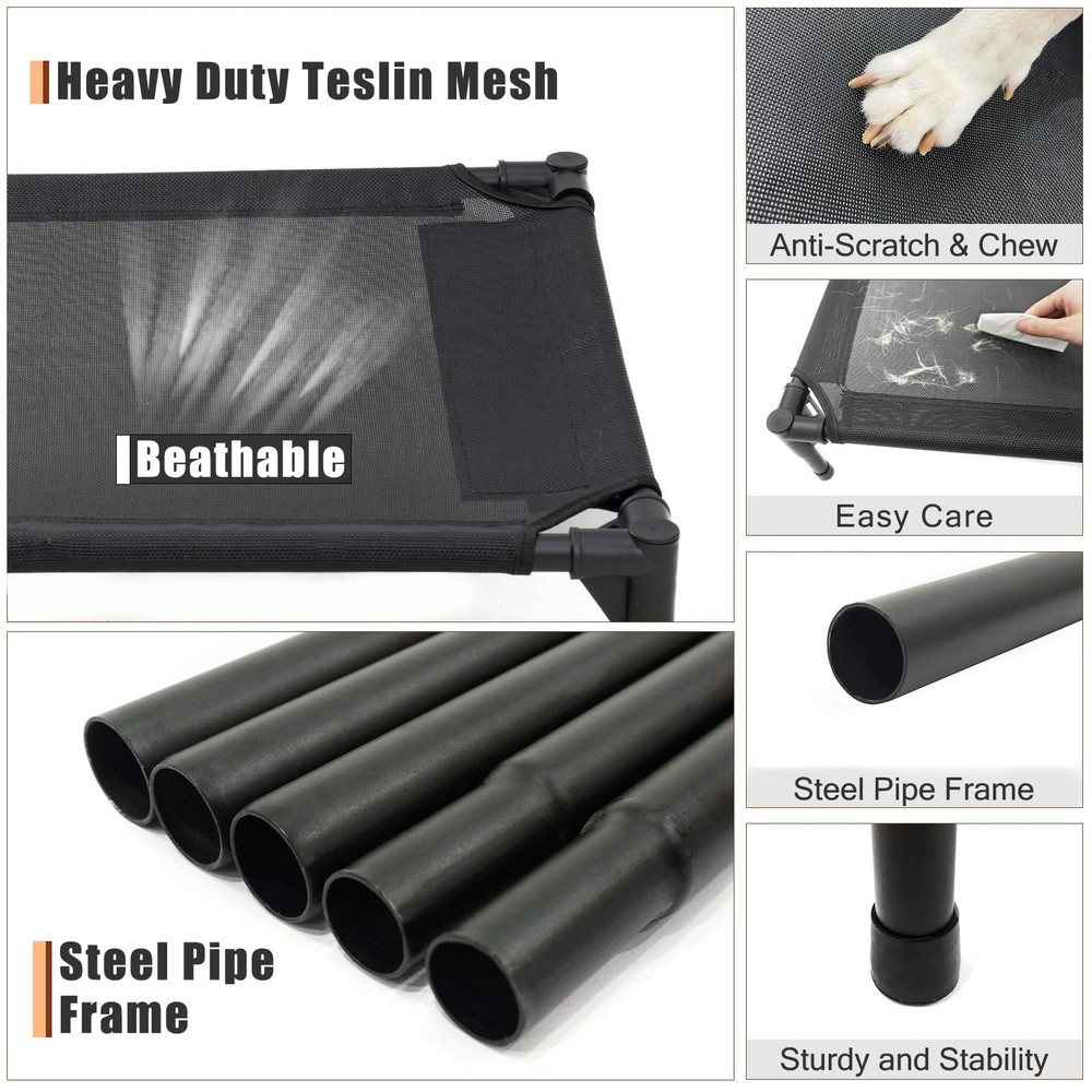 XL Elevated Dog Bed for Large Dogs, Extra Raised Dog Cot Beds, Heavy Duty Pet Cots with Durable Supportive Teslin Recyclable Mesh, Indoor & Outdoor Pet Bed Robust and Spacious Build: The elevated dog bed, made with Textilene mesh and powder-coated steel, is perfect for all breeds like Yorkshire Terrier, German Shepherds, Golden Retrievers, and Akitas, etc. Cooling Comfort Design: With a central mesh fabric, the raised dog bed promotes air flow, providing a cool spot for pets to relax in the heat. The heat-resistant, sturdy Textilene fabric ensures breathability and durability. Effortless Assembly: The outdoor dog bed requires no screws or wrenches for assembly. Its plug-in design makes it user-friendly, and its lightweight structure makes it perfect for indoor, outdoor, picnic, camping, and training scenarios. Stable Structure: With a powder-coated steel tube and durable Textilene fabric, this outdoor pet bed offers strong stability and high load-bearing capacity, eliminating fears of a sudden bed collapse. Year-Round Comfort: elevated dog bed provides cleaner, dryer, and healthier sleeping conditions compared to the ground. It keeps pets cool in the summer and cozy in the winter, promoting overall health and quality sleep.