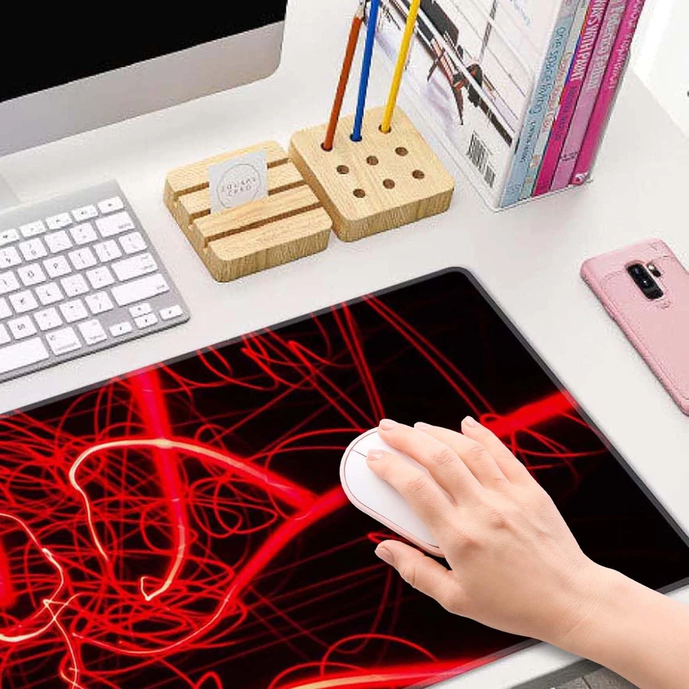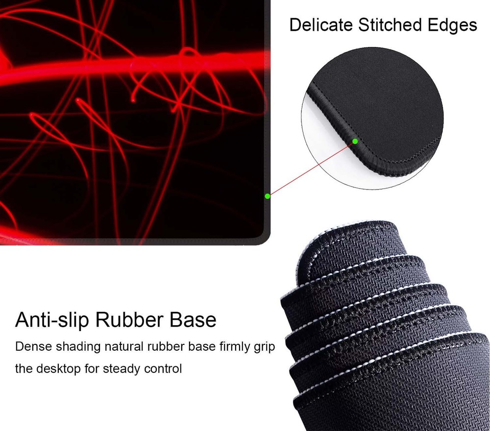 Welcome to Our store to order Mouse Pad.  Material:  Mouse Mat : Breathable fabric, comfortable Cloth Surface and Non-Slip Rubber Base  Features:  Non-toxic, no odor, harmless to health.  Fine-textured surface improves tracking mouse movements, non-slip rubber undersurface firmly grips the desktop.  At 3mm, it’s thick enough to protect and support your wrist and provide a soft, cushioned feeling and big enough to cover mouse movement.  Great Gift Choice :  A great desk organizer to keep your desktop clean, and also a beautiful desk decoration, ideal gifts for friends, colleagues, family or classmate. Extended Size: 31.5 x 11.8 x 0.12 inches (800mm x 300mm x3mm). Which is big enough to fit your full-sized keyboard, mouse, laptop,or other item on the desk,providing more space for professional gaming or office work. Non-Slip Rubber Base: The bottom base of the full desk mouse pad is made of good natural rubber, which is no harm to human heath. It will not have unpleasant smell compared with other wrist rest pads.Designed with dense textured rubber, the mouse pad will grip you desk firmly, avoid the random movement and provide stable operation for your mouse/keyboard. Stitched Edges: The desk mouse pad has delicate stitched edges,the latest stitching technology ensures that the mouse pad will not wear or deform during use. Ultra-smooth Surface: With Comfortable Cloth Surface and Breathable Material to the pads. Making your mice glide on its surface effortlessly, which can provide optimum speed and accurate control during your working or gaming. Great Gift Choice : A great desk organizer to keep your desktop clean, and also a beautiful desk decoration, ideal gifts for friends, colleagues, family or classmate.