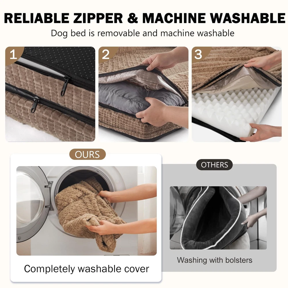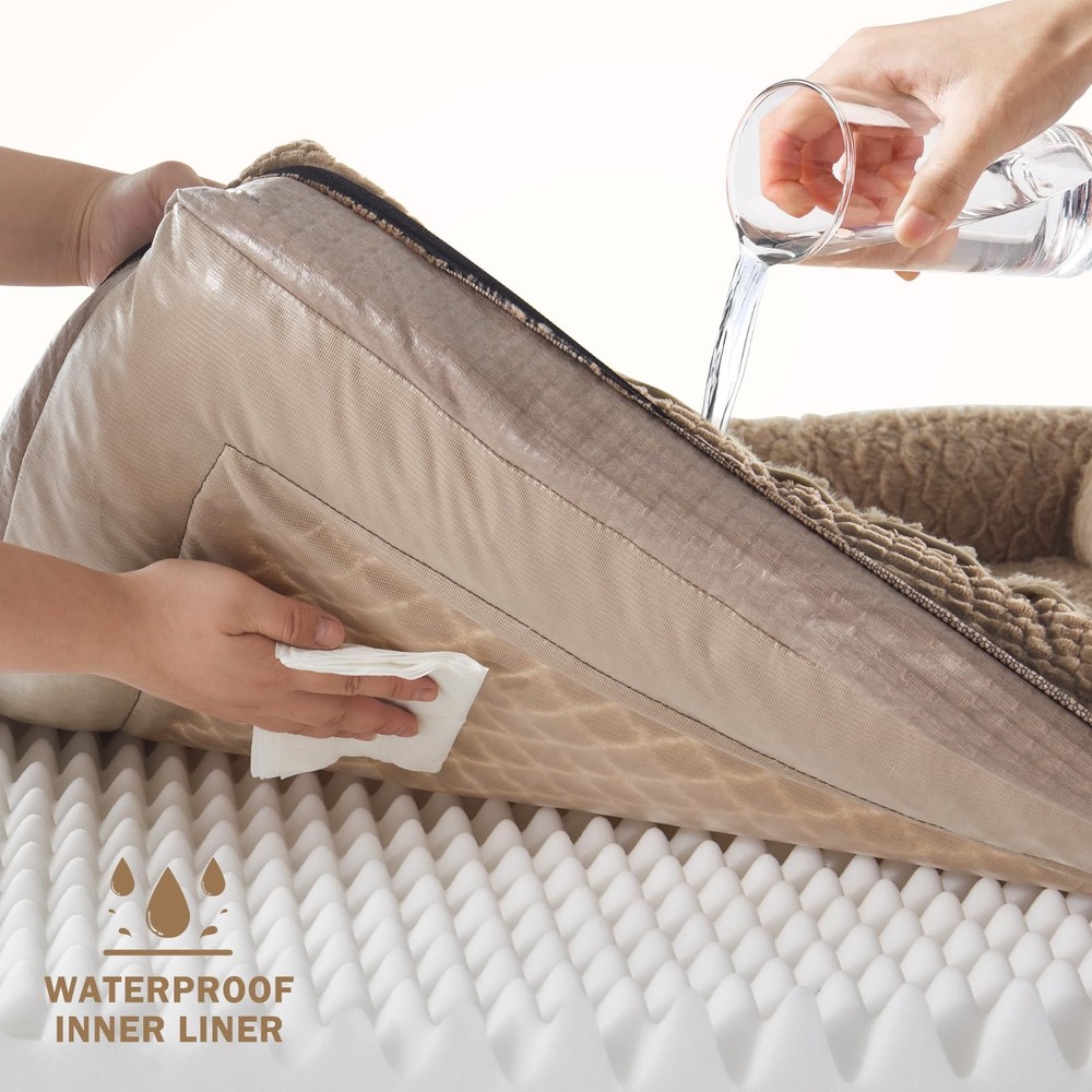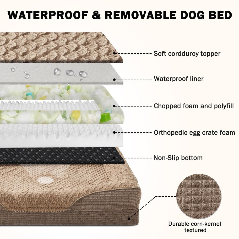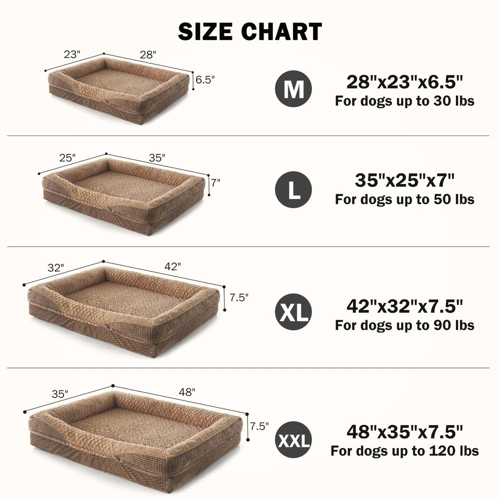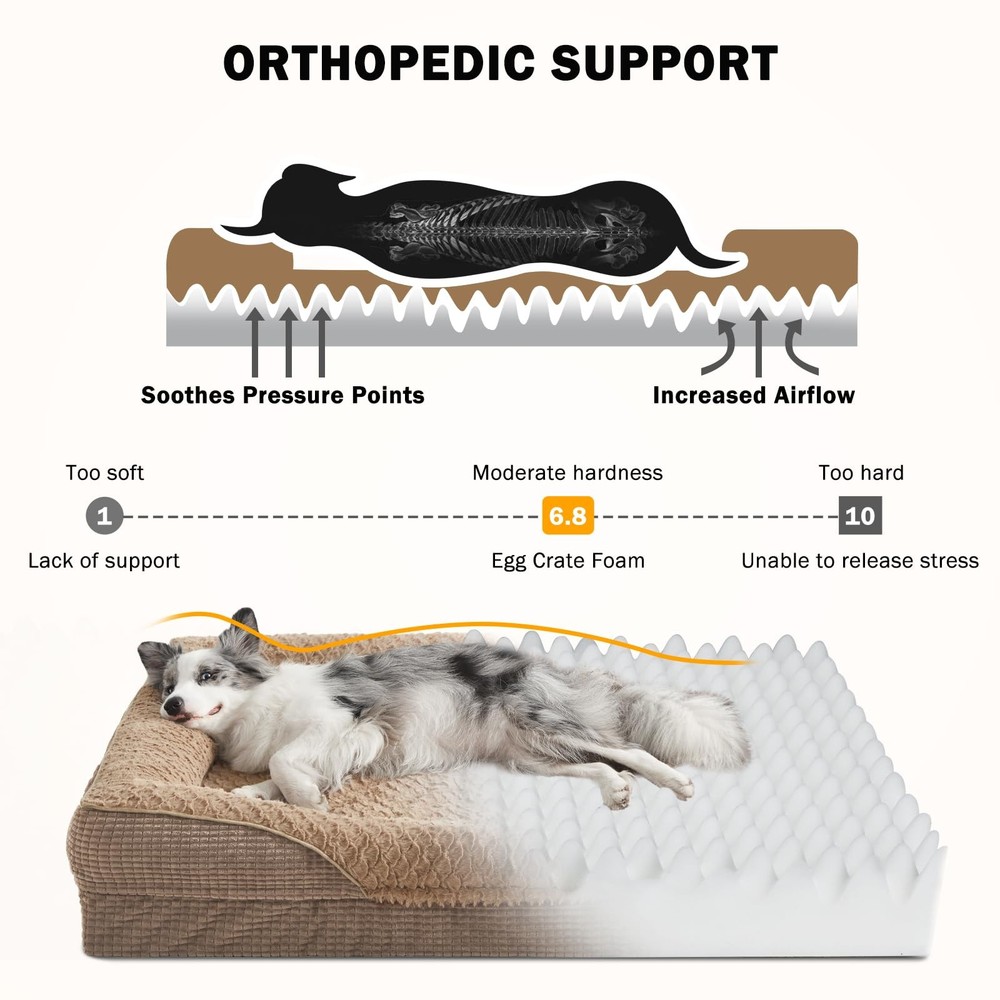 Orthopedic Dog Beds Large Sized Dog, XL Washable Dog Bed, Egg-Crate Memory Foam Dog Couch Bed with Washable Removable Cover, Waterproof Lining and Nonskid Bottom 🐶COMFORT AS PRIORITY: Large Dog bed with four-sided wrapping design creates a cozy and inviting space that promotes comfort and security, offering your pet a variety of cozy positions to snuggle. The full-surround design makes the dogs feel more secure lying in it. The 4-sided adopts supportive chopped foam and soft polyfill bolster adds extra support to your pet's neck and head on for optimum lounging comfort. 🐶ORTHOPEDIC SUPPORT: Orthopedic dog bed features 3.5 inch high-density egg crate foam and memory foam soothes pressure points helps distribute weight evenly and provides great support for aching joints and muscles so pets can enjoy a more restorative night's rest. While supportive chopped foam and soft polyfill bolsters surrounds your pet's neck and head, providing extra comfortable support for your dog's neck and head. Soothing and relaxing to help your dog sleep better. 🐶WATERPROOF & WASHABLE DOG BED: The dog bed features a fully removable, machine-washable cover with a smooth double zipper for easy to quick remove and care, so just throw it in the washing machine and will be as good as new, ensuring your pet's space stays fresh and hygienic. The waterproof inner lining on the back of the dog bed cover fully protect the egg crate foam from spills, water damage, or accidents, prolonging the product's life. 🐶ULTRA COZY SLEEP SURFACE: The sleeping surface of the dog beds large sized dog features luxurious Fish scale pattern plush make it super soft, cozy and not easy to shedding, the skin-friendly and comfortable surface provides a calm and anti-anxiety feeling for your pet, allowing pets to fall into a deep sleep. The durable corn-kernel textured exterior ensures long-lasting use. 🐶SIZE DETAILS: Orthopedic Dog Bed, Medium, 28" x 23" x 6.5" (3.5" Base Foam Height; Sleep Surface: Approx. 20.5" x 19") For Dogs Up to 30 lbs. Large - 35" x 25" x 7" (3.5" Base Foam Height; Sleep Surface: Approx. 26.5" x 20") For Dogs Up to 50 lbs. Extra Large - 42" x 32" x 7.5" (3.5" Base Foam Height; Sleep Surface: Approx. 34" x 27.5") For Dogs Up to 90 lbs. XXL -48" x 35" x 7.5" (3.5" Base Foam Height; Sleep Surface: Approx. 39.5" x 31") For Dogs Up to 120 lbs. The large dog bed is vacuum-packed for shipping—please allow up to 6 hours to fully expand and regain its original shape after opening. 🐶NON-SLIP BOTTOM: There are non-slip rubber particles at the bottom of this dog bed, which can be fixed on the floor to ensure that the dog will not slide easily when playing or sleeping on the dog beds for dogs, providing the dog with a sense of security.