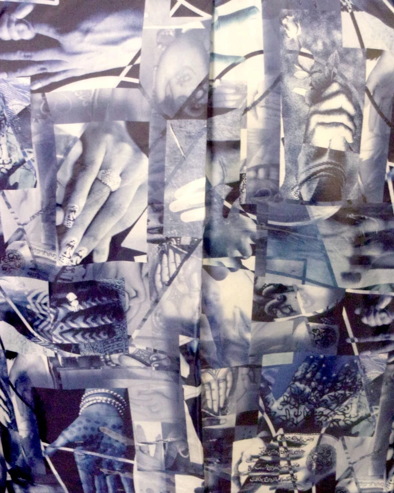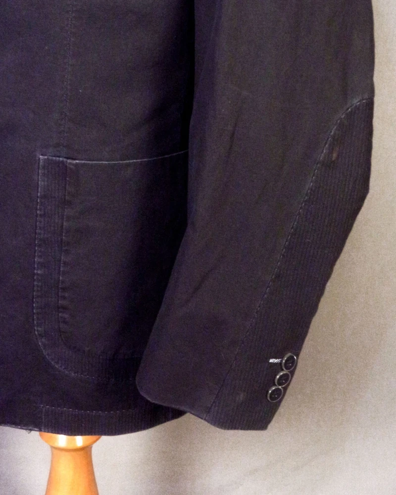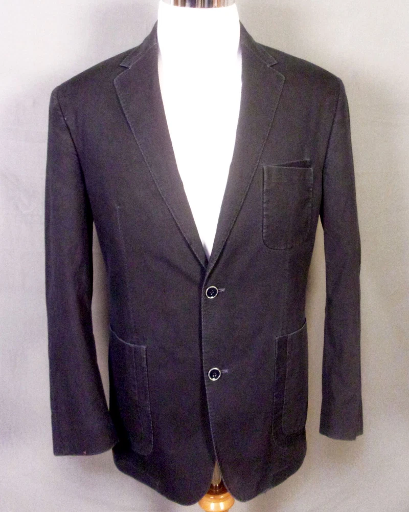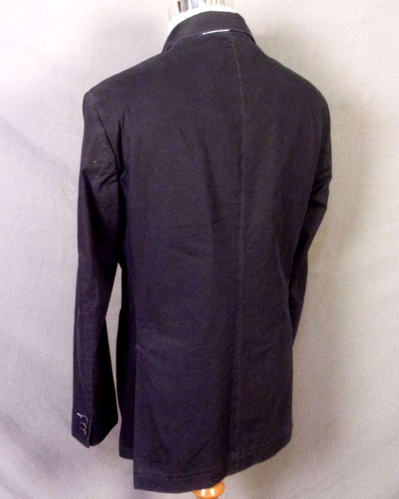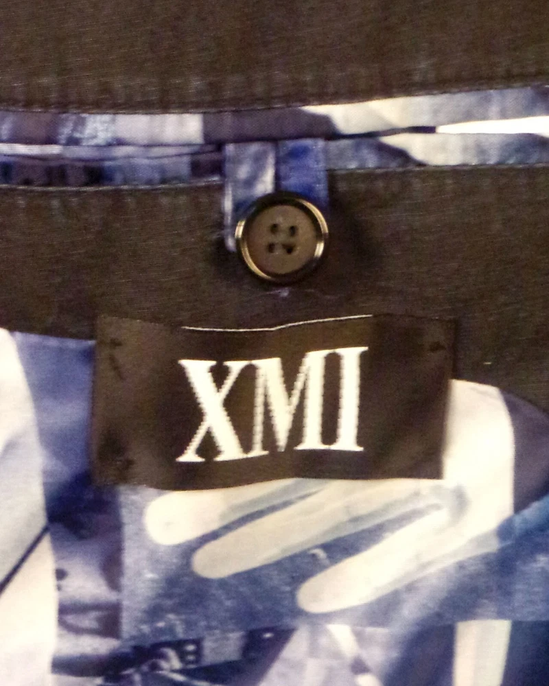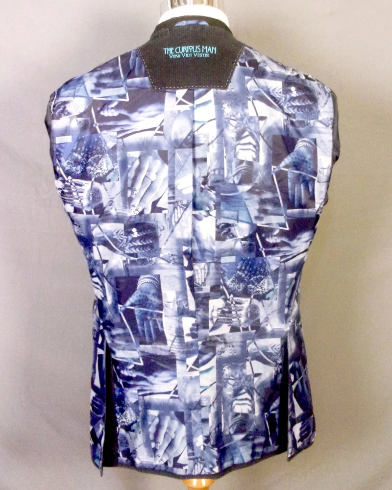 Looks awesome - very rare casual all cotton shell blazer by the brand XMI, who primarily makes men's ties/neckties. This blazer has more of the casual going out / club type look to it with pretty deluxe trim with some kind of different geometric aspects to the pocket designs/trim design along the sleeves. It has a two button front with notch lapels, the sleeve cuffs have three buttons each with a single faux working button on each. The interior is wild; it's fully lined with an abstract real photo print collage of about anything you could imagine revolving around hands and fingers? Very different. It has solid interior labels and info, then lastly dual vents in the rear. Measurements: Chest: 46 Waist: 43 Sleeve length: 24.75 (1.5 extra inches to let out) Length: 31 Lapels: 3 Shoulders: 19
