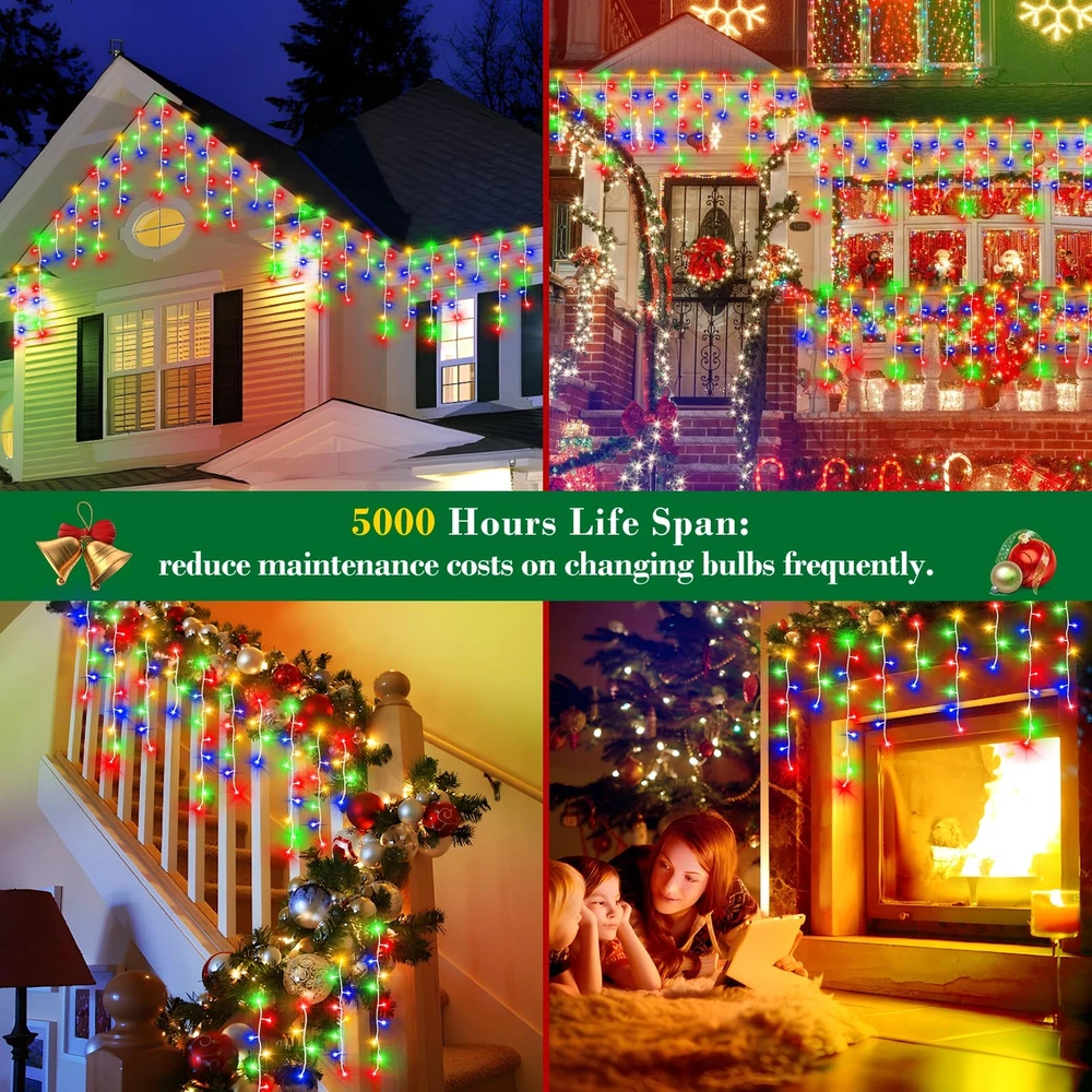XURISEN 640 Xmas LED for Christmas Decoration Multicolor Christmas Decoration Ice Lights: These Ice String Lights are 66ft long with 120 drops, and they feature 640 quality crystal clear led lights.You can connect extra 66ft long strip for larger decorating projects too.HANGING FROM ROOF LINES, PORCHES FENCES AND RAILINGS,IT WILL INSTANTLY TRANSFORM YOUR DECORATED SPACE INTO FUN, RELAXING, COZY AND FESTIVE. 8 Lighting Modes: You can choose from 8 different lighting modes (Combination, In Waves, Sequential, Slo-glo, Chasing/Flash, Slow Fade, Twinkle/Flash, and Steady On.) for an extra festive display.CUSTOMIZE YOUR OWN MOOD LIGHTING,MAKING THE HOLIDAYS SPECIAL THIS YEAR WITH SOME BRIGHT LIGHTS AND COLORFUL CHEER. Timer and Memory Function: The outdoor Christmas lights built in timer function:6 hours on 18 hours off.Memory function can recover from the previous setting mode when you restart. Plug the led outdoor christmas lights into an outdoor timer, preferably one that automatically turns on when it gets dark out. UL Listed For Outdoor: XURISEN brand Christmas fairy string lights are IP44 waterproof and built to stand up against harsh environmental elements while maintaining safe connections.NOVEL AND CLASSIC DESIGN,IT’S PERFECT FOR DECORATING CHRISTMAS,NEW YEAR,ANNIVERSARY, BIRTHDAY ,VALENTINE'S DAY, WEDDING,ETC. High-End Christmas lights: The 8 modes are carefully designed to provide a variety of choices while greatly reducing energy consumption. The timer function precisely controls the time of use, realising the efficient use of energy and contributing to sustainable development.