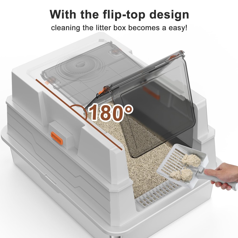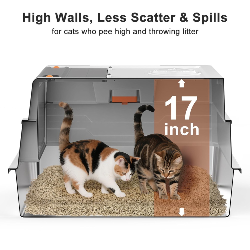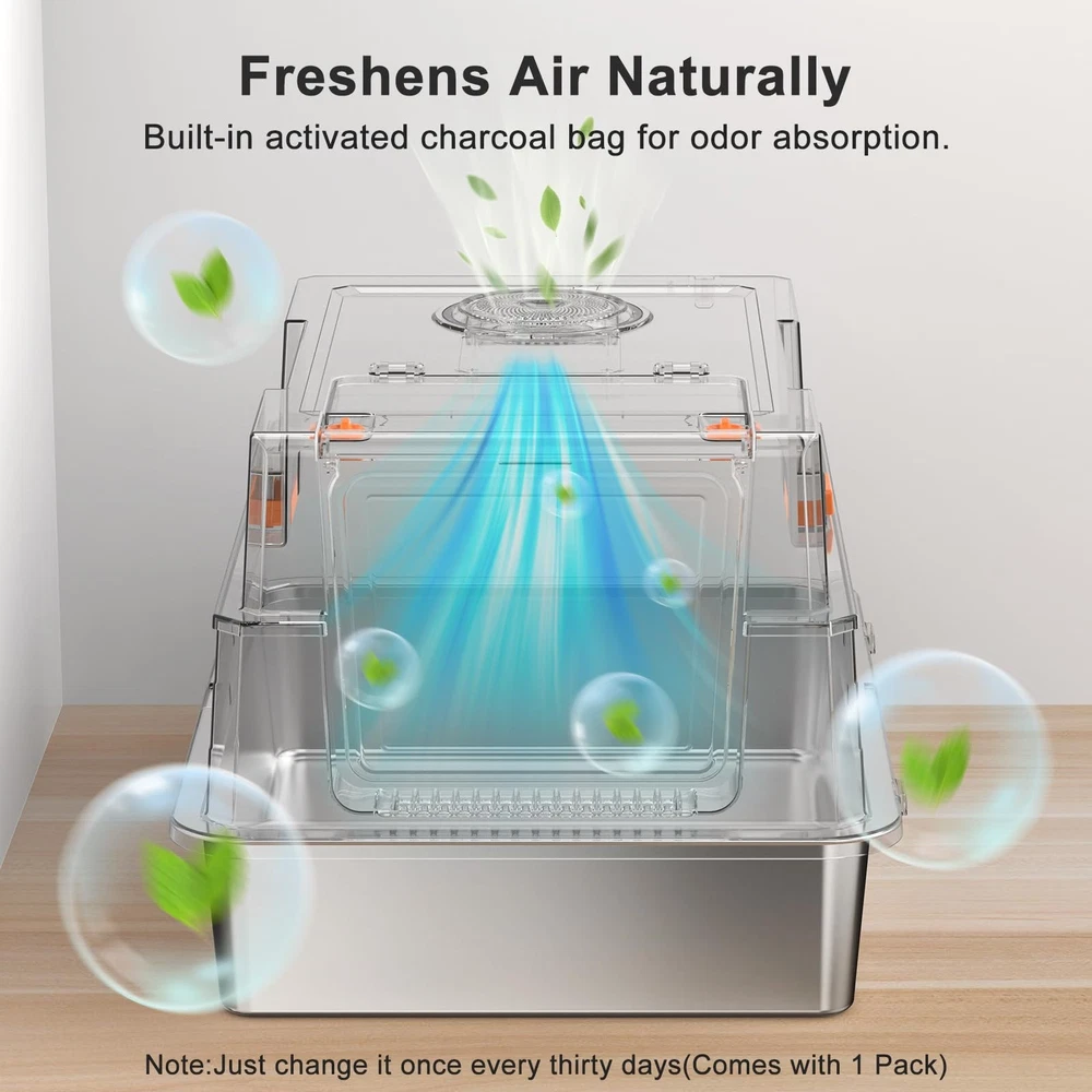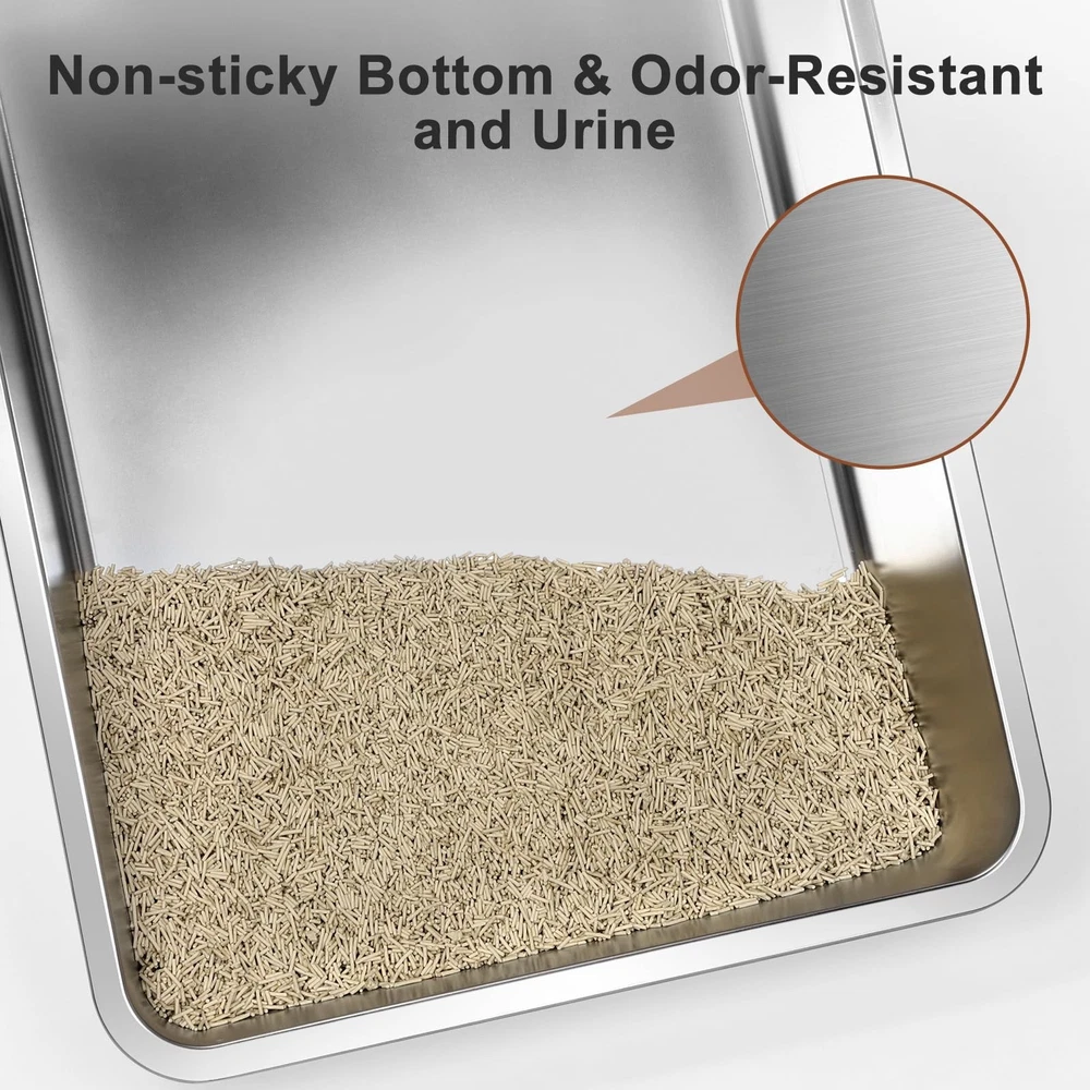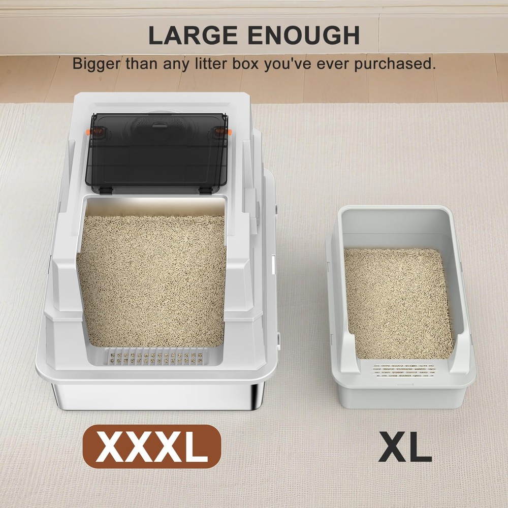 Transform your cat's bathroom experience with this premium XXL stainless steel enclosed litter box. The enclosed design helps contain scatter and provides your cats with the privacy they naturally prefer. Designed specifically for multi-cat households and larger felines, this spacious enclosure offers ample room for comfortable use. The stainless steel construction paired with a non-stick bottom makes cleaning a breeze - no more struggling with stuck-on litter or lingering odors. The enclosed design helps contain scatter and provides your cats with the privacy they naturally prefer. Perfect for households with multiple cats or single larger cats who need extra space to move comfortably. The durable stainless steel material ensures long-lasting performance and resists wear and tear better than traditional plastic boxes. Its generous dimensions accommodate cats of all sizes, while the sleek design complements modern home decor. Say goodbye to frequent replacements of plastic litter boxes and hello to this sturdy, practical solution for your feline family members. ENGINEERED FOR STRESS-FREE SCOOPING:No dismantling required! This extra large stainless steel litter box with lid features a reinforced 180° flip-top that stays securely open during scooping. GIANT EXTRA LARGE LITTER BOX: Spacious XXXL size perfect for multi-cat households or large cats, providing ample room for comfortable use and easy movement. ENCLOSED STRUCTURE: extra large Full enclosure helps contain scatter, control odors, and provide privacy for your cats while maintaining a tidy space. SUPERIOR URINE-CONTAINMENT ENCLOSURE:Designed for vigorous diggers: 17" high sided litter box walls with overlapping panels guide liquid back into the basin. Inverted plastic guards lock tightly against the metal litter box frame, blocking side leaks even when cats spray at angles – a truly leak-proof litter box enclosure. ODOR-FIGHTING CARBON ZONE:The top of this stainless steel cat litter box with lid has a dedicated area for charcoal bags to neutralize ammonia smells. (Note: Change bags once every 15 days – Comes with 1 Pack). A must-have feature for any enclosed stainless steel litter box. 11”W*10” H EASY ACCESS: Wide entrance allows cats of all sizes to enter and exit comfortably while maintaining the enclosed design benefits. MULTI-CAT FRIENDLY: Ideal size and durability for households with multiple cats, ensuring less frequent cleaning and maintenance.