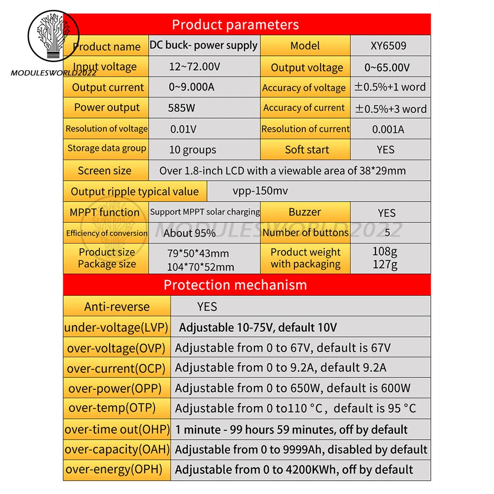 Store Categories Store Categories Other Product View Details Features: 1. Support serial communication, standard MODBUS protocol, support firmware upgrade 2. One-piece frosted panel, high-quality aluminum alloy screw cap feel good 3. The display board adopts immersed gold design, better conductivity and durability against oxidation. 4. The shell adopts one-piece injection molding shell, flame-retardant material is safer. 5. Built-in buzzer button prompts, alarm prompts have an echo of everything! Parameter: Input voltage: 12.0~72V Output voltage: 0.~65V Output current: 0~9.000A Output power: 585W Voltage accuracy: +0.5%+1 word Current accuracy: +0.5%+3 words Voltage resolution: 0.01V Current resolution: 0.001A Conversion efficiency: about 95% Soft start: Yes MPPT function: support MPPT solar charging About the protection mechanism: Input anti-reverse connection: Yes Input undervoltage protection (LVP): 10-75V adjustable, default 10V Output over-voltage protection (OVP): 0-67V adjustable, default 67V Output overcurrent protection (OCP): 0-9.2A, default 9.2A Output over power protection (OPP): 0-650W adjustable, default 650W Over Temperature Protection (OTP): 0-110 ℃ adjustable, default 95 ℃ Overtime protection (OHP): 1 minute-99 hours and 59 minutes, default off Over capacity protection (OAP): 0-9999Ah adjustable, default off Over-energy protection (OPH): 0-4200KWH adjustable, default off Package include: DC step-down power supply *1 Shipping Policy Payment Method Returns Policy Shipping Policy Payment Method Returns Policy Home Payment Shipping About us Contact us Copyright©2018 datacaciques Home Payment Shipping About us Contact us Store Categories Store Categories Other Product View Details Features: 1. Support serial communication, standard MODBUS protocol, support firmware upgrade 2. One-piece frosted panel, high-quality aluminum alloy screw cap feel good 3. The display board adopts immersed gold design, better conductivity and durability against oxidation. 4. The shell adopts one-piece injection molding shell, flame-retardant material is safer. 5. Built-in buzzer button prompts, alarm prompts have an echo of everything! Parameter: Input voltage: 12.0~72V Output voltage: 0.~65V Output current: 0~9.000A Output power: 585W Voltage accuracy: +0.5%+1 word Current accuracy: +0.5%+3 words Voltage resolution: 0.01V Current resolution: 0.001A Conversion efficiency: about 95% Soft start: Yes MPPT function: support MPPT solar charging About the protection mechanism: Input anti-reverse connection: Yes Input undervoltage protection (LVP): 10-75V adjustable, default 10V Output over-voltage protection (OVP): 0-67V adjustable, default 67V Output overcurrent protection (OCP): 0-9.2A, default 9.2A Output over power protection (OPP): 0-650W adjustable, default 650W Over Temperature Protection (OTP): 0-110 ℃ adjustable, default 95 ℃ Overtime protection (OHP): 1 minute-99 hours and 59 minutes, default off Over capacity protection (OAP): 0-9999Ah adjustable, default off Over-energy protection (OPH): 0-4200KWH adjustable, default off Package include: DC step-down power supply *1 Shipping Policy Payment Method Returns Policy Shipping Policy We will arrange shipping for you within 24 Hours after payment cleared except the holidays. -We ship items to Worldwide. Thank you! -we will ship out the order in 1-2 business days after payment cleared .Since it is international shipping ,delivery time is about 15--28 business days to arrive to most countries. Payment Method We accept PayPal payment ONLY, and must be received within 5 days from the date of purchase. 2. It is easy and safe for you to pay by credit cards, debit cards, bank transfers and PayPal account balances. 3.Buyers are responsible for import duties,custom fees and taxes, if any, please check your country. Returns Policy 1.We believe our items are so outstanding. We are convinced you will be happy with your Purchase. 2. If you do not satisfy with our items. Please simply return to us within 30 Days in original condition. Just pay for the returned postage. Then we can issue full refund or resend the item to you after the returned item arrived at our warehouse. 3. Please include your eBay ID and item number with any email requests.
