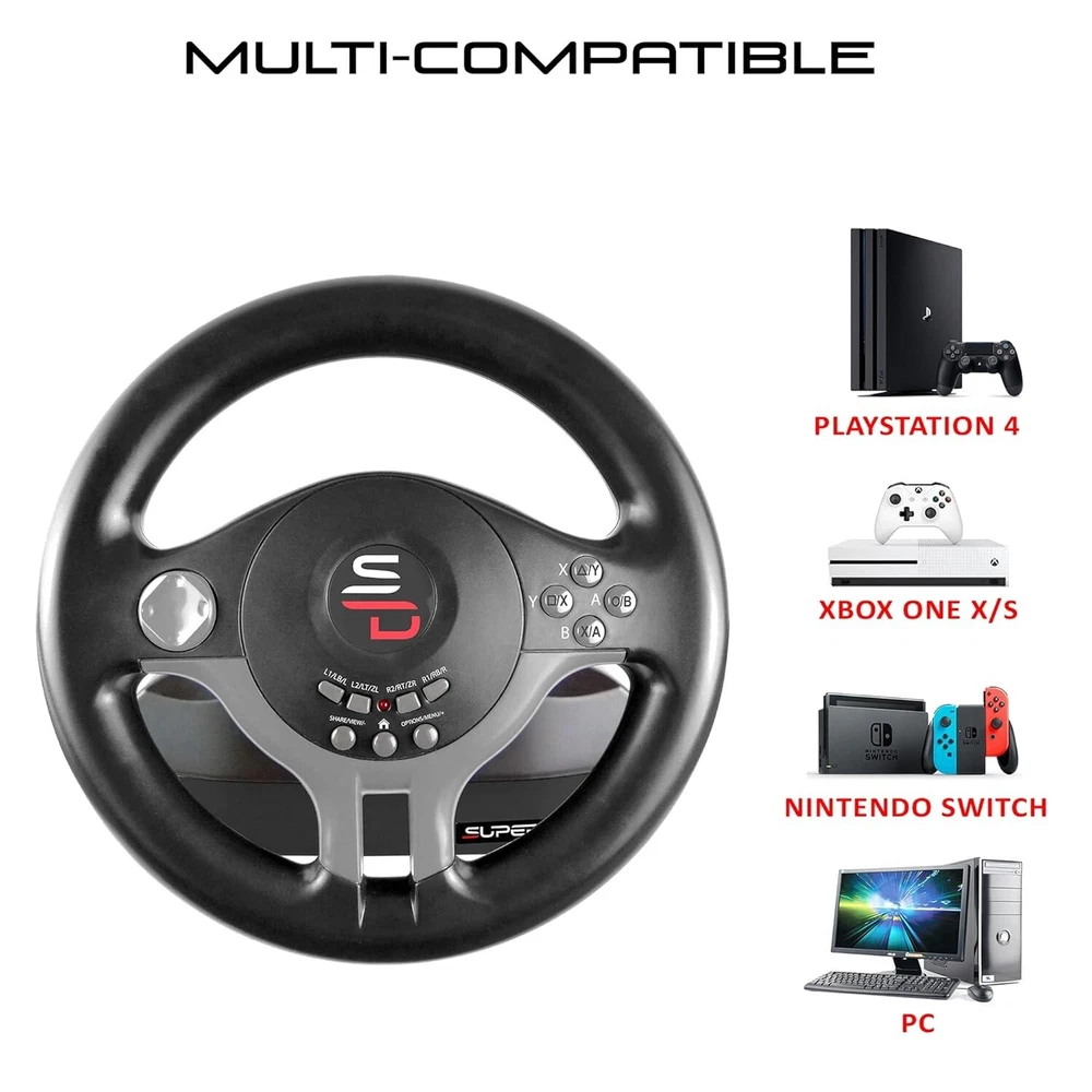 Multi-plateform compatible steering wheel for Switch, PS4, Xbox Serie X/S, Xbox one, PC and PS3. Wired steering wheel, with 180° rotation. Steering wheel with pedals (2) and paddles (+/1) for gear shifting. Sensitivity adjustment with 3 modes. Steering wheel with vibration. Thanks to its programming function, the Superdrive SV250 is compatible with all games on the market: Gran Turismo Sport - Forza motor sport 7 - Drive club - Project Cars - Forza Horizon - GTA V - Farming Simulator. Attaches with suction cups