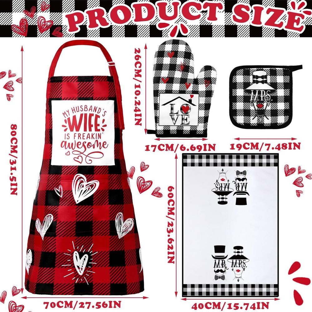 Features: The engagement gifts for couples are suitable for both experienced people and beginners, helping them keep clothes away from dirt and burns while baking. The wedding anniversary gifts are convenient for storage, also portable for you to carry out with, without taking up too much space. Specifications: Material: polyester material Color: as shown in the picture Package includes: 2 x Couples aprons sets 2 x Baking oven mitts 2 x Potholders 2 x Towels Notes: Manual measurement, please allow slight errors on size. The color may exist a slight difference due to different screen displays. Words printed on our products are only for decorating, not as trademarks, Our product is not suitable for sensitive skin. Test whether there is any allergy on a small part of your skin before use. Nice Combination: you will receive 2 pieces of Valentine's Day couples aprons sets, 2 pieces of baking oven mitts, 2 pieces of potholders and 2 pieces of towels; They are adequate in quantity, can well meet your daily use, and sharing needs Widely Applicable: the Valentine's Day aprons for women are suitable for couples, lovers to use, you can apply them for cooking, grilling, picnics, parties, camping and more, they are just what your lover need when he or she wants to show off their cooking skills Exquisite Design: the Mr and Mrs aprons sets are printed with heart warming words and interesting patterns, interesting and lively, the colors are elegant, can be machine washed; The apron is quite practical and will not deform, shrink or wrinkle easily, can cover from your chest to your knee, thus keeping you away from dust, oil, you can use it with confidence Fine Workmanship: the Christmas bridal shower gifts are made of polyester material, not easy to tear or fade, the apron is designed with large pocket and adjustable shoulder straps, suitable for most couples to wear, serviceable for long time use; The apron, mitt and potholders can bring you much convenience when you are cooking, gardening, picnic, camping and so on, keeping your clothes clean and tidy Kitchen Cooking Apron Gift Set: the Christmas gift for wedding couples can be applied as gifts for birthday, bridal shower, housewarming parties, wedding, engagement, anniversary, Valentine's Day to your wife, husband, girlfriend, boyfriend, lover, showing your love and care