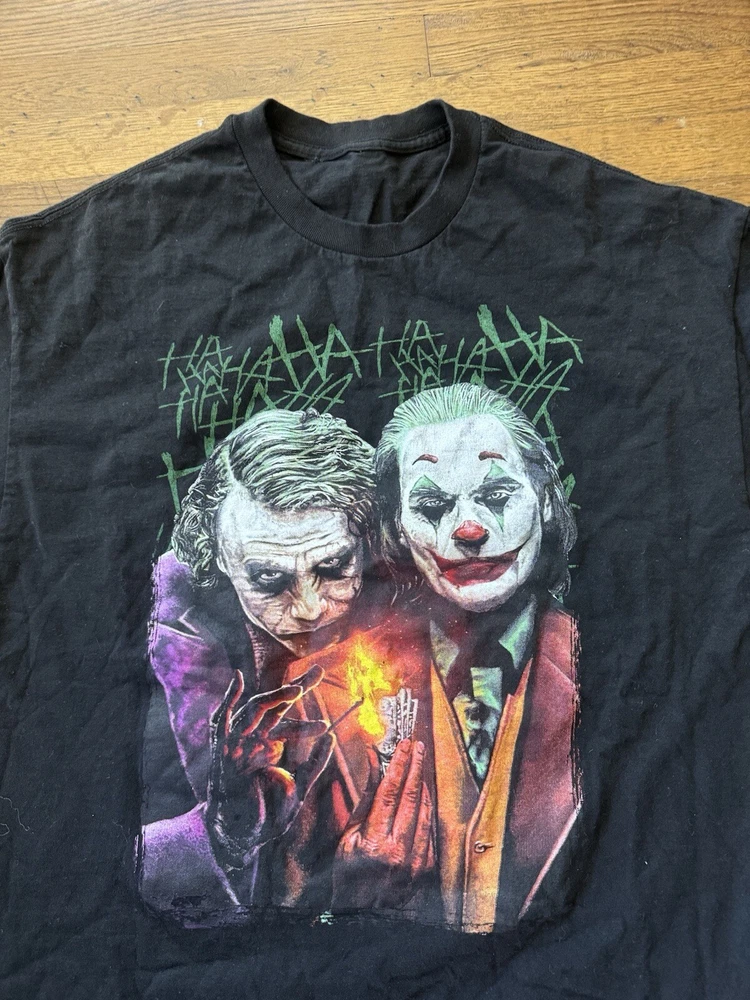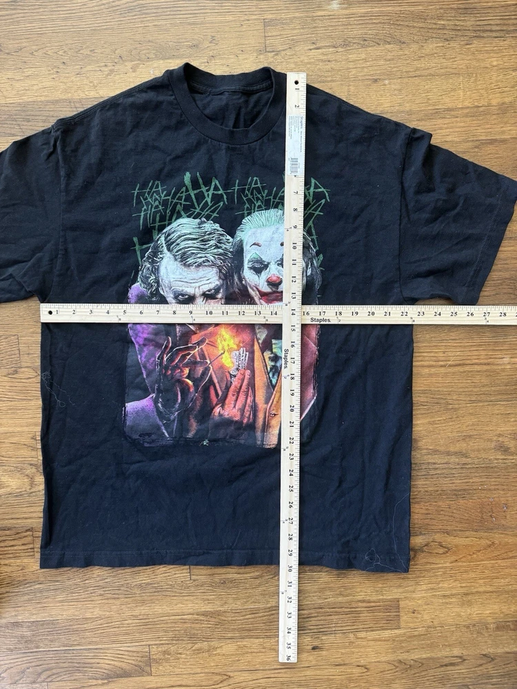 Get ready to laugh out loud with this Y2K 00s Joker Ha Ha Ha T-Shirt. Featuring Batman's iconic Joker character, this shirt is perfect for any fan of the classic comic book. Made from comfortable cotton material, this shirt is easy to care for and can be machine washed. The shirt is a size XL and has a regular fit, making it a great choice for any man's wardrobe. The black color and multicolor design make it a versatile choice for any season. Whether you're looking to show off your love for the USA or just want to add a unique piece to your collection, this shirt is sure to turn heads.