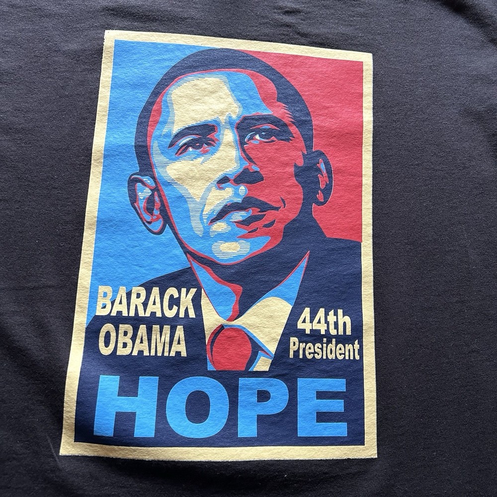 This Y2K Barack Obama 44th President 'Hope' Black T-Shirt in size L by Delta is a stylish and iconic piece of apparel. The regular fit and short sleeves make it comfortable for everyday wear, and the black color adds a sleek and versatile touch. Perfect for men who appreciate political history and making a statement with their fashion choices. This shirt is a timeless piece that captures a significant moment in American history.