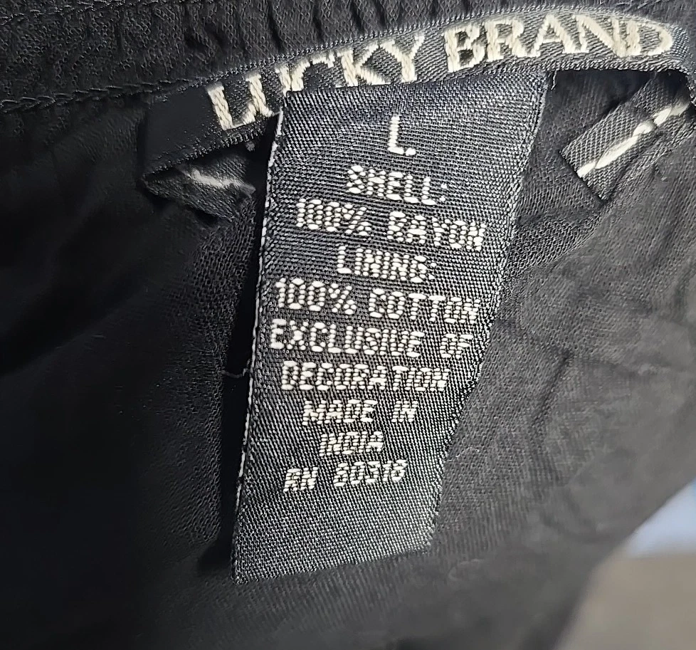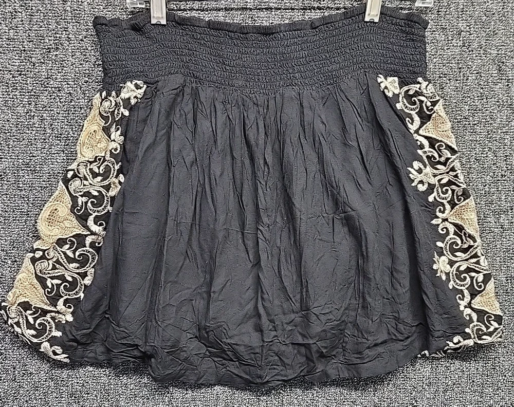 Country/Region of Manufacture: China Vintage: No Personalize: No Rise: Mid Size: L Handmade: No Type: Skirt Accents: Embroidered, Ruffle Brand: Lucky Brand Color: Black, Gold Occasion: Casual, Party/Cocktail, Travel Theme: 80s, 90s, Bohemian, Denim, Hippie Size Type: Regular Features: All Seasons Fabric Type: Linen Style: Peasant Pattern: Floral Season: Fall, Spring, Summer Character: Hippie Skirt Length: Short Department: Women Closure: Zip Material: Linen