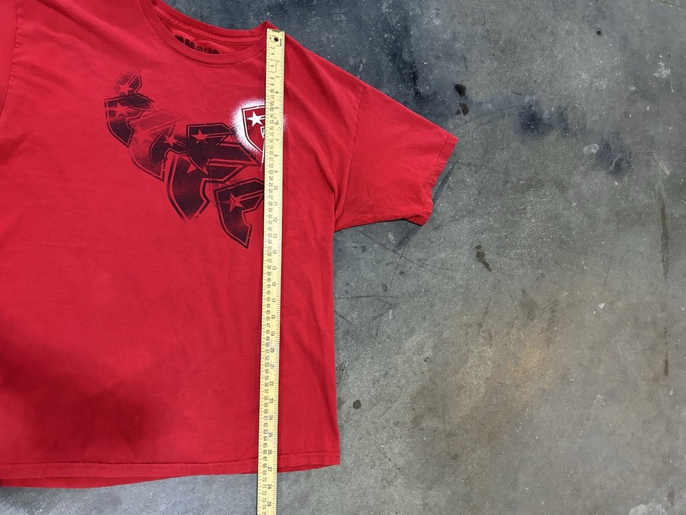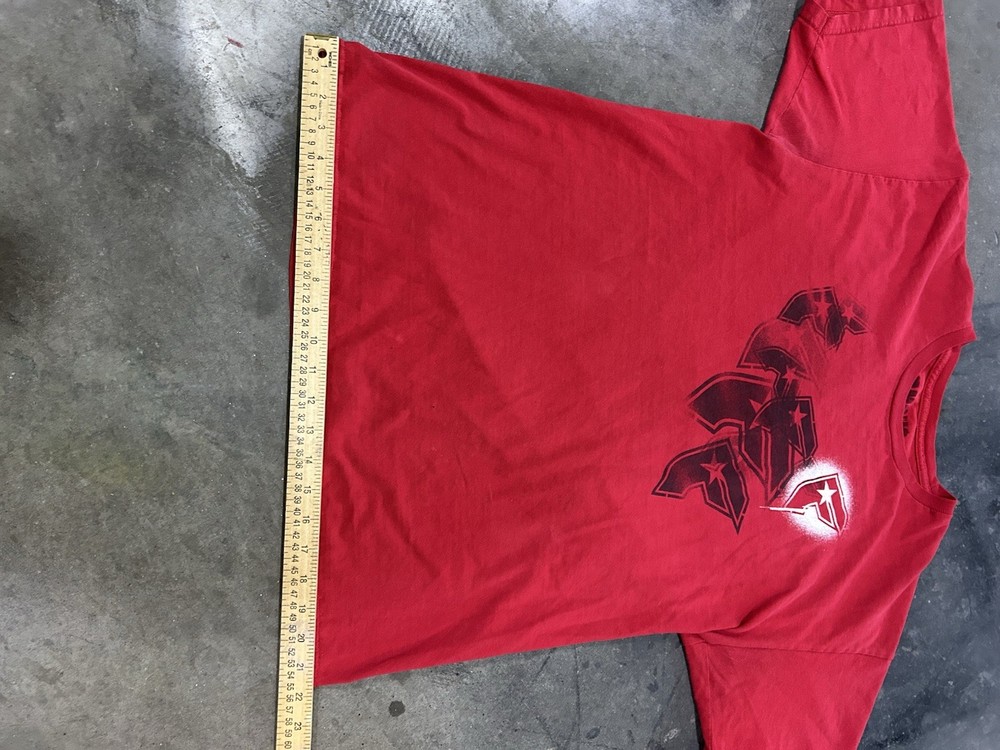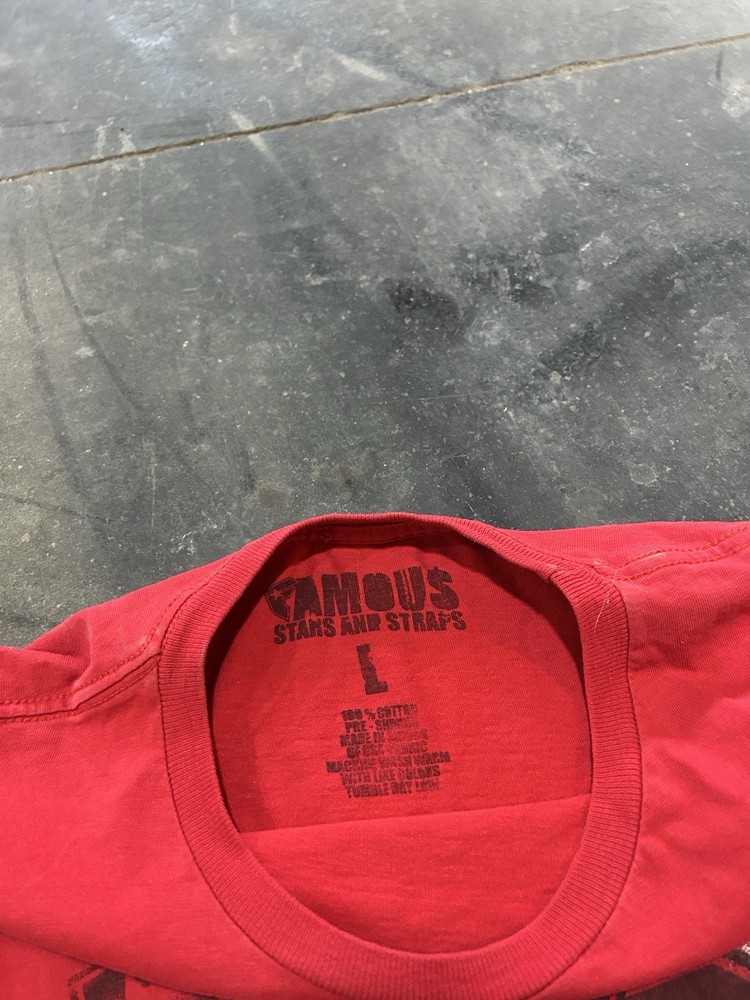 The Y2K Famous Stars and Straps "Size L" T-shirt is a vintage garment with a graphic print featuring the iconic stars and straps motif. Made of cotton and featuring a crew neck and short sleeves, this red shirt is perfect for the warmer seasons of summer, fall, and spring. The size L and regular fit ensure a comfortable and stylish look for men looking to add a touch of nostalgia to their wardrobe. The machine washable knit fabric makes it easy to care for, making this shirt a must-have for any collector of iconic Y2K fashion.