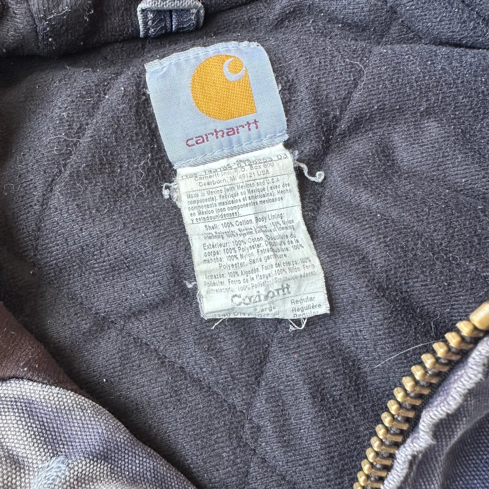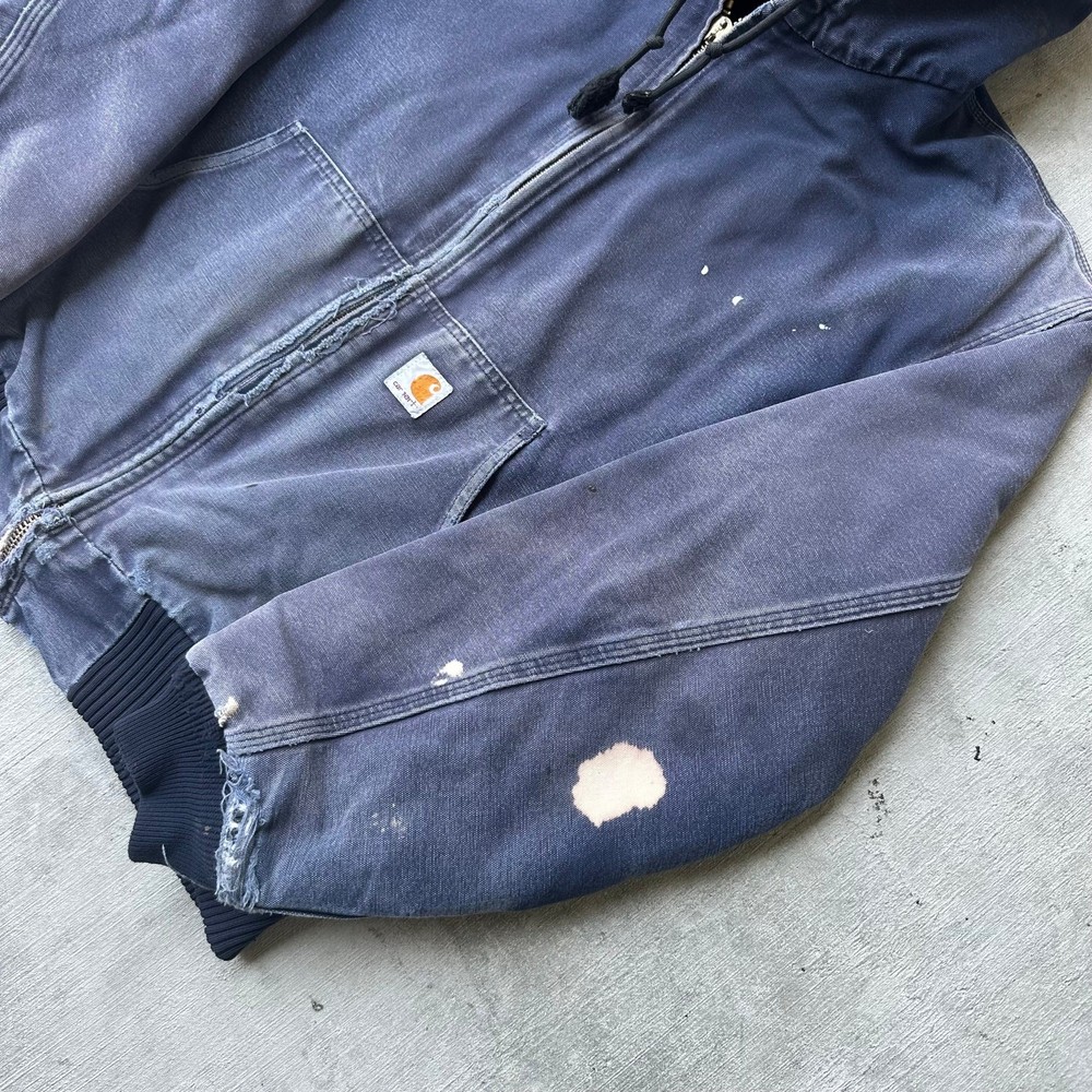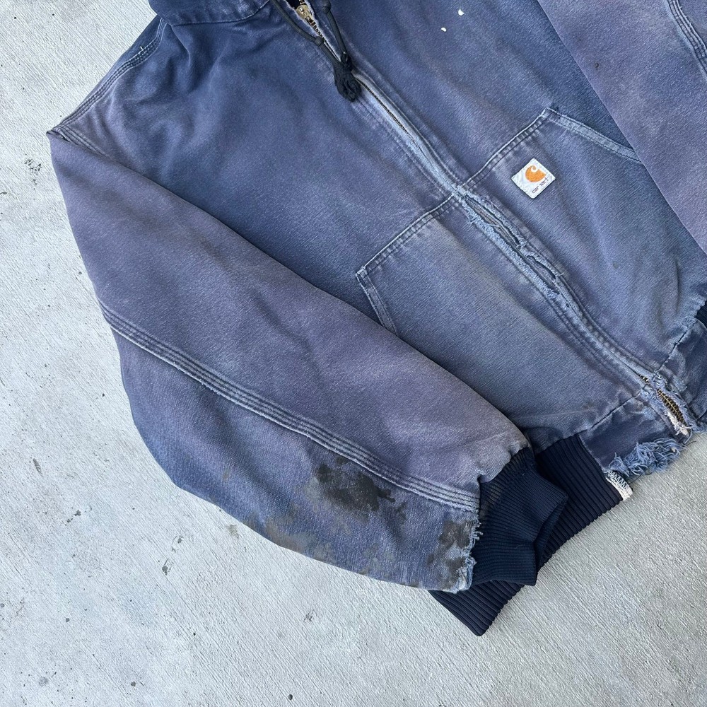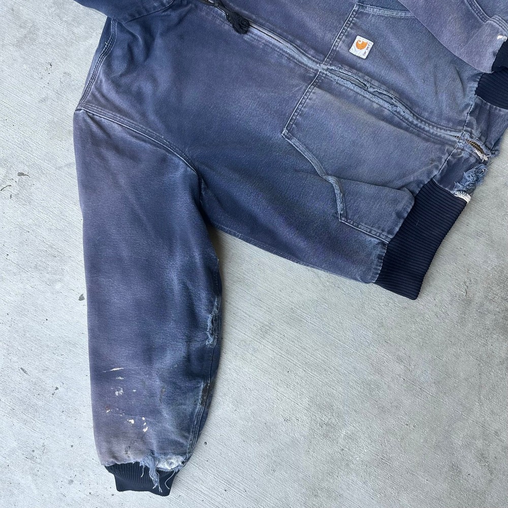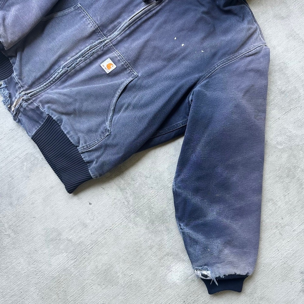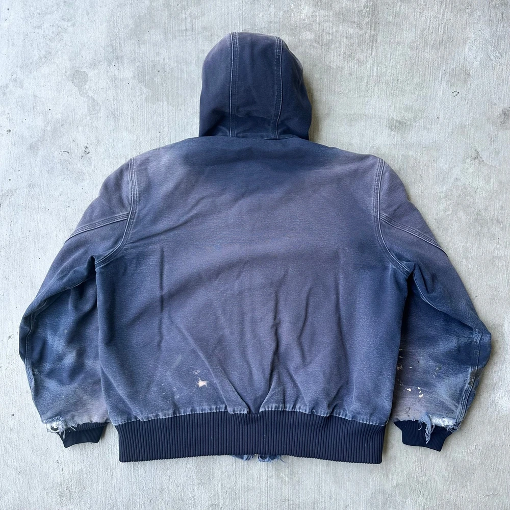 Vintage Y2K blue DISTRESSED Carhartt hooded work wear jacket. Great wear on this one! Fading, staining, and ripping all present throughout. Missing zipper pull tab but functions great! Measures 26.5x27.5. Please check measurements before purchasing. I do my best to show any flaws in pictures. Quick shipping! Bundles encouraged! @ants_haul on Instagram. 2A!!!