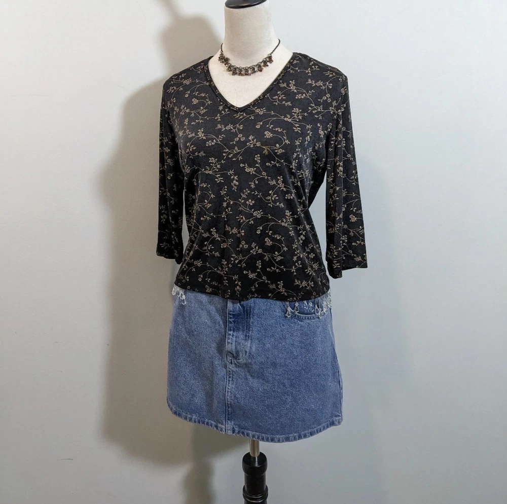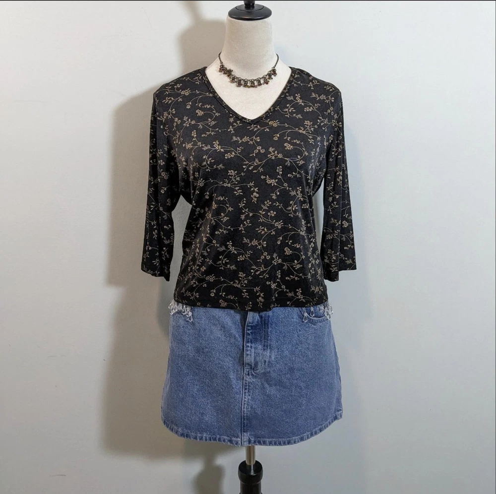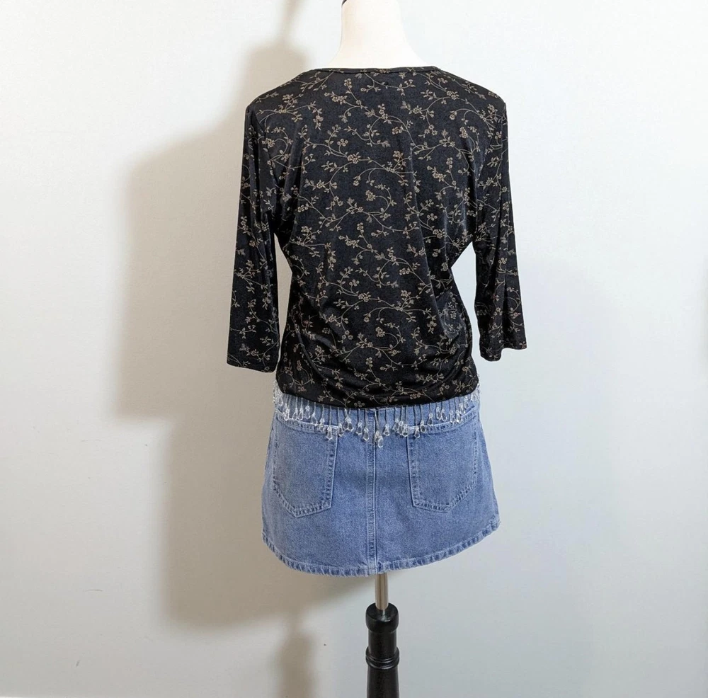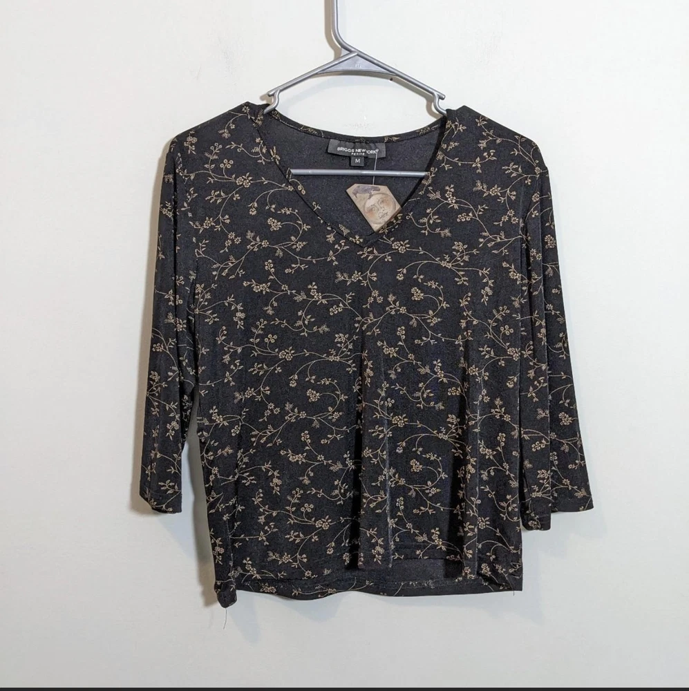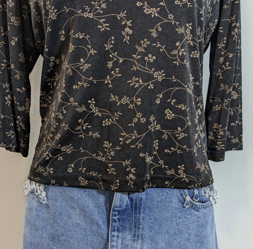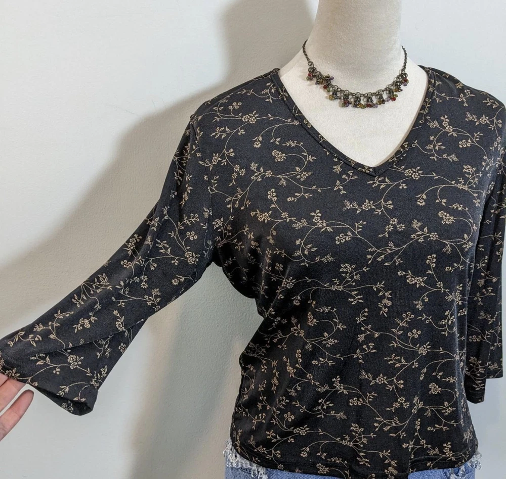 Y2k crop top Vintage y2k coquette boho black floral petite medium pullover blouse Vtg 00s whimsigoth black 3/4 sleeves medium cropped shirt Tagged: petite medium, fits small to medium Pit to pit: 21" Length: 21" E23 Condition: excellent vintage condition Made by: Briggs of NY Fit: cropped boxy, 3/4 sleeves Fabric: polyester spandex blend Stretch: yes Weight: lightweight Closure: pullover Pockets:no