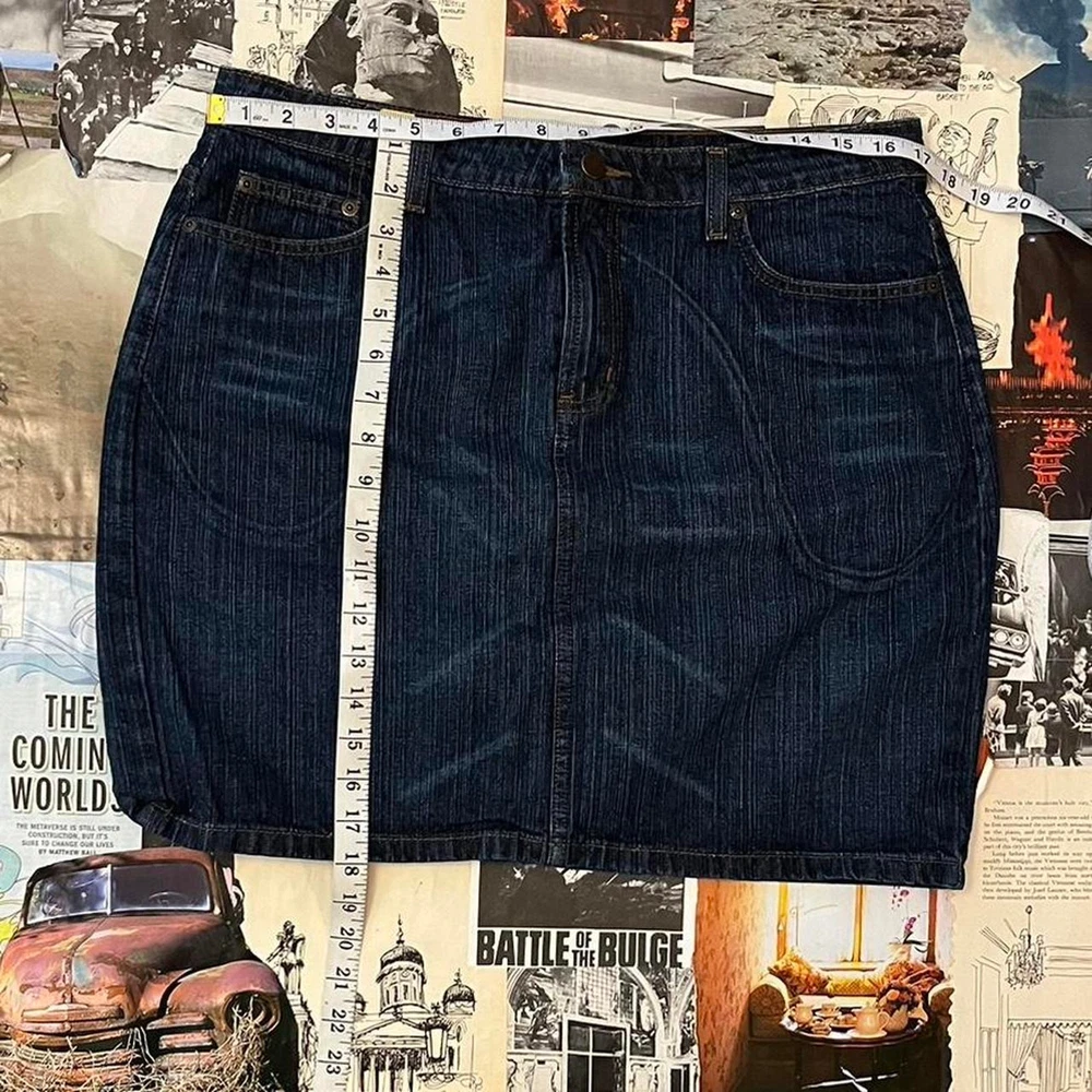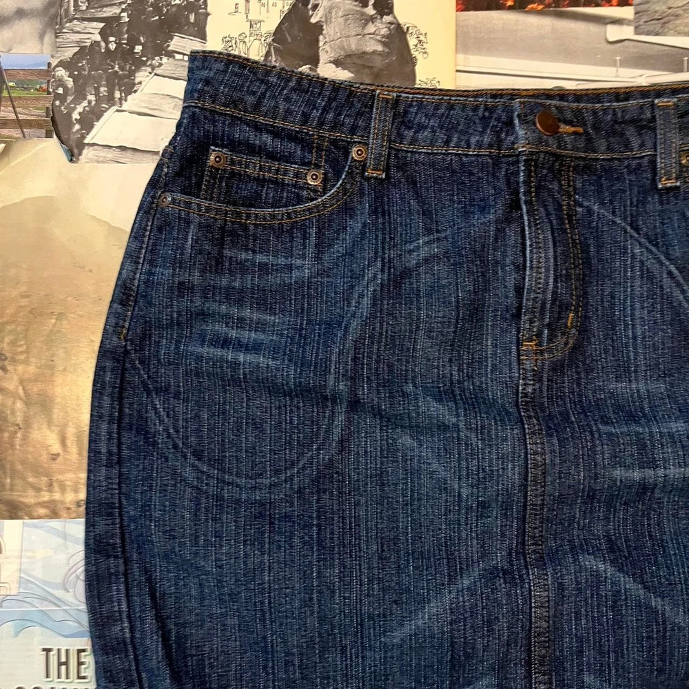 y2k denim mini skirt dark wash color cool 2000s style not stretchy and does not have a bunch of space in the hips y2k 2000s preppy trendy timeless old school fairy core cottage core cottagecore indie alt alternative emo grunge