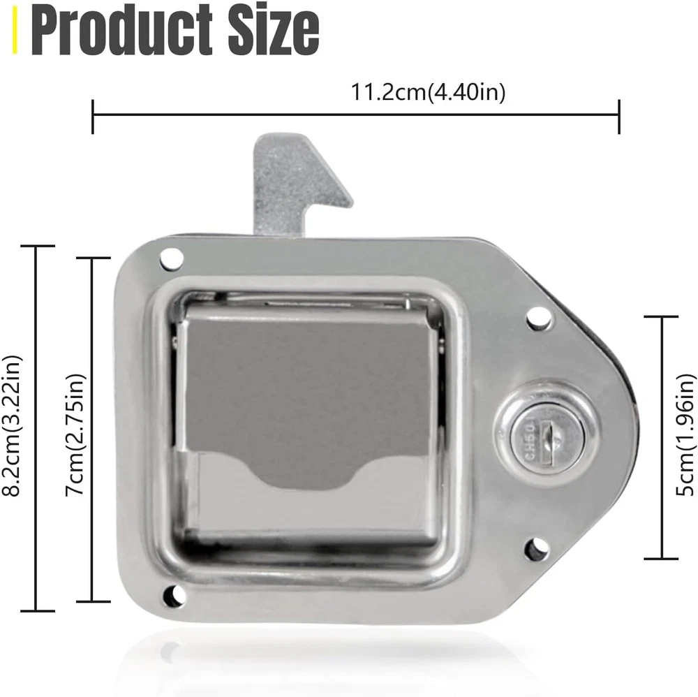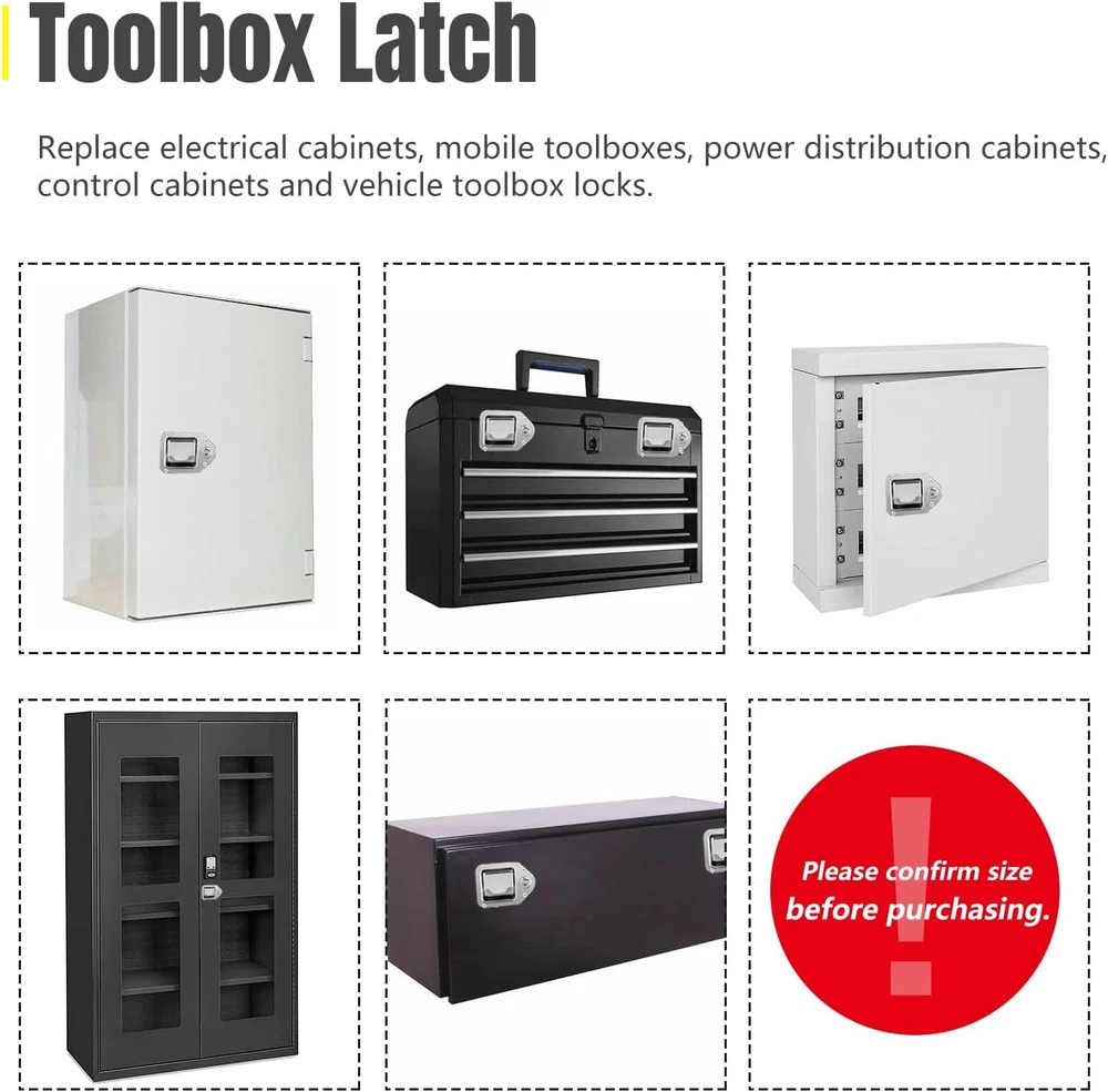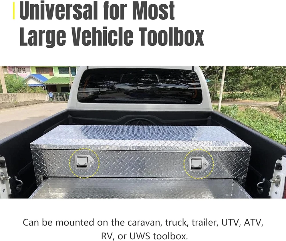 Store New Arrivals Add to Favorite View Feedback Contact YESHMA 2Pcs Truck Tool Box Latch Toolbox Paddle Lock Replacement Handle Stainless Steel with Keys & Rivets for Truck Trailer UTV ATV Toolbox Description Item model number 6d958c6d-51a2-4f57-b1bd-b0c02eedf8ad Style Modern Number of Pieces 2 Color Silver Included Components 2pcs tool box latches, 2pcs gaskets, 4pcs keys, 8 mounting rivets Brand YESHMA Material Stainless Steel, Rubber Control Method App Batteries Required? No Item Weight 1.28 pounds Size 2 Pieces Lock Type Key Lock Recommended Uses For Product Securing and accessing tool boxes in trucks, trailers, UTVs, ATVs, and electrical cabinets Batteries Included? No Special Features Waterproof Manufacturer YESHMA Special Feature Waterproof Package Dimensions 4.8 x 4.57 x 4.49 inches Controller Type Hand Control [WIDE APPLICATIONS] Truck toolbox locks replace electrical cabinets, mobile toolboxes, power distribution cabinets, control cabinets and vehicle toolbox locks. Can be mounted on caravan, truck, trailer, UTV, ATV, UWS toolbox. [High Quality] The truck toolbox lock is made of high-quality 304 stainless steel, which is waterproof and rust-proof, strong and durable to keep your items safe in transit. [Safety and sealing] The keyhole will automatically close to achieve the function of waterproof and dustproof. Features a rubber seal to keep moisture out of the toolbox, ensuring your tools stay dry and rust-free. [Easy to install and use] Equipped with blind rivets, it can be bent and fixed directly. Install and easily replace old latches in minutes. After unlocking, it can be opened by gently pulling it. [Note] Universal to replace most truck tool box locks, but please confirm size before purchasing. If there is any quality problem with the product, please contact us to solve it. Product Description YESHMA 2Pcs Truck Tool Box Latch Toolbox Paddle Lock Replacement Handle Stainless Steel with Keys & Rivets Overall size: 4.4" x 3.22". Use as Toolbox Latch: Replace electrical cabinets, mobile toolboxes, power distribution cabinets, control cabinets and vehicle toolbox locks. Package Includes: 2pcs tool box latches, 2pcs gaskets, 4pcs keys, 8 mounting rivets. Note: Please confirm size before purchasing Keys & Keyholes-Auto close Mounting rivets & Reserved Holes-Easy to install Sponge Gaskets-Keeps tools dry and rust free Handle & Deadbolt-Safe and smooth 304 Stainless Steel-Sturdy and durable Replace Toolbox Lock-Universal for the right size ABOUT US We offer the best prices around on high quality products. Our E-store includes media such as books, movies, music and games while offering electronics, toys, sporting apparel, clothing, tools, general home, garden items and more. SHIPPING We are always working hard to ensure your package arrives as soon as possible. Please understand that some factors like weather, high postal traffic, and the performance of shipping companies are outside of our control. We offer free shipping to the lower 48 states and ship within 2 business days of payment, usually sooner. We do not accept P.O. Boxes. Please provide a physical address. RETURNS We offer a 30-Day Return Policy on items which you are not completely satisfied with. You have the option for a full-refund or an exchange of the item. No returns are available on items shipped outside of the USA. PAYMENT We accept PayPal. CONTACT US This page content is yet to come Please ad us to your favorite seller and visit again later Thank You CUSTOMER SATISFACTION We try our very best to make sure every customer is completely satisfied. If there's a problem, message us! We're happy to help.