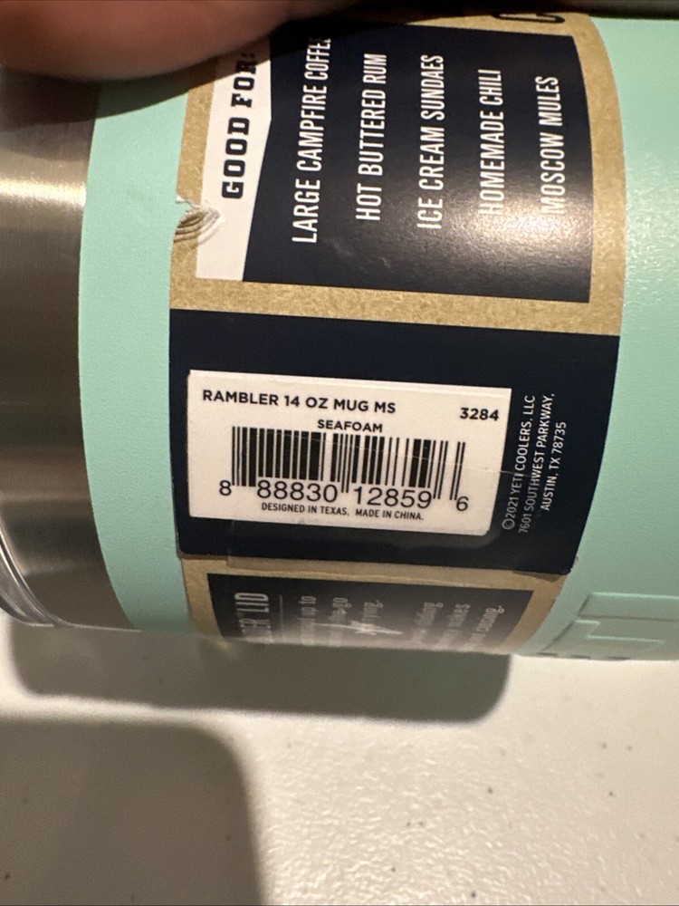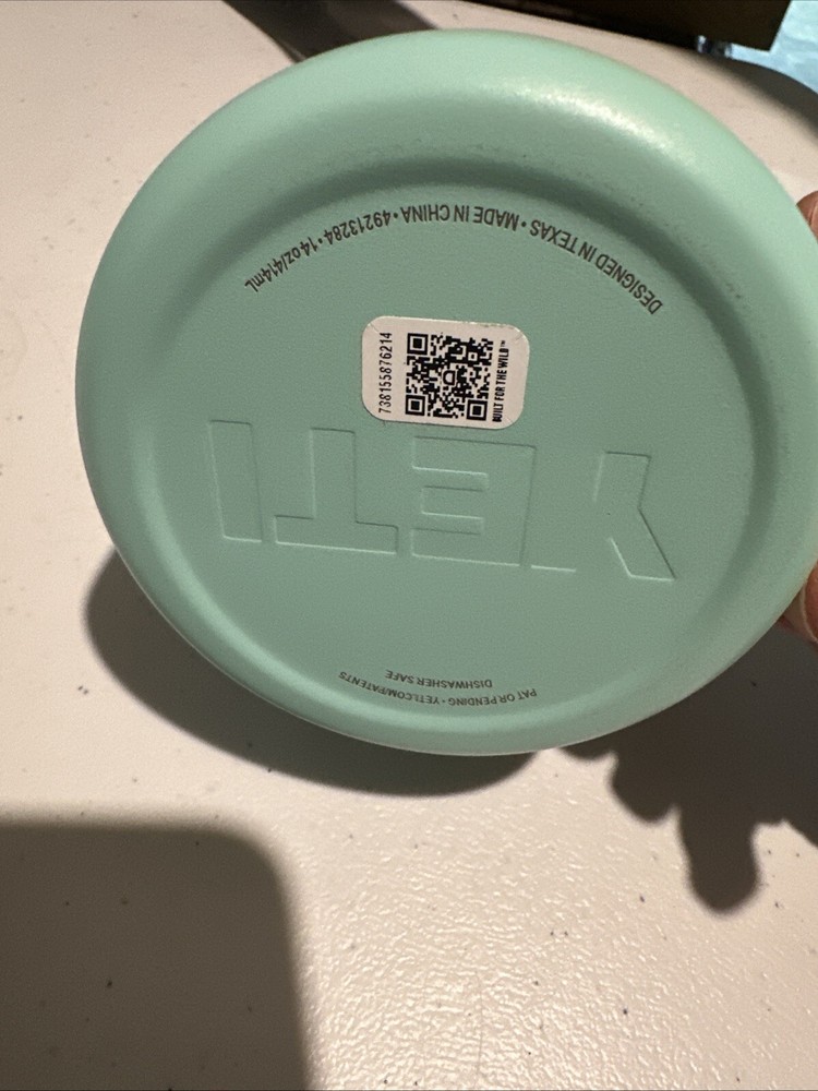 Keep your drinks hot or cold with the YETI Rambler 14 oz Stainless Steel Mug. This round mug features a drink-through lid and a matte sea foam finish. It is perfect for all occasions and has a capacity of 14 oz. The mug is made of stainless steel and is double-walled, making it insulated and dishwasher safe. It also comes with a handle for easy grip. The YETI Rambler line is known for its quality and this mug is no exception. Get yours today! New, never used and includes all the normal stuff inside that you’d get when new.