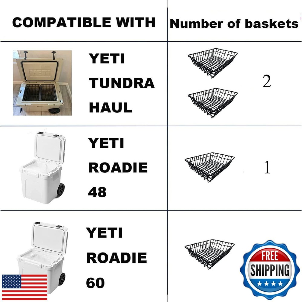Cooler Basket for YETI Tundra Haul, YETI Roadie 48, YETI Roadie 60,Compatible with Other lgloo Accessories Cooler Locks, Cooler Dividers, Ice etc,Cooler Basket Keeps Food Dry. (1-Pack) Features The Cooler Basket is made of strong wire,tight grid,so tight that no water collects, so the food stays dry inside the Cooler Basket. The tight design makes the items inside the Cooler Basket son not easy to fall to the bottom, and the cool air can be circulated from bottom to top without being blocked. Compared with those completely sealed trays, the design of this Cooler Basket son is more reasonable and scientific. The YETI Haul wheeled cooler can hold two Cooler Basket at the same time, the YETI Roadie 48, and the YETI Roadie 60 wheeled cooler is suitable for only one Cooler Basket.Note: Please select the number of baskets you need at the time of purchase, 1-pack or 2-pack. The outside of the Basket is coated with polyethylene, which makes it strong enough to withstand impact. Compared to fragile plastic trays, it is less likely to break and more durable. It is one of the essential accessories for camping. Item Dimensions LxWxH: 13.25 x 10 x 3.13 inches. Cooler not included with purchase. Shipping Free & Fast Shipping: We offer free shipping to most of the USA with a normal delivery time of 3-7 days. However, due to the current situation, additional delivery time (up to 3 weeks) may be required for some items. Alternative Carriers: We may use alternative carriers (e.g., USPS, FedEx, UPS) to ensure your package arrives safely and on time. Due to the use of multiple carriers, we are unable to provide a tracking number automatically. Handling Time: Orders are processed and shipped within 1-2 business days of receiving cleared payment. Shipping Restrictions: Shipping to Alaska, Hawaii, Puerto Rico, Guam, and other US territories may incur shipping charges or delivery restrictions. Please contact us before ordering, or your order can be refunded/cancelled. State Restrictions: Certain items may not be shipped to California due to state regulations. Contact for Tracking Updates: If you require tracking updates or have any concerns about the delivery of your order, please feel free to contact us, and we will be happy to assist you. Return Policy 30-Day Hassle-Free Returns: If you are not completely satisfied with your purchase, you can return the item for free within 30 days of receiving it for a full refund or exchange. Easy Return Process: Contact us, and we will provide you with a prepaid return shipping label and detailed instructions. No Restocking Fee: There are no restocking fees for returns. However, the buyer is responsible for return shipping costs if the return is not due to a seller's error. Refund Processing: Refunds will be processed within 1 business day of receiving the returned item in its original condition. Payment We accept all major credit cards, PayPal, and Apple Pay for your convenience. Your payment information is secure and encrypted to ensure a safe and seamless transaction. Please complete your payment within 3 days of purchase to avoid any delays in shipping. Feedback Your feedback is extremely important to us. We strive to provide the best products and customer service possible. If you are satisfied with your purchase, please take a moment to leave us a positive review. If you have any concerns or issues with your order, please contact us before leaving negative feedback. We are committed to resolving any problems and ensuring your satisfaction. Contact Us If you have any questions or concerns, please feel free to reach out to our customer support team. You can contact us through the eBay messaging system. We are available Monday to Friday, 9:00 am to 5:00 pm EST, and we will do our best to respond to your inquiry within 24 hours. Thank you for supporting our small family business!