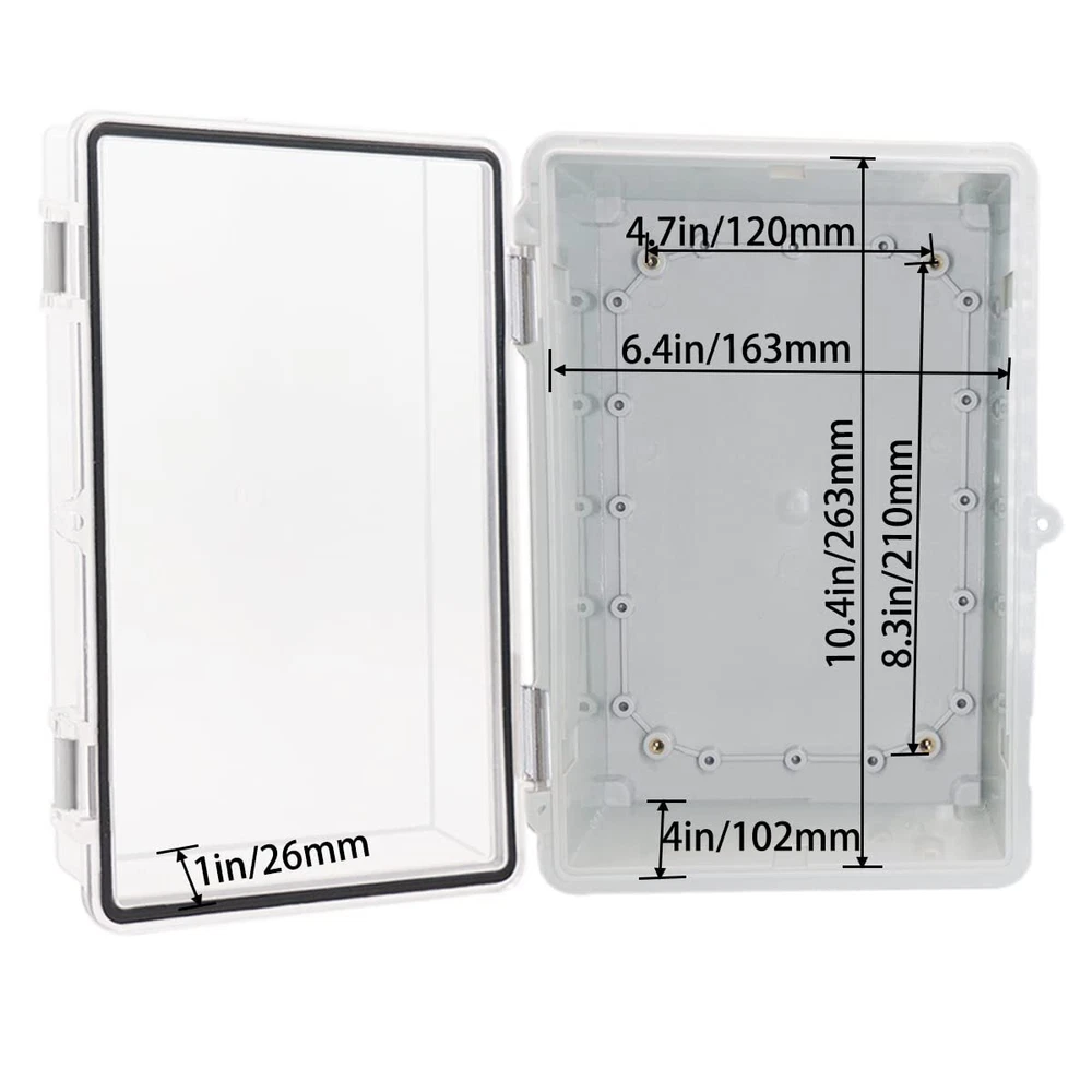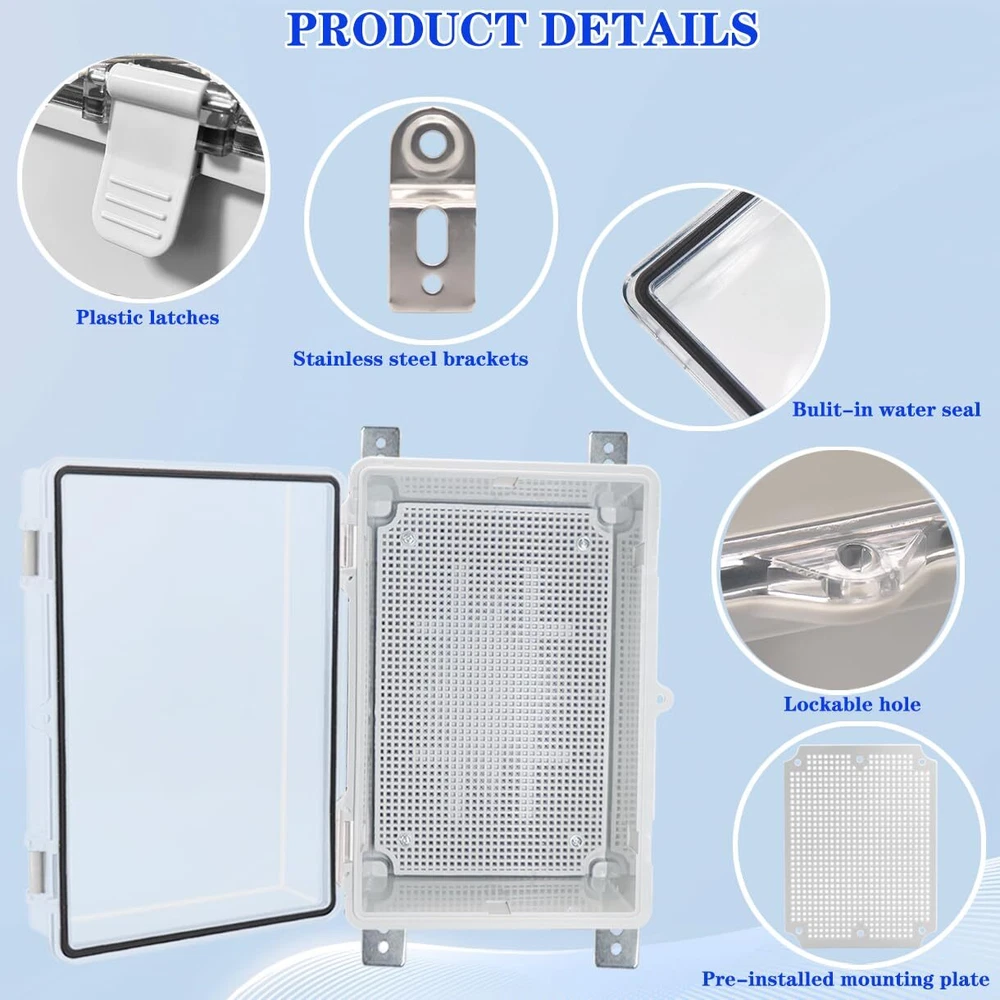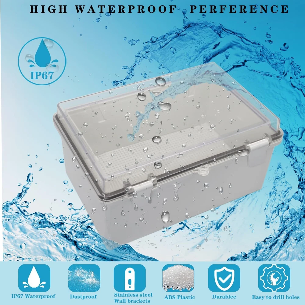 Exclusive Offers Await! Welcome to our stores! We promise you'll be satisfied. YETLEBOX Outdoor Waterproof Electrical Box Junction Box Weatherproof IP67 ABS Plastic Enclosure Switch Router Project Box with Mounting Plate with Wall Bracket 2 Cable Glands Clear 11.4"x7.5"x5.5" Item Details PACKAGE - 1 x Weatherproof Junction Box, 1 x Mounting Plate, 2 x 1/2" NPT Cable Glands, 4 Stainless Steel wall brackets. Product Features PACKAGE - 1 x Weatherproof Junction Box, 1 x Mounting Plate, 2 x 1/2" NPT Cable Glands, 4 Stainless Steel wall brackets. IP67 GRADE - IP67 waterproof grade, which means dust-tight and protected from moisture challenges up to jetting water, keep all your electrical equipment Safe & Dry. It is widely used for both indoor and outdoor applications or projects. EASY FOR DIY - Simple hinged cover, easy open and close, This sturdy box can be drilled and shaped easily without cracking, so it’s also suitable for your various DIY projects.safety lockable design to prevent un-authorized openings DURABLE for YEARS - Made of high quality ABS plastic which has longer serve time and superior in impact resistance. Durable junction box can offer well protection for your projects in outdoor. SIZE - Outer Size of electrical enclosure: 11.4"x7.5"x5.5" 290x190x140mm Payment Information ⦿ All payments are handled securely through eBay. ⦿ We accept PayPal and all major credit cards. ⦿ Payment must be completed immediately after purchase. ⦿ If there are any issues with the payment, please contact our support team for assistance. Shipping Details ⦿ We only ship to the address provided at checkout. Please verify your address before completing your purchase. ⦿ Orders are processed within 1 business day (excluding weekends and holidays). ⦿ Delivery usually takes 3-5 business days. ⦿ We use trusted shipping services such as UPS, FedEx, and USPS. ⦿ Shipping is available only within the contiguous United States. We do not ship to Alaska, Hawaii, Puerto Rico, or PO Boxes. ⦿ If there are any shipping delays, please contact us for support. Return Policy ⦿ We offer a 30-day return policy for your peace of mind. ⦿ If you are not satisfied with your purchase, you can return it within 30 days for a full refund. ⦿ Please contact us to obtain the return address before sending back any items. ⦿ Returns must be in their original condition and packaging.