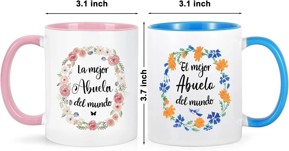 YHRJWN Coffee Mugs, Set of 2 - La Mejor Abuela Abuelo, Best Grandma Two Tone Product Details Brand: YHRJWN Color: Two Tone Special Feature: Heat Resistant Style: Elegant Theme: Christmas Recommended Uses For Product: Home Occasion: Grandparents Day Included Components: Handle Specific Uses For Product: Hot Drinks Shape: Round Pattern: Text Product Care Instructions: Dishwasher Safe Age Range (Description): Adult Material Feature: Ceramic Reusability: Reusable Unit Count: 2.0 Count Product Dimensions: 3.1"W x 3.1"H Number of Items: 2 Embellishment: Letter Print Package Type: Standard Packaging Finish Type: Glossy Manufacturer: YHRJWN Item Weight: 1.74 pounds MaterialCapacity: Porcelain11 ounces BEST GIFT FOR GRANDPARENTS: These grandpa and grandma mugs can be gifted to Spanish-speaking grandparents on Christmas, Mother's Day, Father's Day, Anniversary, Thanksgiving or birthday. These elegant coffee mugs let your grandparents know how much they mean to you. After receiving this warm coffee mug, abuelos abuelas will fall in love with these cups. HIGH QUALITY: These abuela abuelo gifts in spanish are made of high quality ceramic with heat resistance and durability. It can not only hold hot drinks such as hot cocoa, coffee and tea, but also cold drinks such as milk and juice. The coffee mugs can be used for a long time. REASONABLE DESIGN: The surfaces and mouths of these abuela abuelo coffee mugs are very smooth and will not easily hurt grandparents' mouth. The grandma and grandpa gifts have C-shaped handles, which are easy to hold while using. The double-sided print makes this coffee cup look more prefect, whether grandma and grandpa use it with their left hand or right hand. HD PRINT: Our Christmas gifts for grandparents use HD printing technology to ensure that the color of the printed pattern will not disappear easily. The print pattern of "La Mejor Abuela Del Mundo" and "El Mejor Abuelo Del Mundo" are very clear and these patterns make grandparents feel very warm after seeing. MICROWAVE & DISHWASHER SAFE: These grandparents gifts in Spanish can be heated in the microwave and washed in the dishwasher. If your grandparents want to drink a cup of hot coffee or tea, they can put the coffee cup in the microwave. If your grandparents feel that washing the cup by hand is a waste of time, then they can put the cup in the dishwasher for a quick wash. A gift of love from granddaughter and grandson to their grandparents. These la mejor abuela abuelo coffee cups are pretty gifts for your grandparents on Christmas, Mother's Day, Father's Day, Thanksgiving and birthdays. If you give these exquisite mugs to your Spanish-speaking grandparents, you will become their favorite grandchild. Grandma and Grandpa Coffee Mug Feature This gift for grandparents from granddaughter can be used in various occasions, such as home, office, party, etc. It can hold a variety of grandparents' favorite coffee, tea or other beverage. The great grandparents gifts can be easily cleaned after use. It will save grandparents time and make them enjoy breakfast time. The bottom of the coffee cup is non-slip, which prevents the cup from being easily tipped or dropped. The capacity of grandparents day gifts is 11 ounces. This suitable volume can satisfy the grandparents' need for a cup of coffee or milk in the morning. Grandparents Coffee Mug Specification Color: Two Tone (White & Pink/Blue) Capacity: 11 Oz Material: Premium Ceramic Warm Notice They are dishwasher and microwave safe. Package Include 1 x La Mejor Abuela Del Mundo Mug 1 x El Mejor Abuelo Del Mundo Mug