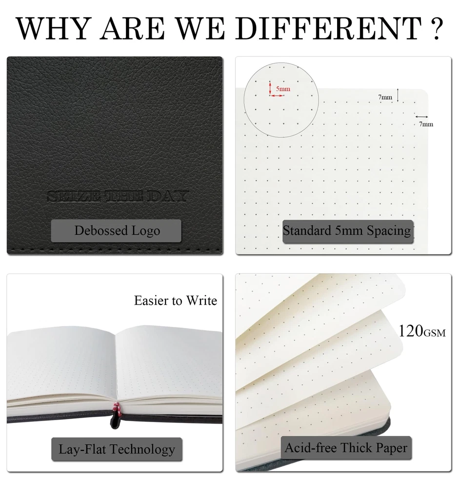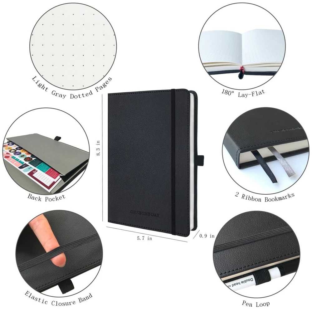【Bullet Dotted Journal Set with Abundant Accessories】All-in-one planner notebook set with 1 A5 hardcover bullet dotted journal notebook, 12 dual tip colored pens, 8 planner sticker sheets, 4 reusable journal stencil sheets, 5 washi tapes, 2 stencil rulers, 1 gift card, 1 gift box. With this ultimate journaling set, you can design the journal of your dreams in no time! 【Premium 120GSM Thick Paper Dot Journal Notebook】This A5 journal (5.7in*8.3in*0.9in) features a vegan leather cover, 200 pages, 120GSM acid-free thick off-white paper, NO BLEED. Each page contains 925 dotted grids with X25 * Y37 dots, 5mm spacing and medium visibility. The lay-flat design is comfortable for writing and drawing, with round corners, pen holder, elastic band, 2 ribbon bookmarks and expandable inner pocket for storing important things. 【12 Dual Tip Colored Pens】These 12 dual tip colored pens are water-based and non-toxic, safe for kids. Dual tip design will add more journaling fun, the 0.4 mm fine tip for precise highlighting and details, and the flexible 1 - 2 mm brush tip for easy coloring and blending. Easy-to-hold and write smoothly, work very well, perfect for bujo journal writing and drawing. 【Amazing Stencils, Stickers and Washi Tapes】This dot journal kit contains a variety of journaling supplies, incl. 8 planner sticker sheets, 4 durable journal stencil sheets, 2 practical stencil rulers and 5 decorative washi tapes. They are especially designed to help you quickly layout your pages, and easily make your journal pages into beautiful yet functional layouts, great for daily organizing and journaling. 【Versatile Use】This dotted journal starter kit is thoughtfully designed with love and care, perfect for beginners and journal lovers. You can use these journal kits to organize your daily to-dos, track your habits, plan your goals, and express your creativity! Moreover, the bullet dotted journal kit with gift box and gift card would be a great gift for your family and friends.