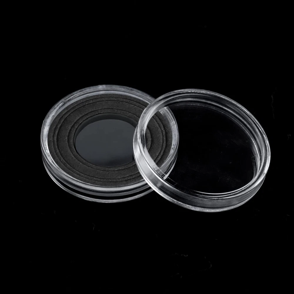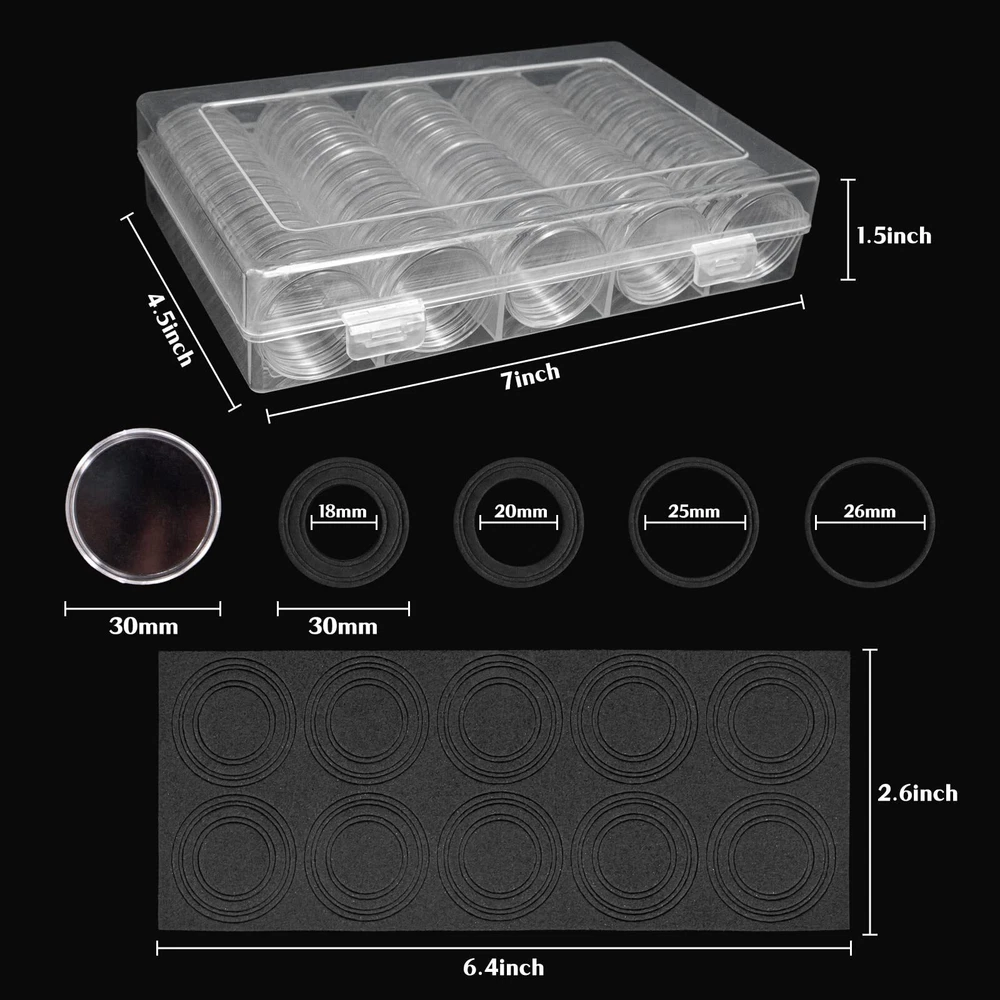 100 Pack 30mm Clear Round Coin Capsules with 5 Sizes Protect Gasket The coin storage box contains 100pcs 30mm round coin boxes , a transparent plastic storage box, 100 pack black EVA foam gaskets ,which is very suitable for storing, protecting and displaying coins. 30mm clear round coin capsule with internal dimensions of 30 x 3 mm and external dimensions of 33 x 5.5 mm; 5 sizes of EVA foam gasket can hold the most popular coins, 17/20/25/27/30mm, easily separate the foam ring from the EVA foam pad according to the size of the coin, prevent the coin from sliding and scratching. The outer edge of each coin round box has a crescent-shaped opening, which is easier to open, has good sealing, and is not easy to fall off, which can protect the coins more safely. Note: The product may have raised burrs during the production process, which are not quality problems, you can use sandpaper to lightly polish them to solve them