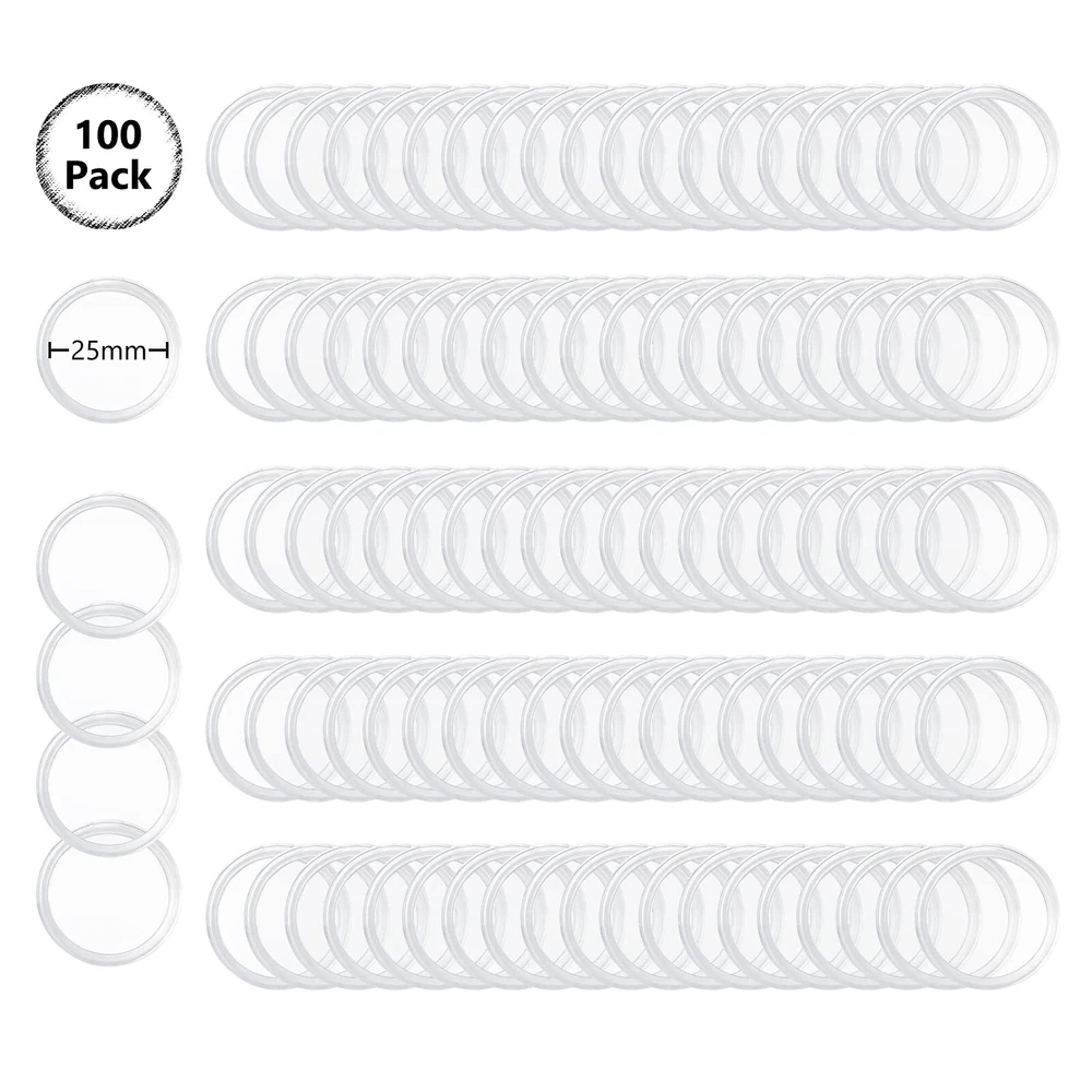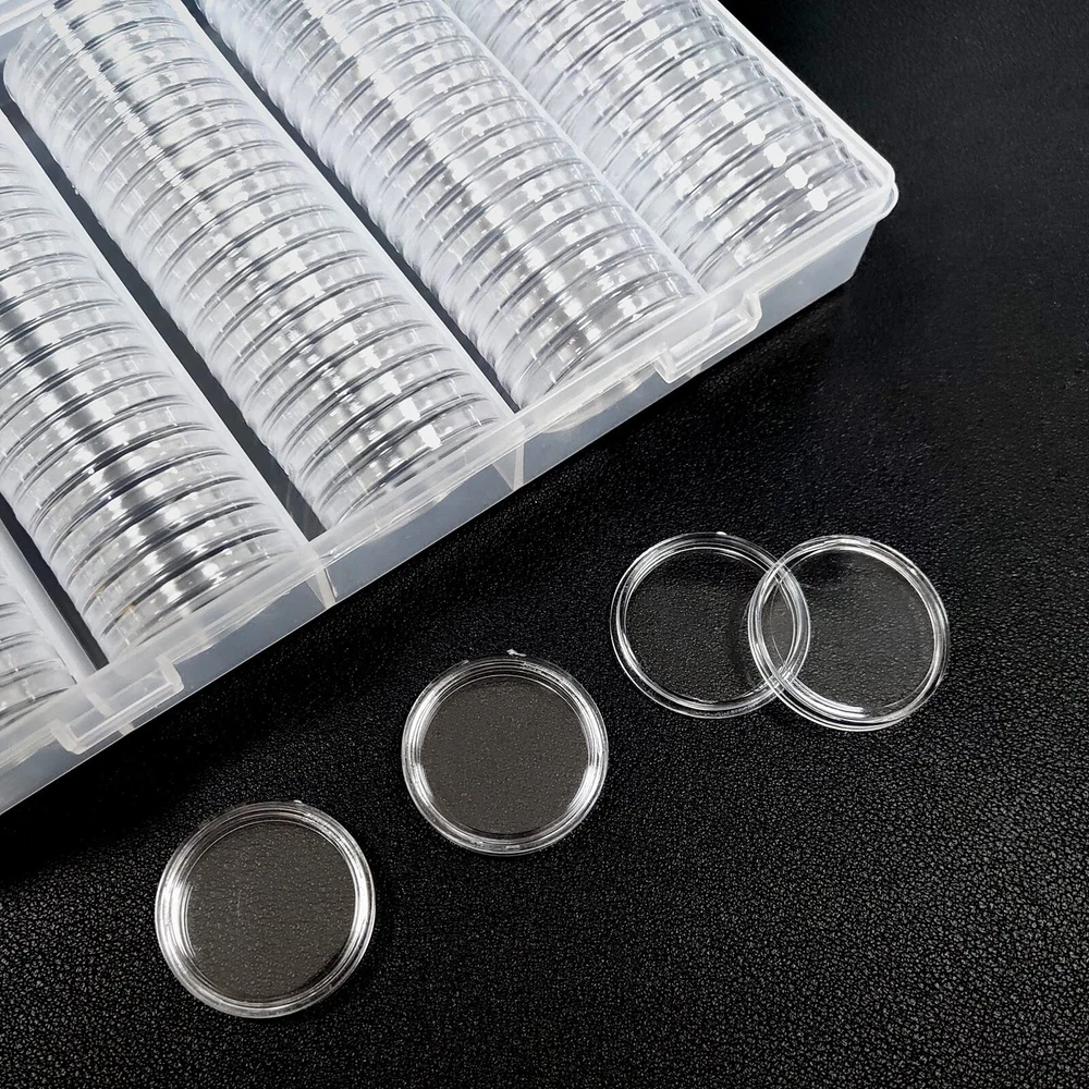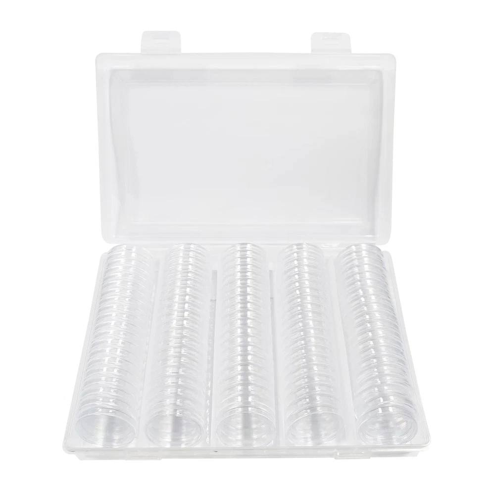 Specification: Material: Plastic Coin box size: 25mm Plastic storage box size: 16.7 * 10.5 * 3.5 cm Color: transparent The package includes: 100 * coin box 1 * plastic storage box The coin storage box contains 100pcs 25mm round coin boxes, a transparent plastic storage box, which is very suitable for storing, protecting and displaying coins. Made of high-quality plastic, high transparency, smooth surface, you can see the coins inside, and can effectively protect the coins from dust and oxidation. The outer edge of each coin round box has a crescent-shaped opening, which is easier to open, has good sealing, and is not easy to fall off, which can protect the coins more safely. The storage box size is: 16.7*10.5*3.5cm. The size of each coin box is 25mm. Note that half dollar and dollar coins cannot be placed.