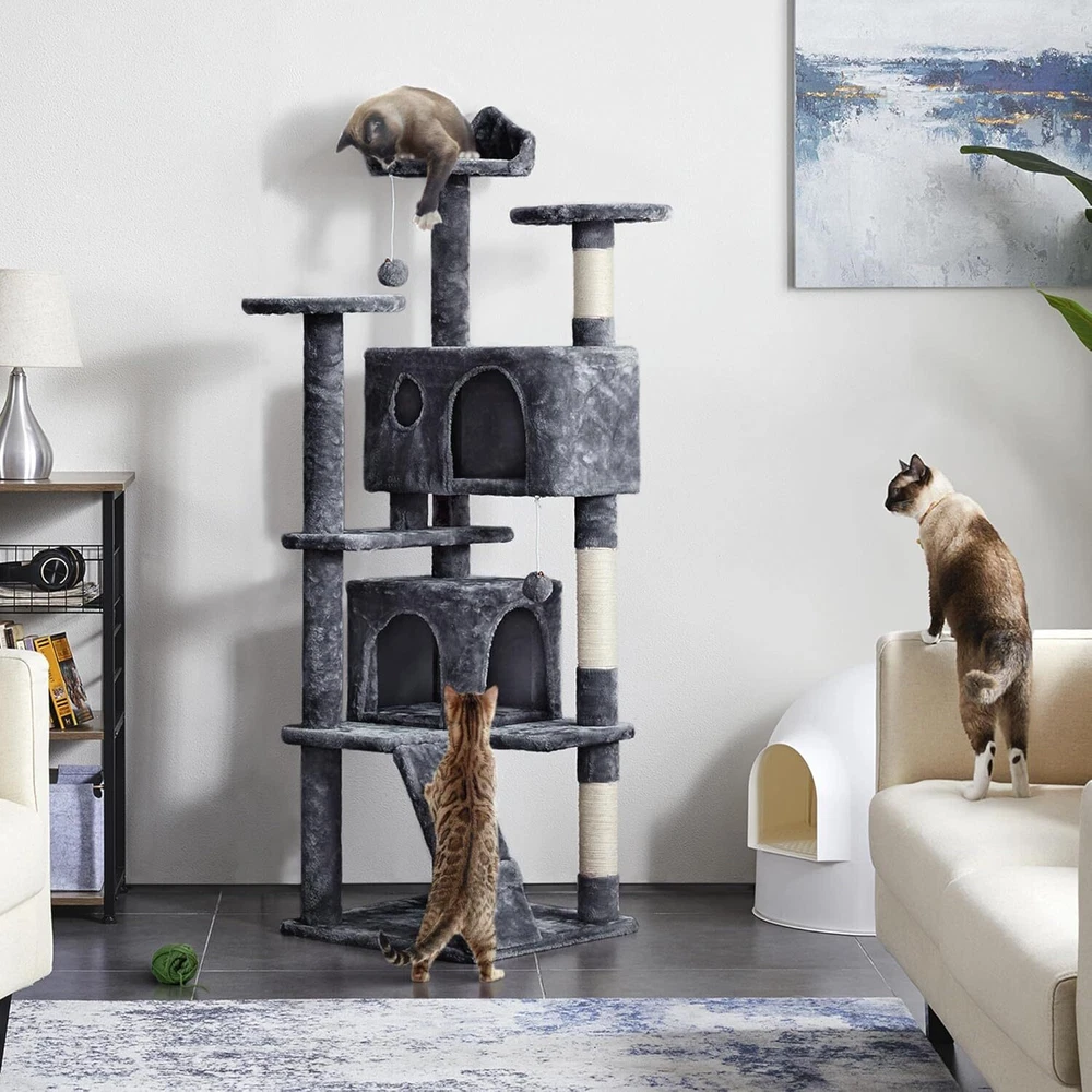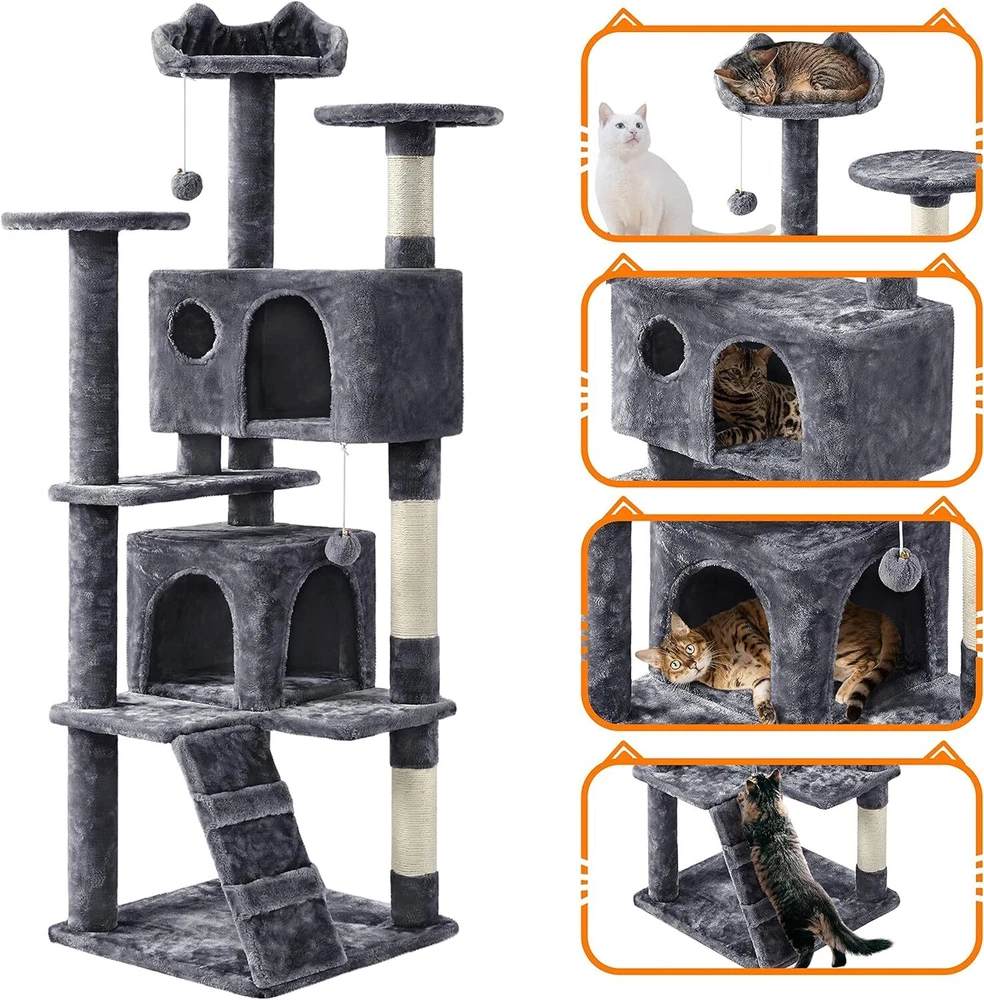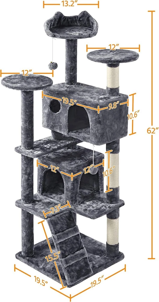 Target Species Cat Product Dimensions 19.5"L x 19.5"W x 62"H Breed Recommendation All Breed Sizes Specific Uses For Product Entertainment, Climbing Recommended Uses For Product Indoor About this item MULTILEVEL CAT HOUSE: This multiple-level cat tree has multiple tiers and structures for cats to play and sleep. It is suitable for around three small cats or two normally-sized cats but not suitable for large-sized cats. No matter it is for fun or rest, this cat tower is an ideal choice PET-FRIENDLY MATERIALS: Made of CARB P2-compliant manufactured wood, covered by skin-friendly plush, and connected by metal accessories, our cat tower is designed to bring a safe and stable entertaining center for your little angels VERSATILE CONDO FOR CATS: This plush cat tree has three perches(including two round platforms and one perch with the cat-ear-shaped edge), a ladder, two condos with doors, and several scratchers. Plenty of interesting layouts will satisfy cats’ needs for relaxing and resting STABLE AND SAFE: Considering cats will jump and play on the cat stand, we double-secure this cat tree to avoid wobbling. For better stability, the anti-toppling strap is attached to the middle board, through which you can anchor the cat tree to the wall SCRATCHING POSTS: Cat scratchers can make cats satisfied and protect your furniture from their paws. Three posts covered by natural sisal ropes are perfect for scratching On Nov 11, 2024 at 23:50:34 PST, seller added the following information: