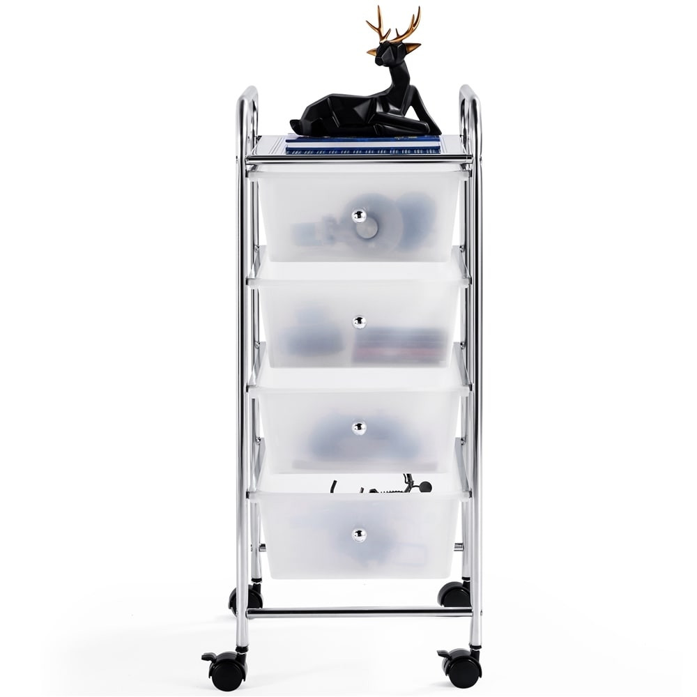 This 4-drawer storage trolley is provided with 4 wheels, 2 of which are lockable, ensuring both flexibility and stability. The design of the 4 vertically aligned drawers makes full use of limited space, meanwhile, allowing users to store different items separately. Besides, each of the drawers can be removed separately, therefore, you can use it as a simple storage box on your office desks or install it back after filling.Features:1. Space-intensive StructureThis storage cart is designed into 4 layers with a platform, which is a smart solution of making full use of limited space by expanding the space vertically. Besides, such structure also allows you to store different items separately.2. Round Iron HandlesWith 2 half-round iron handles on the 2 sides of the top platform together with 4 Free Shipping Over $49.99* Details Yaheetech Rolling Storage Trolley with 4 Drawers with Metal Frame Product Description: This 4-drawer storage trolley is provided with 4 wheels, 2 of which are lockable, ensuring both flexibility and stability. The design of the 4 vertically aligned drawers makes full use of limited space, meanwhile, allowing users to store different items separately. Besides, each of the drawers can be removed separately, therefore, you can use it as a simple storage box on your office desks or install it back after filling. Features: 1. Space-intensive StructureThis storage cart is designed into 4 layers with a platform, which is a smart solution of making full use of limited space by expanding the space vertically. Besides, such structure also allows you to store different items separately.2. Round Iron HandlesWith 2 half-round iron handles on the 2 sides of the top platform together with 4 castor wheels, users are allowed to push a cart full of papers by only 1 hand without any difficulty.3.Selected MaterialsThis storage bin organizer cart is made of chrome plated iron and PP, body-harmless, durable, lightweight and uneasy to oxidate. Specifications: Materialsiron, PP Layer Quantity; 4 Dimensions 13 x 14.5 x 30.5'' (L x W x H) Drawer (inner)12 x 9.1 x 4.5'' (L x W x H) Bearingeach drawer2 kg/ 4.4 lb; top platform7.5 kg/ 16.5 lb N.W.3 kg/ 6 lb G.W.4 kg/ 9 lb Note: 1. Please do not place or store items that exceed the max. weight capacity of this storage trolley. 2. Please allow slight errors due to manual measurement.